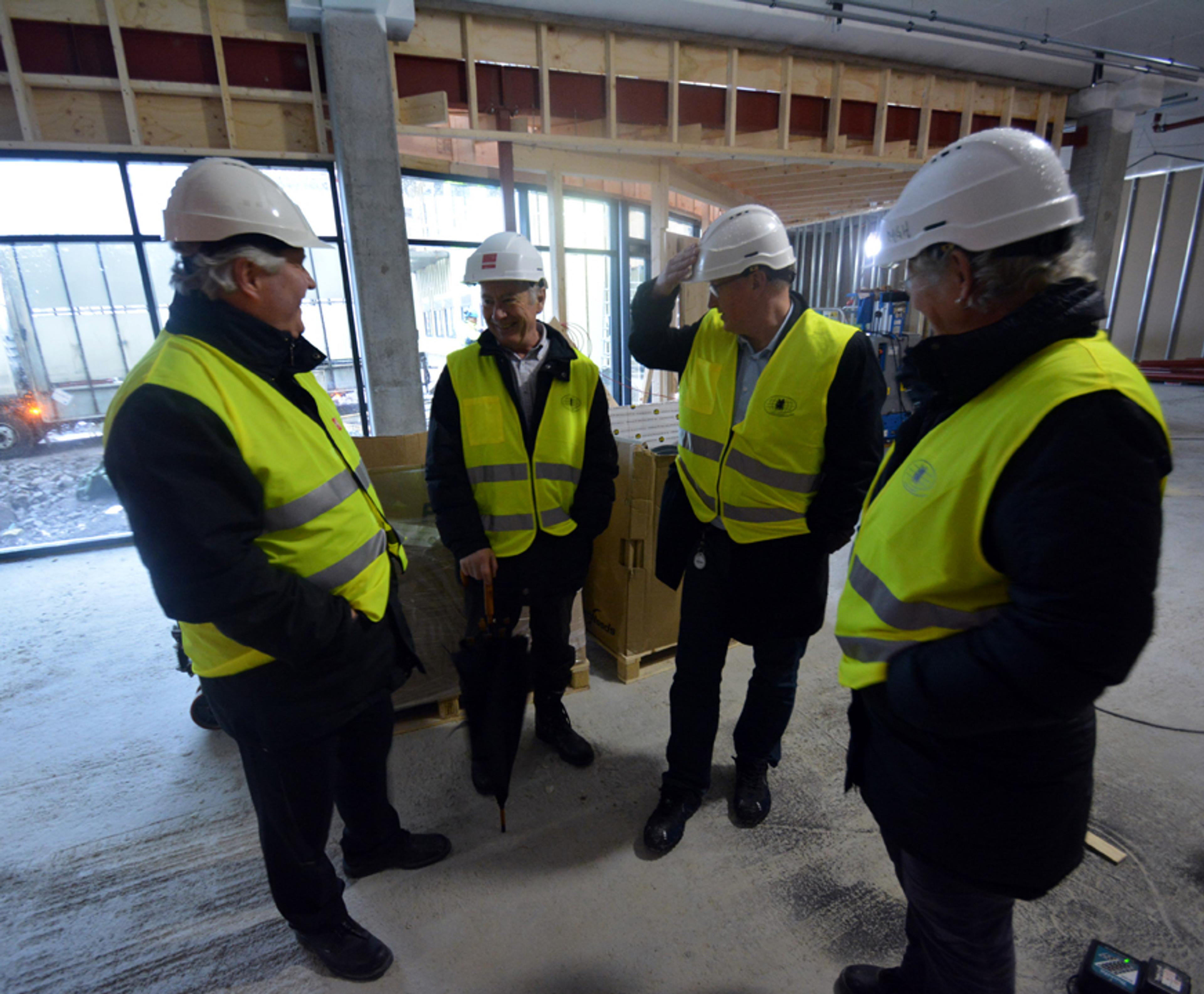Prosjektledelse i prat med ordfører, rådmann og kommunalsjef. De står i det som skulle ta form til å bli inngangspartiet på Re helsehus. Foto: Stian Ormestad, ReAvisa.