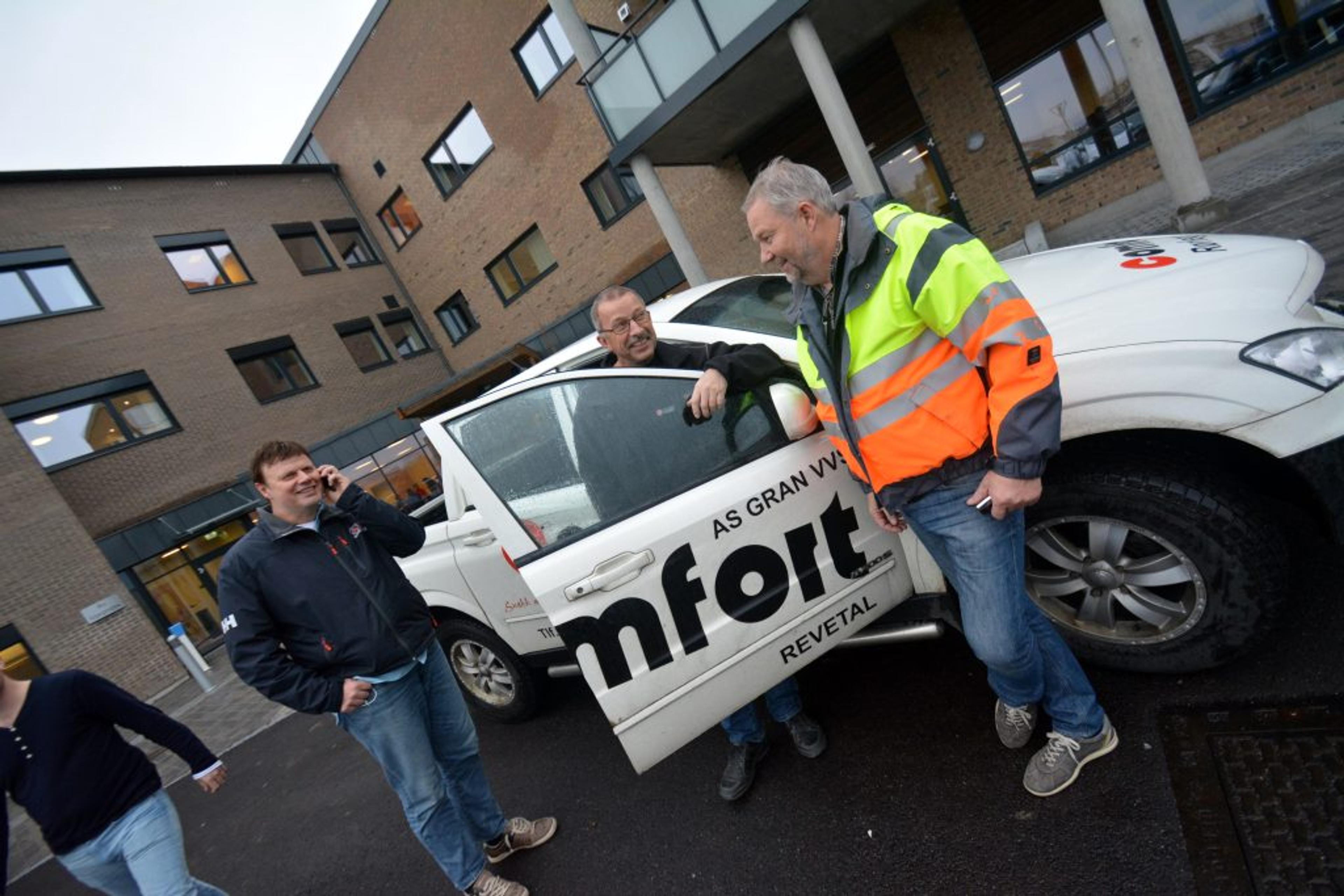 Stolte underentreprenører av det helt lokale slaget: Representanter for Alt installasjon og Gran VVS ser vi på bildet, tatt utafor Re helsehus rett før det skal flyttes inn i. Foto: Stian Ormestad, ReAvisa.