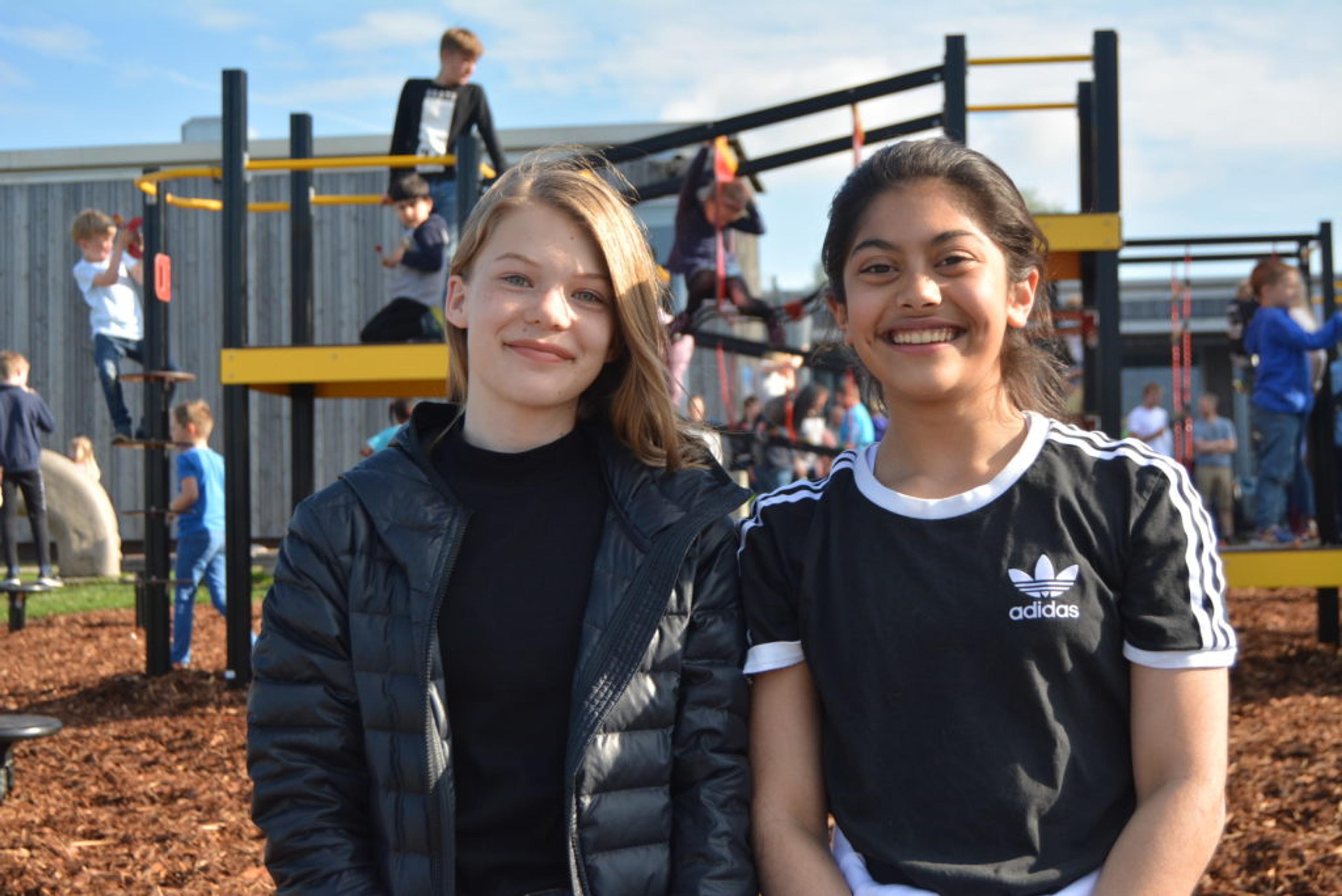 SNOR-KLIPPERE: Elevrådslederne Amalie Bu Skjeggestad (13) og Emma Sandnes (13) åpna den nye hinderløypa. Foto: Amalie Andersen.