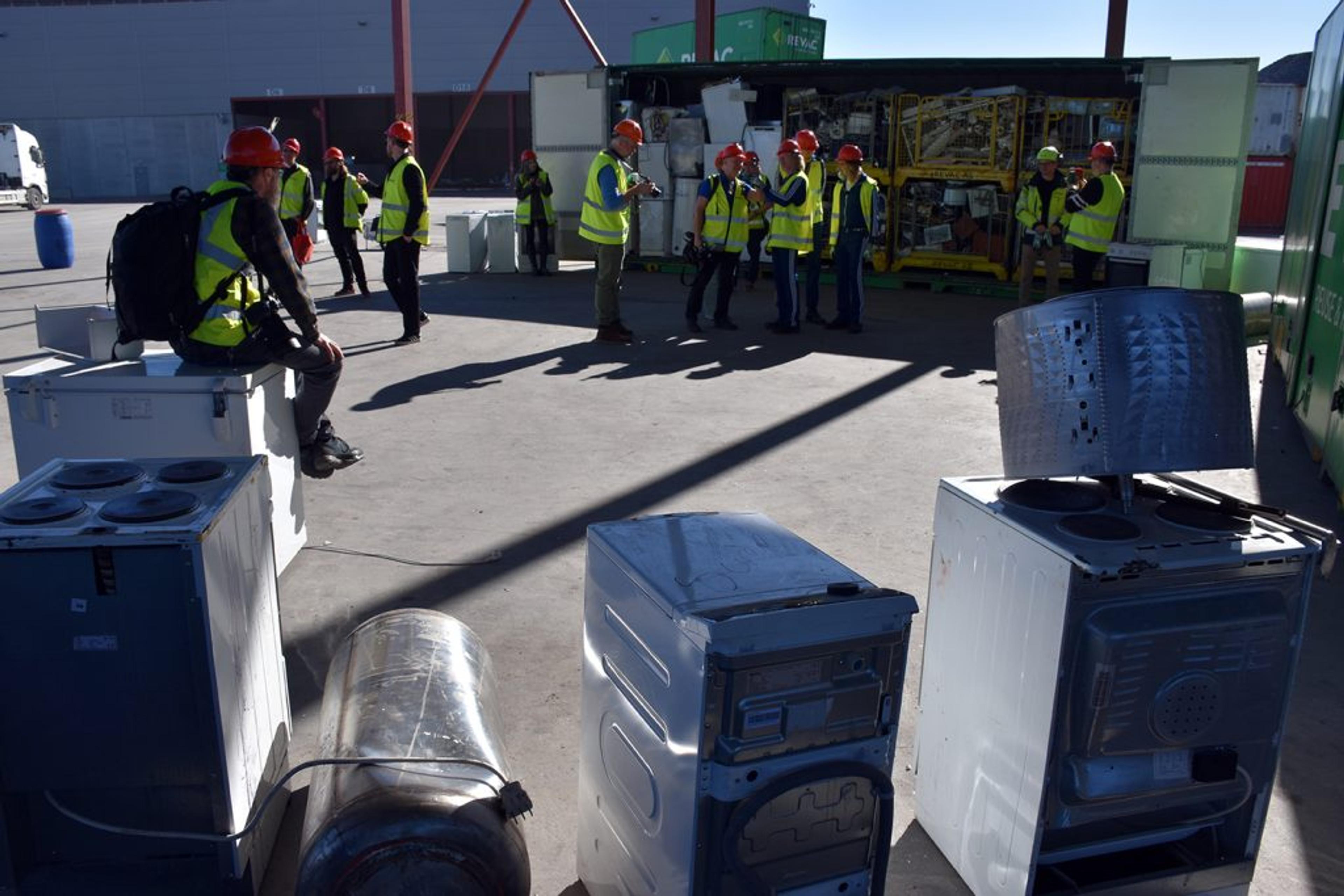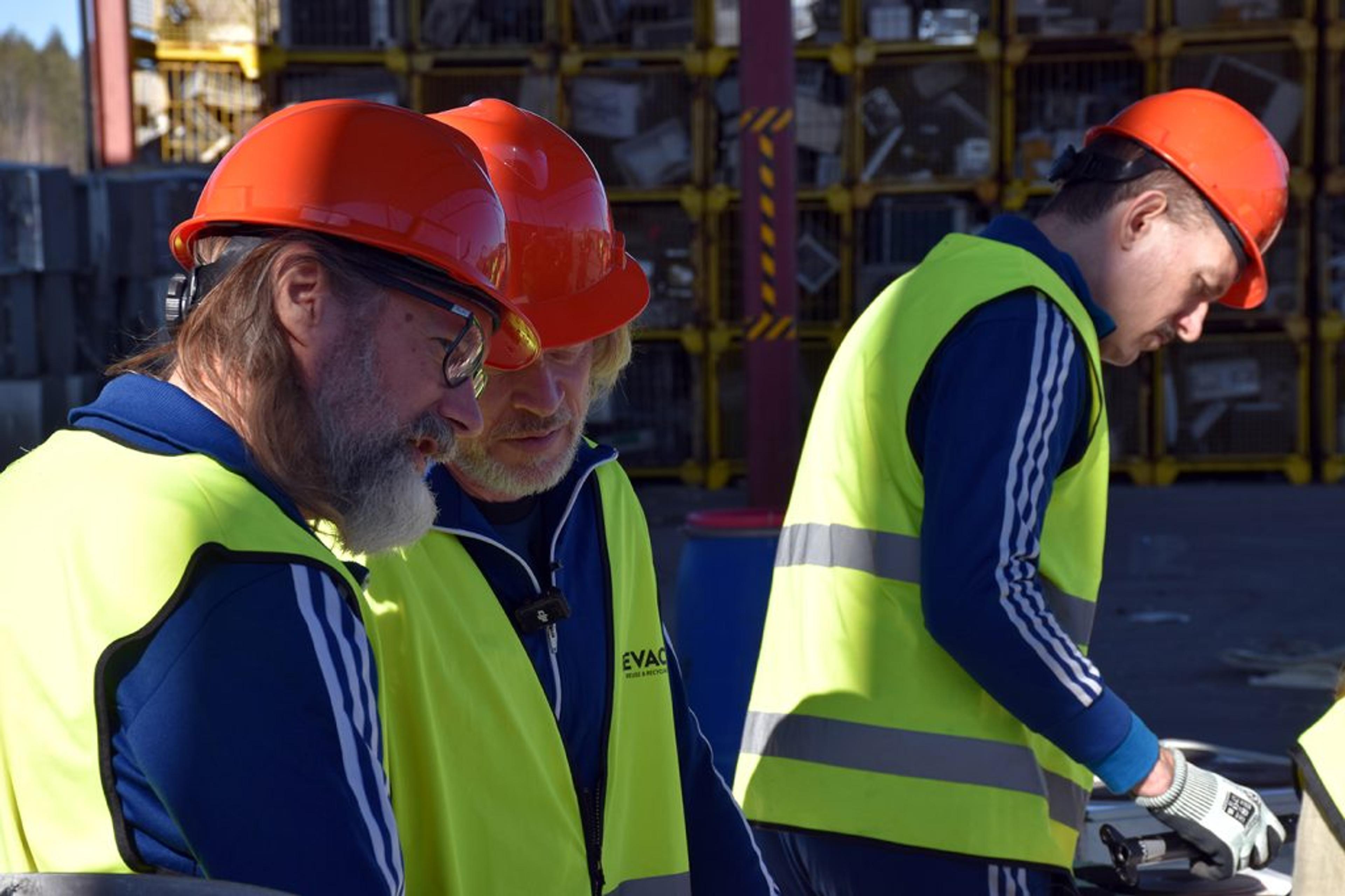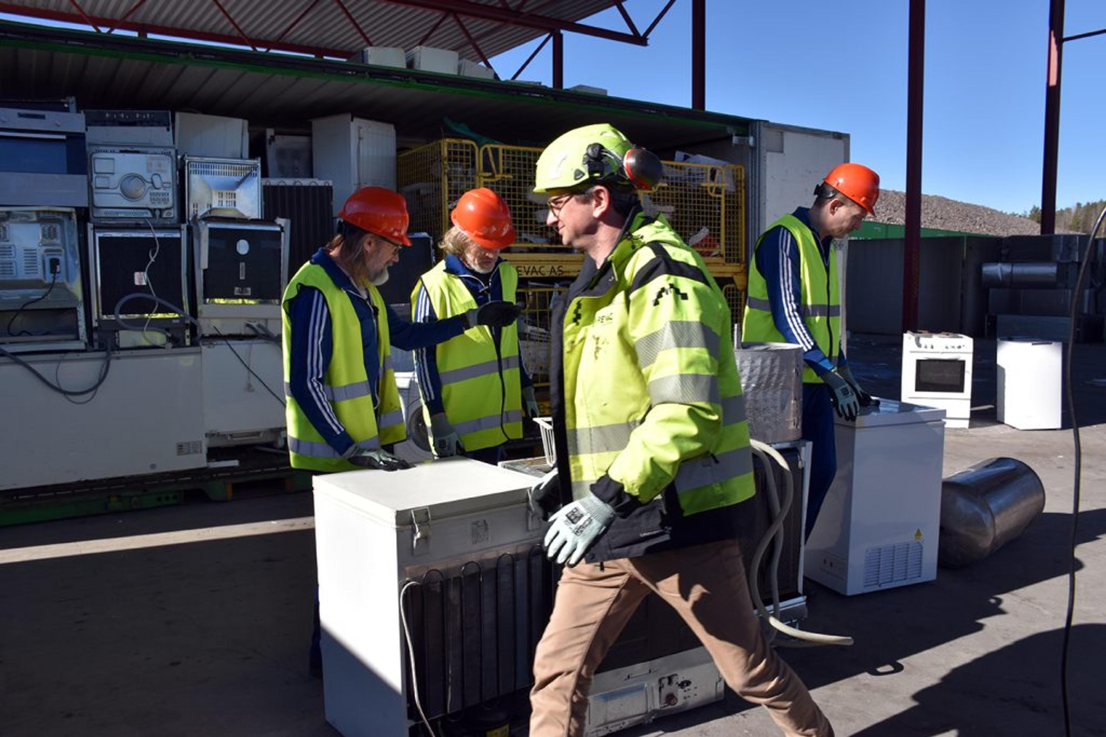 PÅ HVITEVARE-JAKT: Egil Hegerberg, Aslag Guttormsgaard og Kristopher Schau tar et titt inni nok en Revac-konteiner. De forteller til ReAvisa at de er fornøyd med utbyttet av Re-besøket. Foto: Stian Ormestad, ReAvisa.