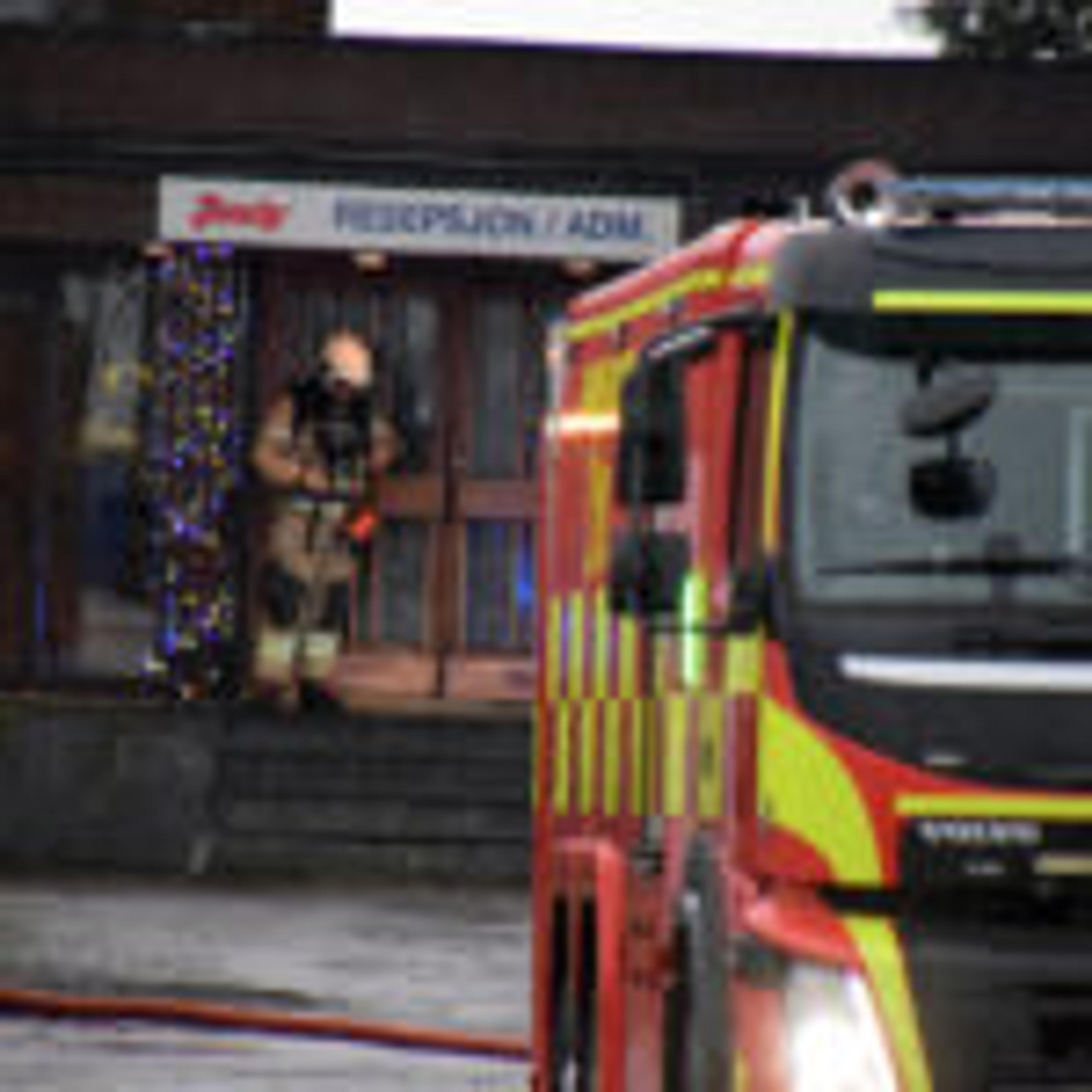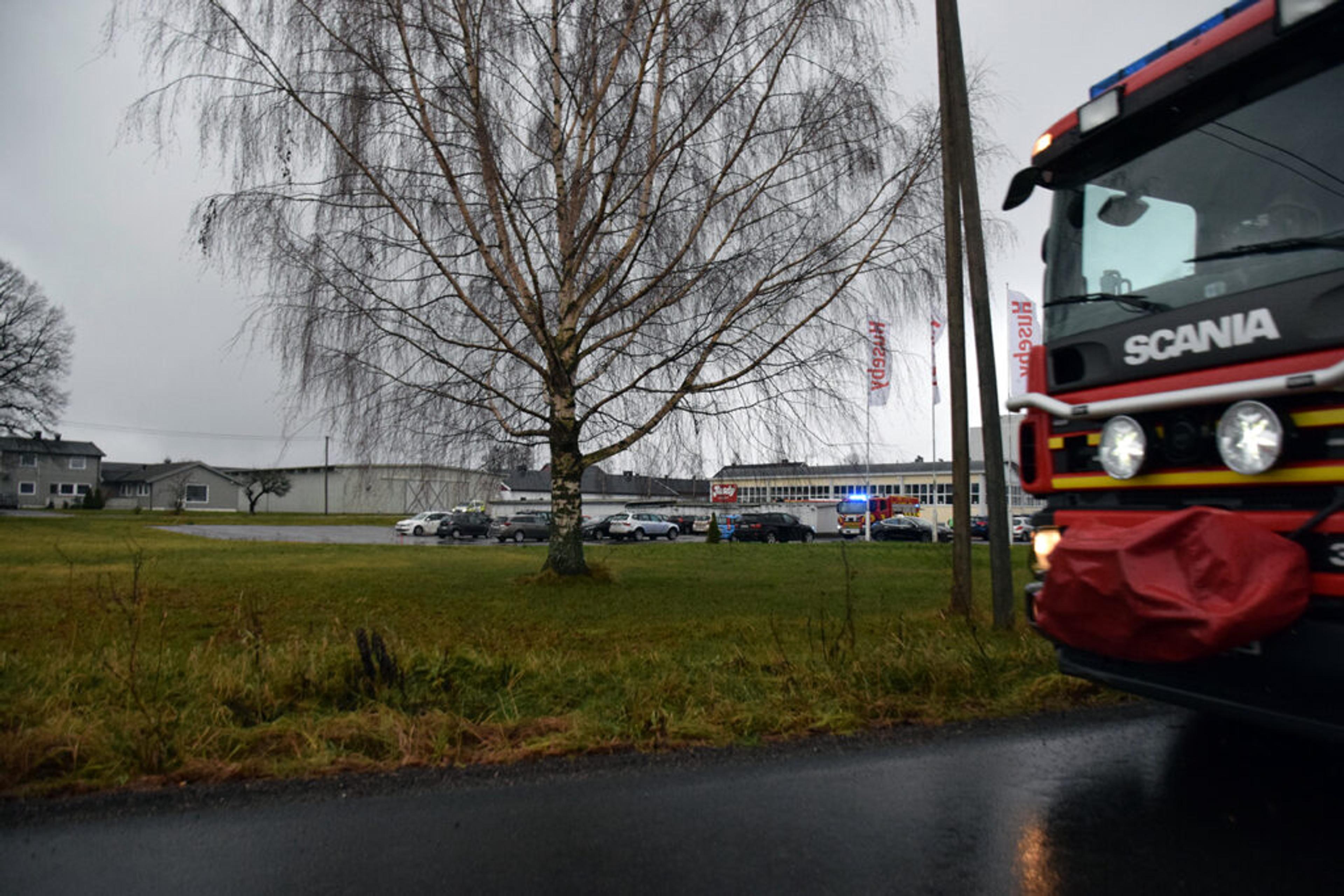 Ett par politipatruljer og flere brannbiler er på stedet kort tid etter at alarmen gikk.