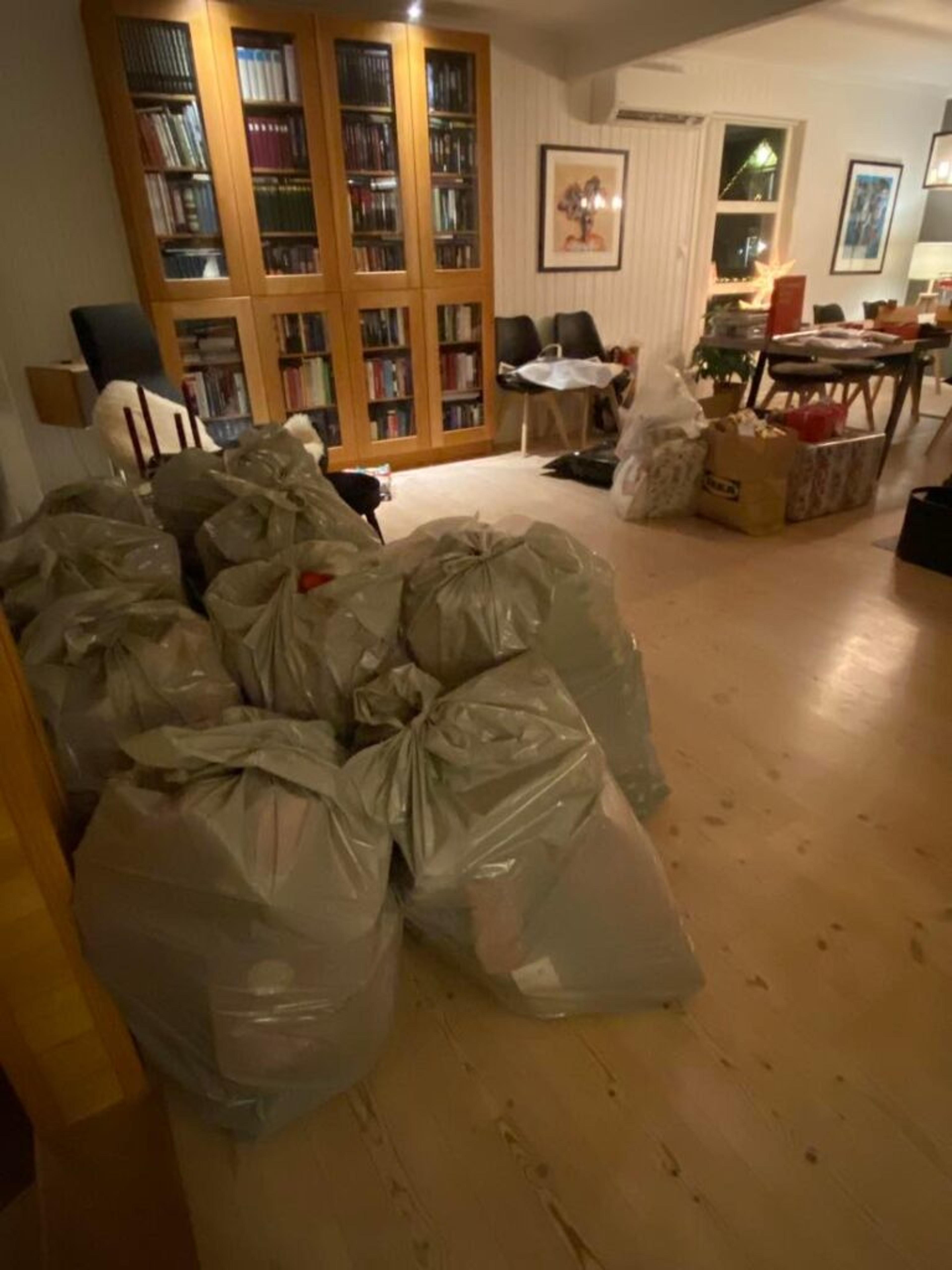 STOR FRIVILLIG INNSATS: Dette er stua mi nå, skriver Laila Mørken Jonassen og sender med dette bildet fra siste innspurt av årets julegaveinnsamling i Re. Foto: Privat.