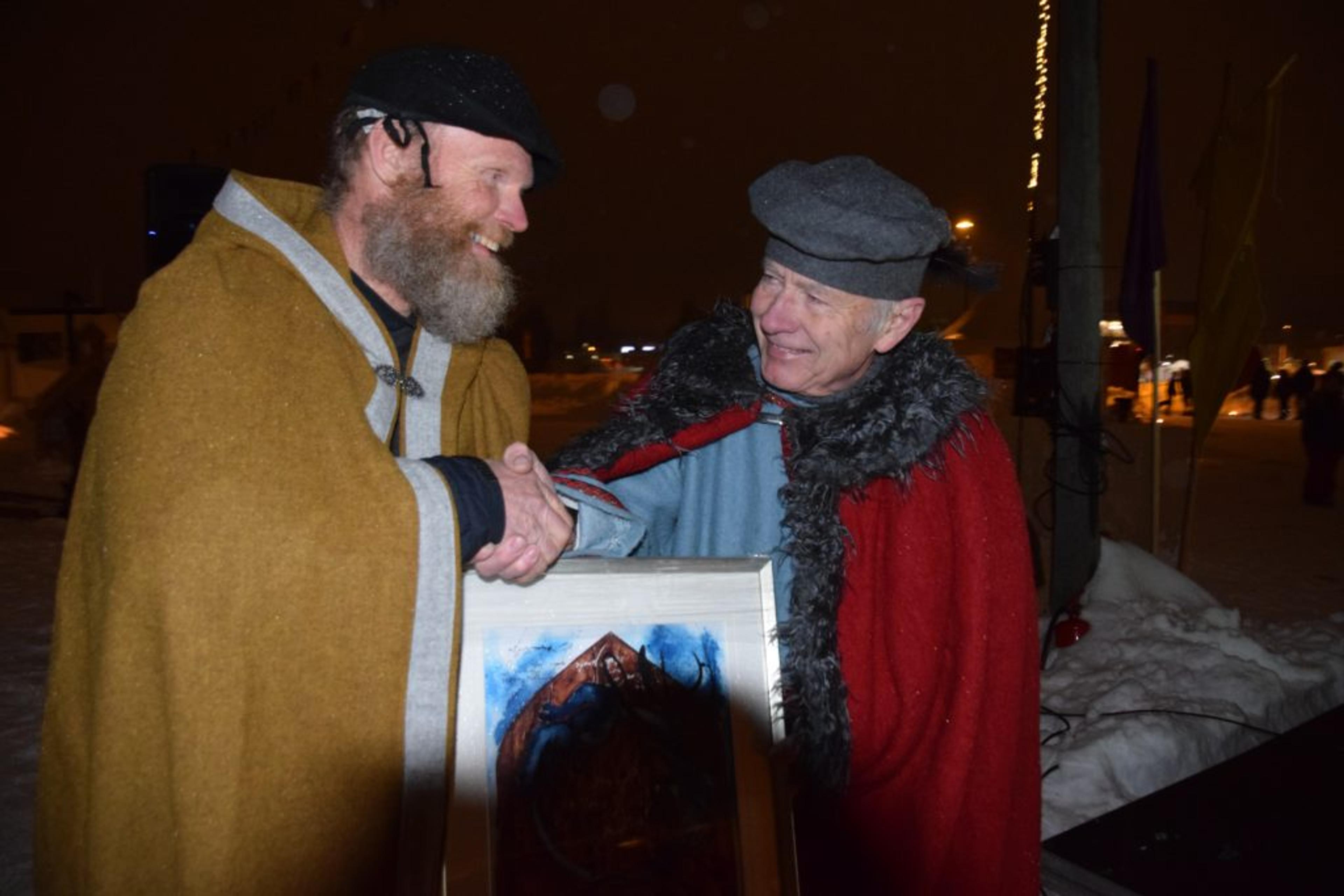 EN RIDDER AV RE SKAL FEIRES: 61 år på 61 minutter – i Bryggerhuset på Holt gård. Her et bilde fra da Holt-bonden Roar Lefsaker ble slått til Ridder av Re av gammel-ordfører i gamle Re kommune Thorvald Hillestad for snart tre år siden. Foto: Stian Ormestad.