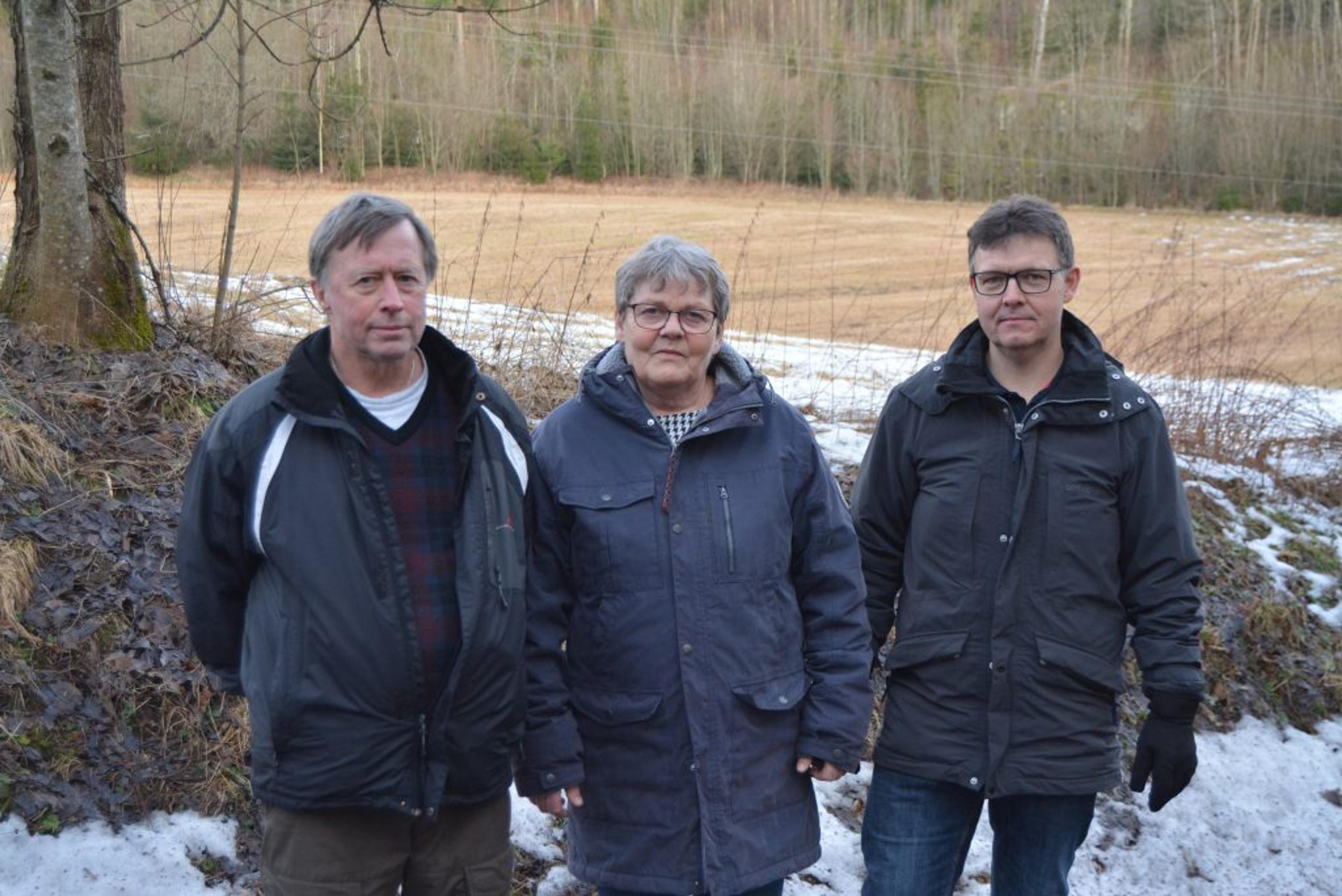 PLUKKER OG PLUKKER SØPPEL: Før jul hadde nabolaget langs Fonsveien, her ved Anders Skaug (68), Anne Lise Skaug (68) og Henning Foss (46), rydda helt opp langs veien, men nå på nyåret har det samla seg opp enda mer nytt søppel – nesten ti fulle søppelsekker bare på ett par uker. Foto: Lovis Eggum Wallberg.