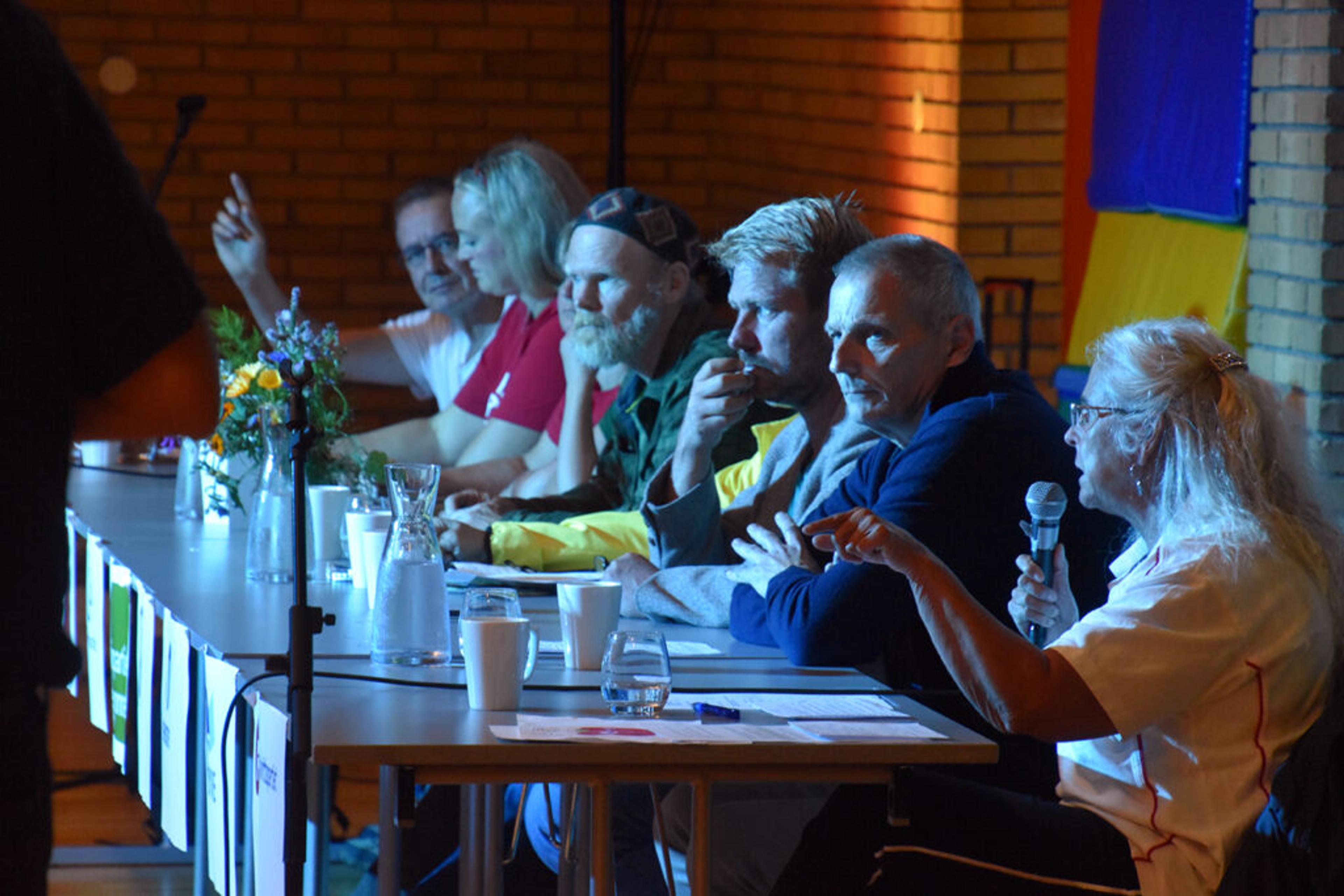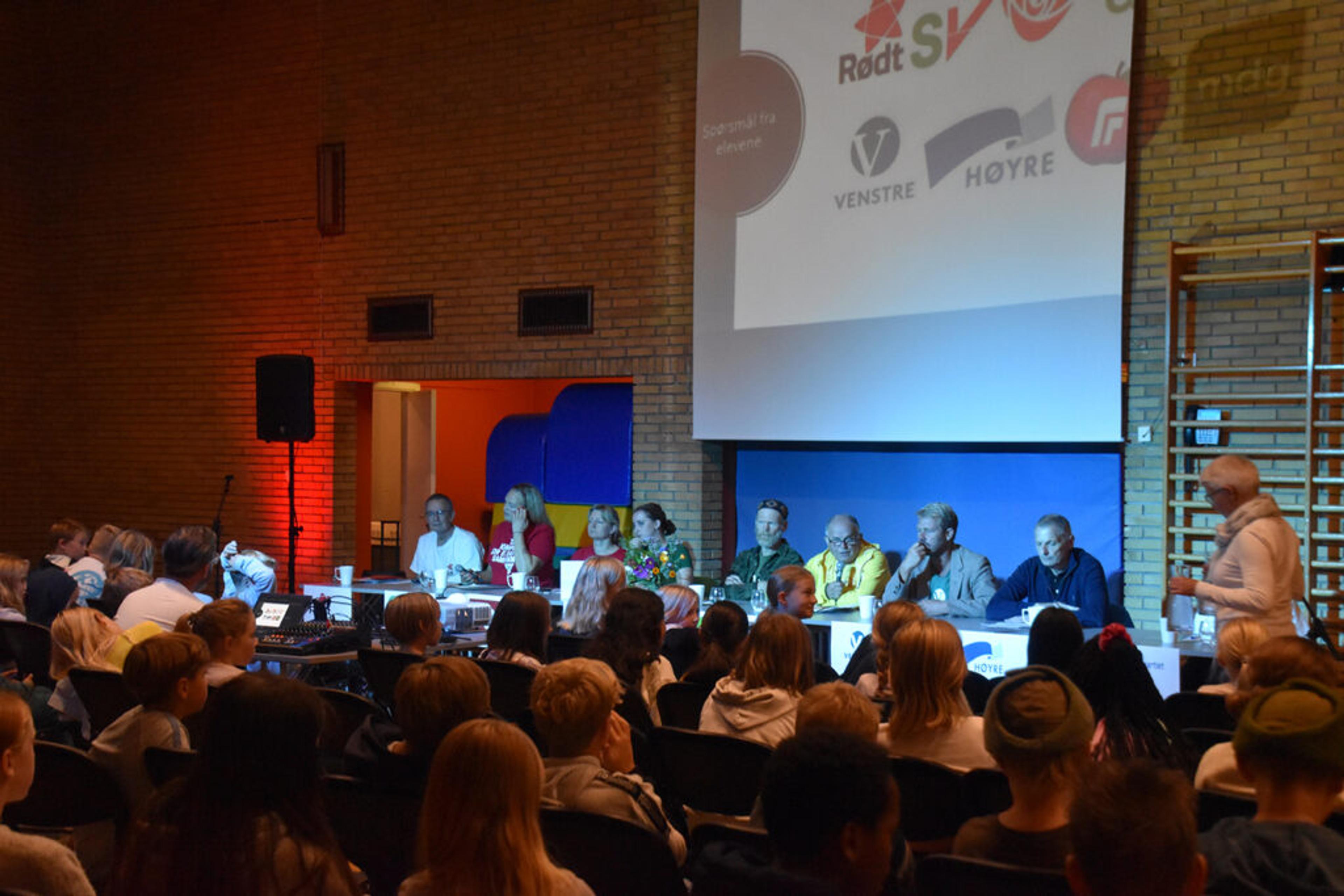PANELET: Jarl Teig (R), Christina Grefsrud-Halvorsen (SV), Anne Holm Moen (AP), Karoline Lie (SP), Roar Lefsaker (MDG), Ole Døvik (KrF), Håvar Bettum (V), Frank Pedersen (H) og bak rektor Anne Gry Kalager sitter Anne-May Hoksnes (FrP). Foto: Stian Ormestad, ReAvisa.
