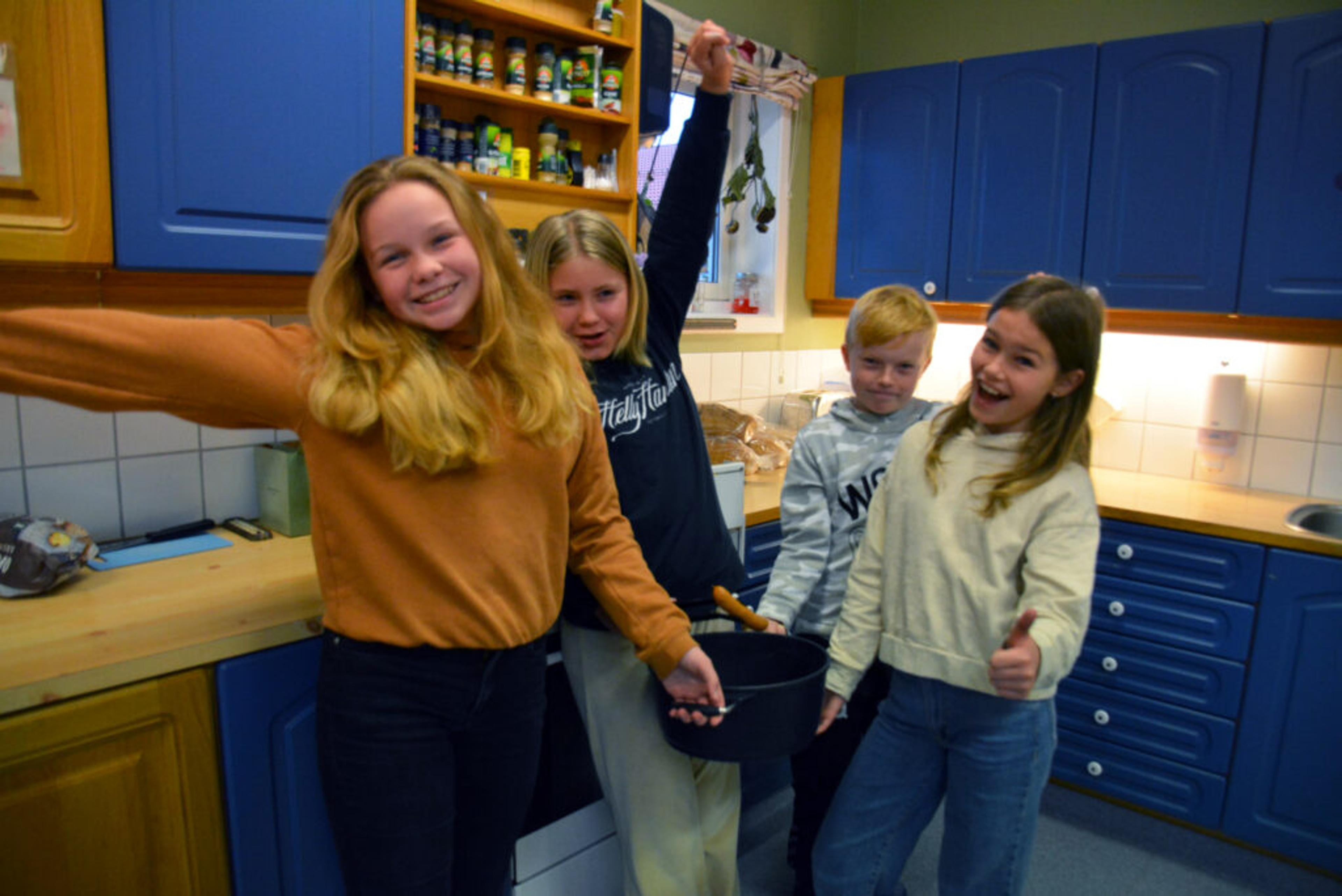 EN OVERRASKELSE FOR RESTEN AV SKOLEN: Mina (12), Pernille (12), Jesper (10) og Ingvild (11) i elevrådet er superklare for pølsefest. De og Odny på SFO lot det være en overraskelse for resten av skolen. Foto: Stian Ormestad. Foto: Stian Ormestad.