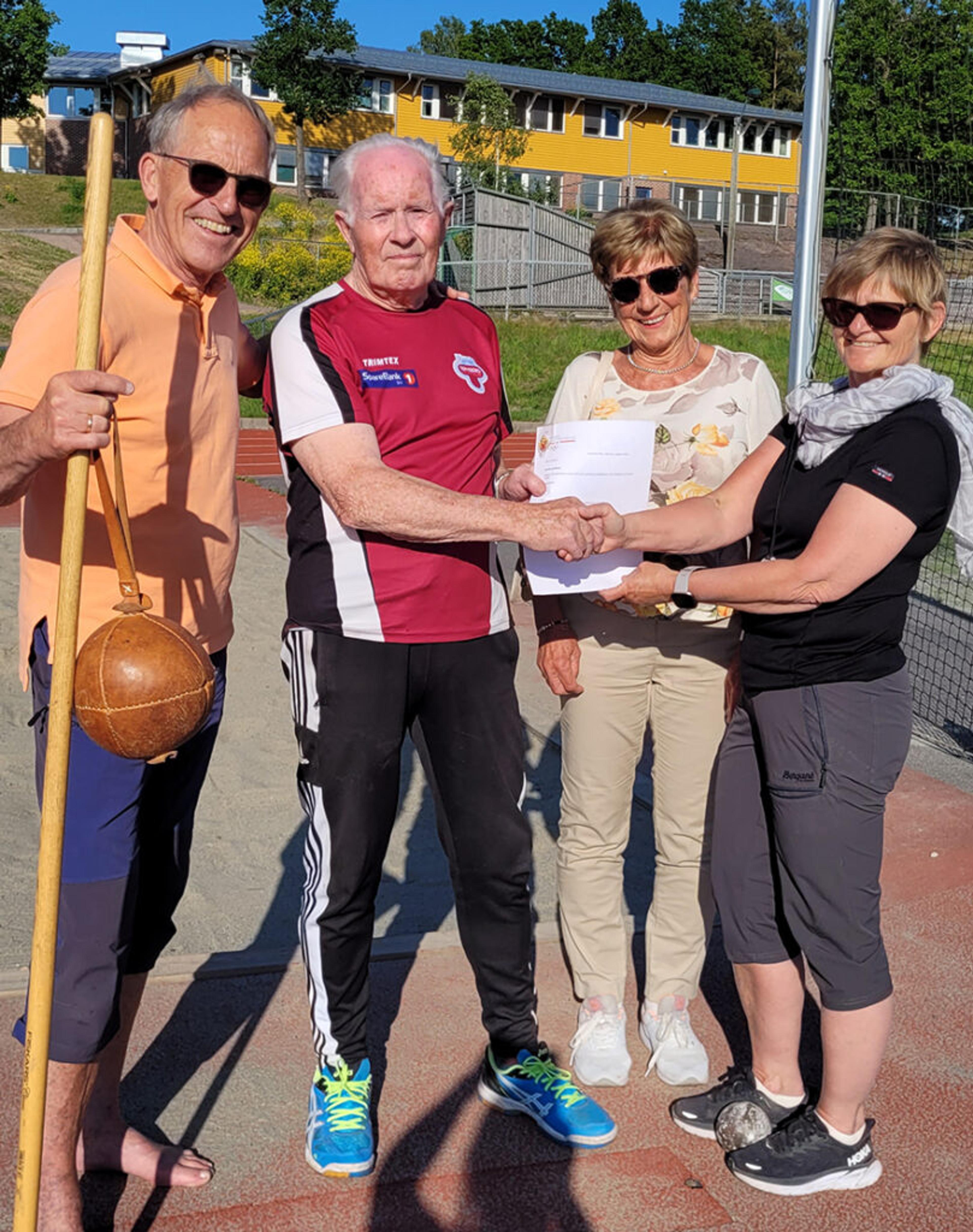 IDRETTSMERKE-VETERANER: Idrettsmerkegeneralene Einar Borgmann og Lillian Holtung på hver sin side av idrettsmerke-heltene som får sine velfortjente merker og diplomer; Arne Ueland og Mary Kjølstad. Foto: Privat.
