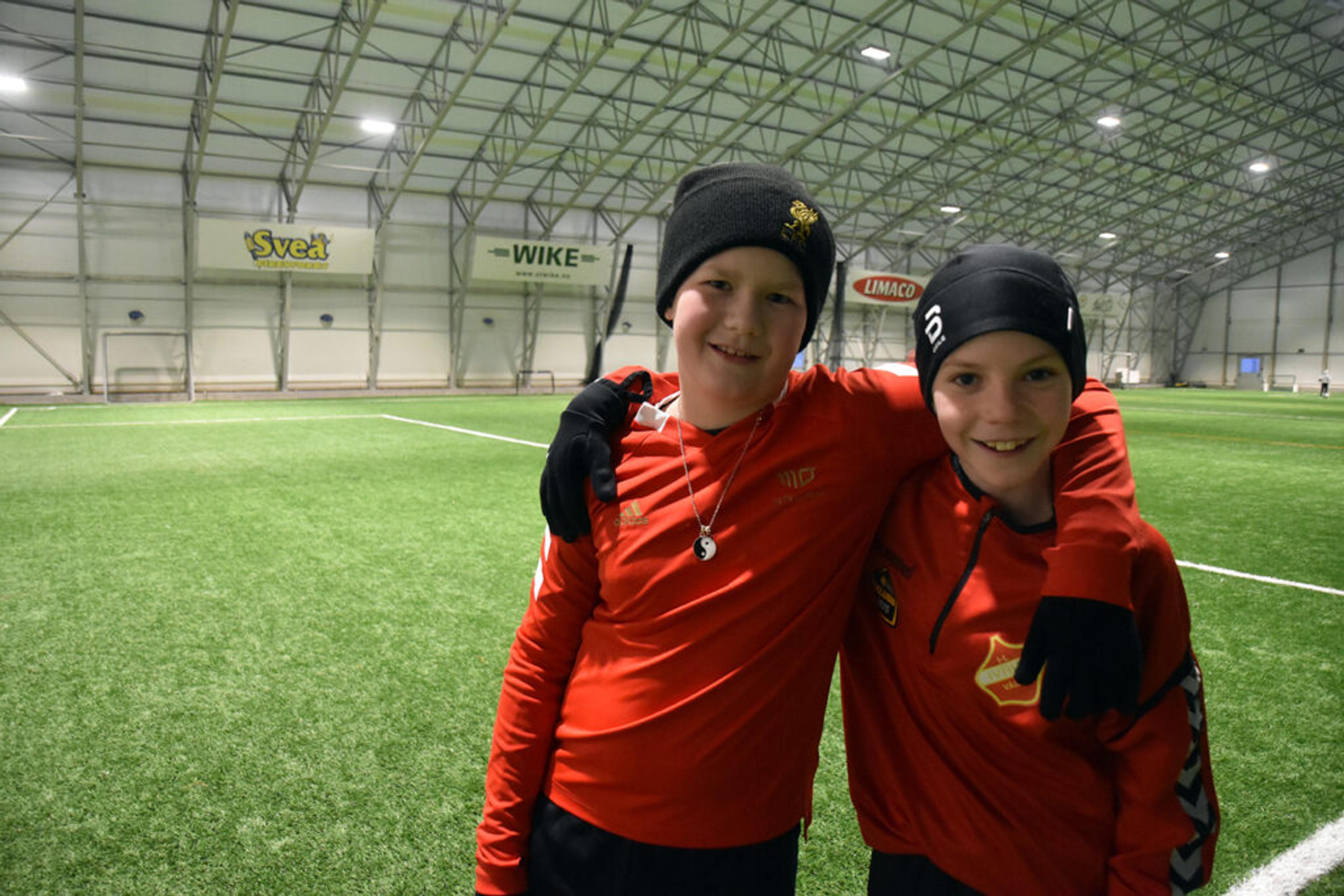 Alexander (10) og Jesper (10) er to av 11 spillere på Ivrigs G2012-lag. – Vi er kjempetakknemlig, det er kjempefint. Hvis ikke vi kunne trena her, måtte vi egla oss enda mer innpå Ramnes, sier de og ler. De låner også kaldhallen i Bergsåsen til treninger.