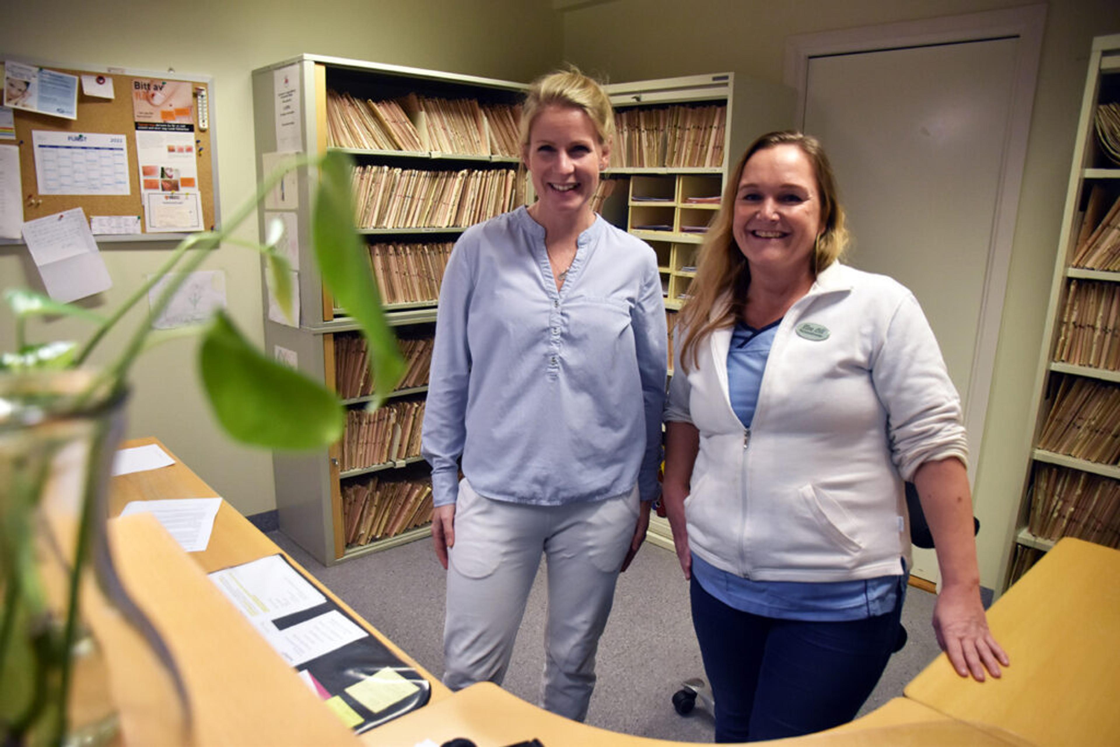 POPULÆRT OPPLEGG: En av fire fastleger ved Våle legekontor Vibeke Stuestøl og helsesekretær Else Lill Opsahl Paulsen er klare for influensa-vaksinering for legekontorets pasienter. Foto: Stian Ormestad, ReAvisa.