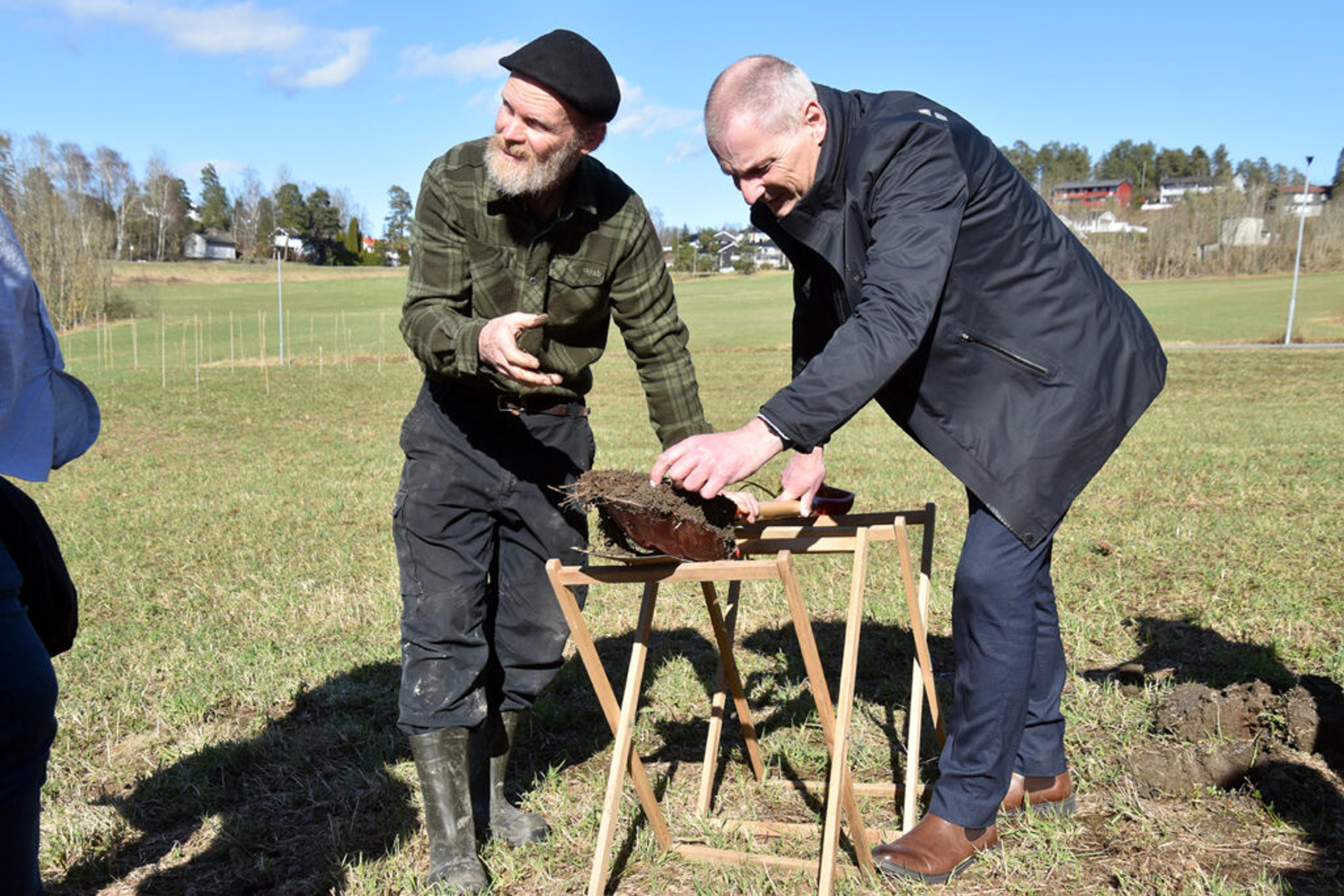 ET ANALYTISK SPADETAK: Ordfører Frank Pedersen forteller at det var et lærerikt første spadetak i Revetalhagen. Holtbonde Roar Lefsaker er en veldig god mentor. Foto: Stian Ormestad, ReAvisa.