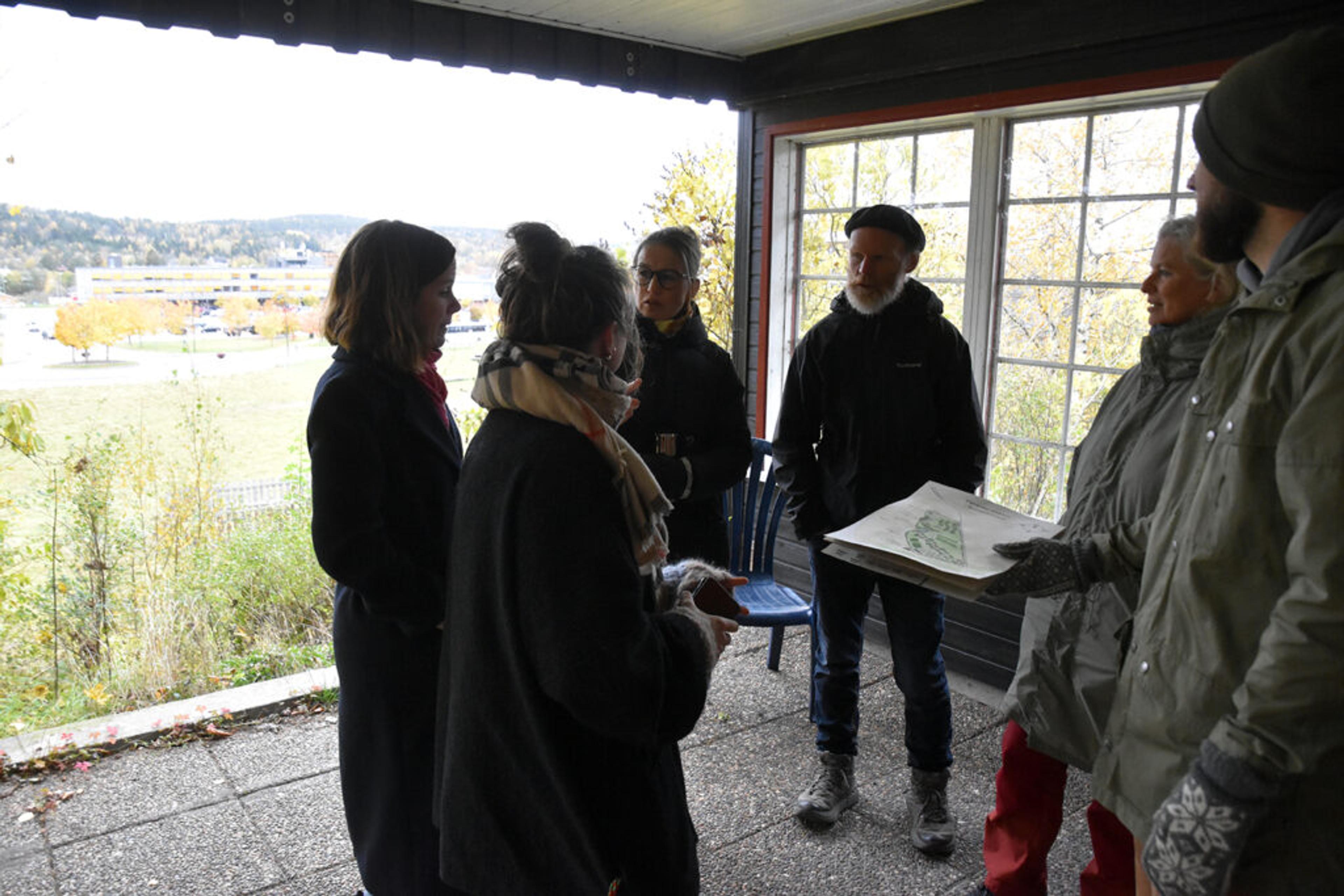 DRØMMEN OM HUSET: På befaringa gikk turen også bortom framhuset på Låhnegården, som kommunen eier og har latt stå tomt i årevis. – Tenk om vi også kunne få disponere dette huset til forberedelser, foredling, servering, kurs – sammen med resten av frivilligheten i Re! Foto: Stian Ormestad, ReAvisa.