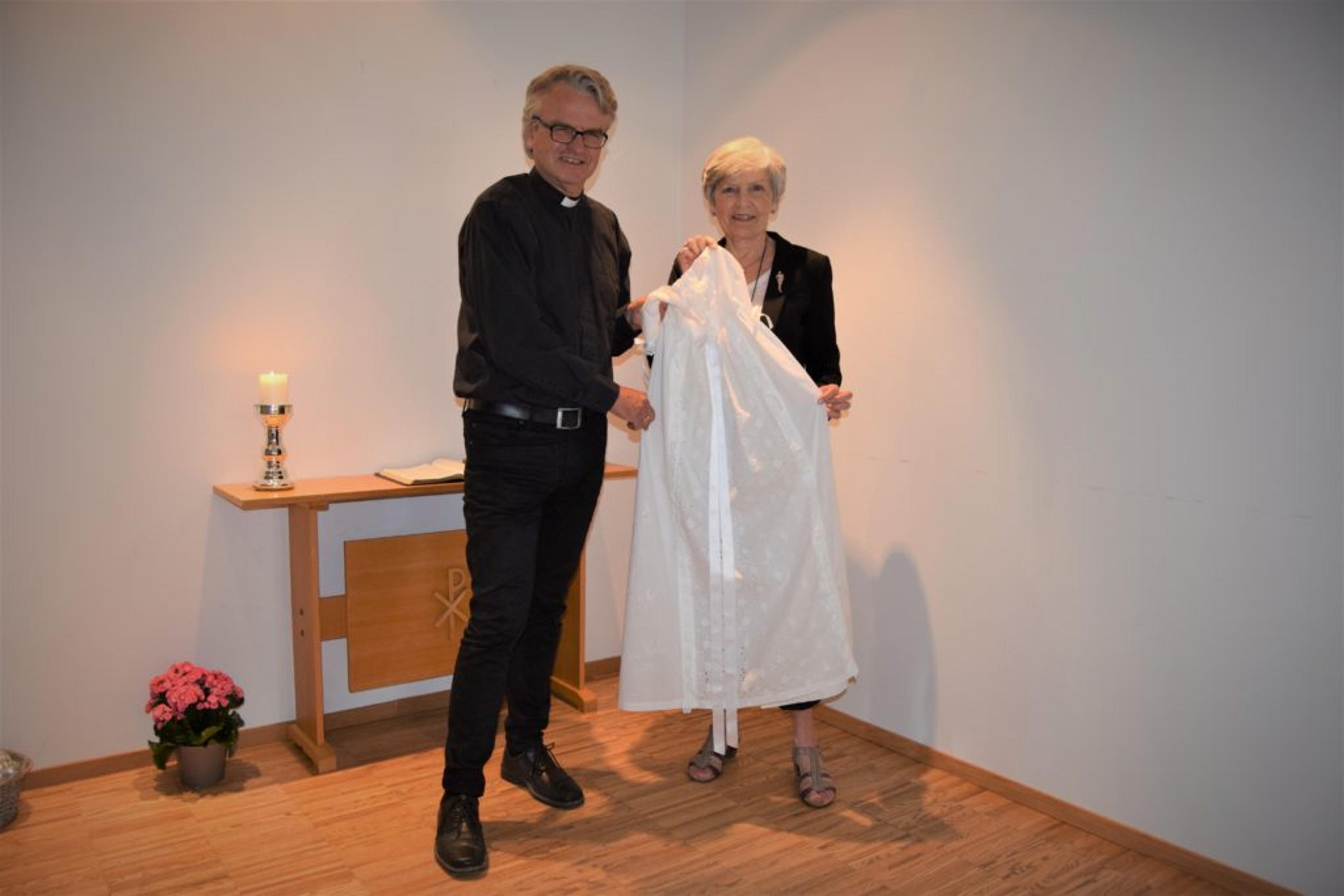 DÅPSKJOLEUTSTILLING: Sogneprest Jon Geir Dittmann og Ellen Gjerpe har fått låne femti dåpskjoler til utstillingen. En av dem er familien Gjerpe Hansens dåpskjole som har vært i bruk i to generasjoner. Foto: Håkon Westby.