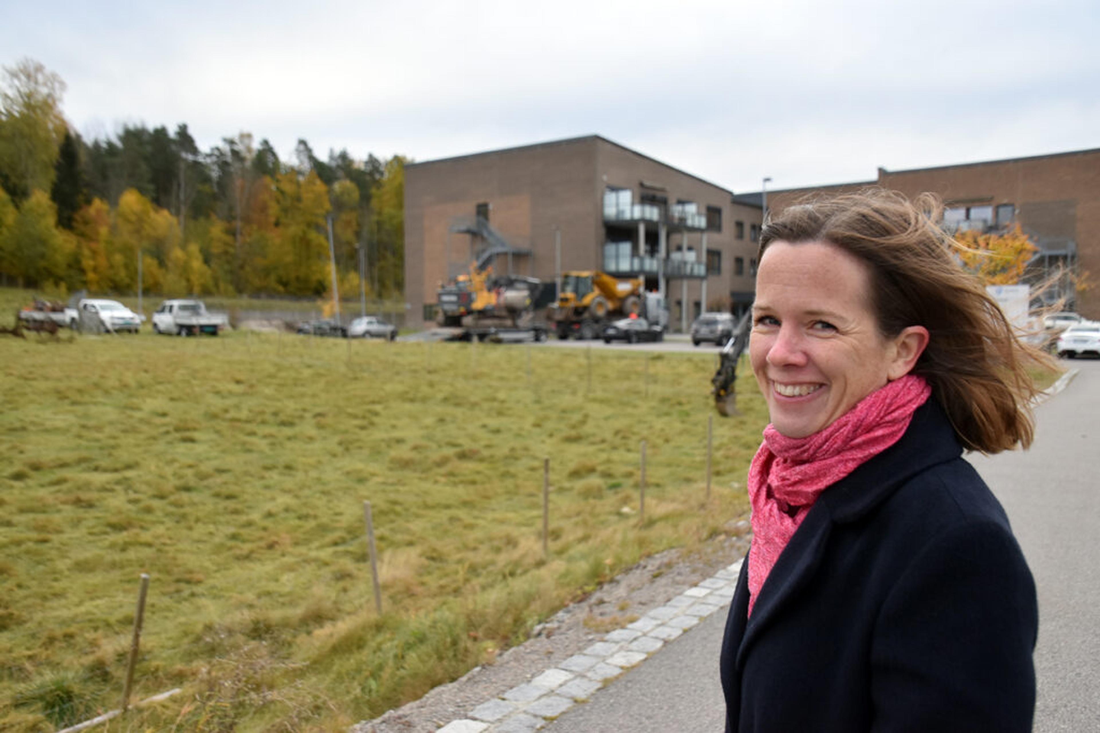 BILDE FRA PROSJEKTSTART: Marthine Søyland Hoel, by- og stedsutvikler i Virksomhet folkehelse, klima og stedsutvikling i Tønsberg kommune, møtte lokalavisa da anleggsmaskinene kom til helsehuset i fjor høst. Foto: Stian Ormestad, ReAvisa.