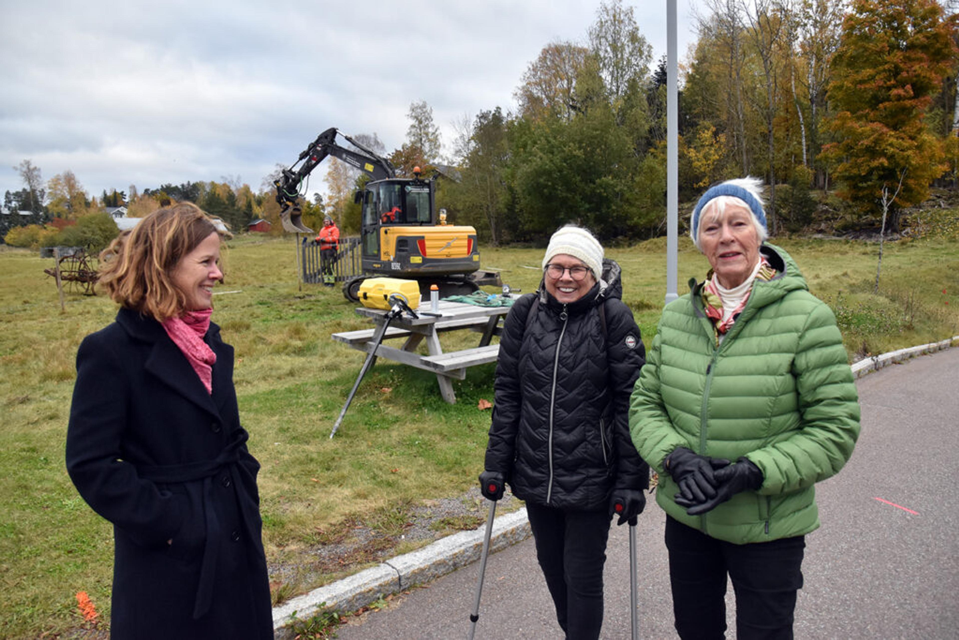 ARBEIDENE VAR I GANG: Prosjektleder Marthine Søyland Hoel i prat med Karin Lian og Solveig Myrstad fra pensjonistforeningene i Re, utafor Re helsehus, ved anleggsstart i fjor høst. Foto: Stian Ormestad, ReAvisa.