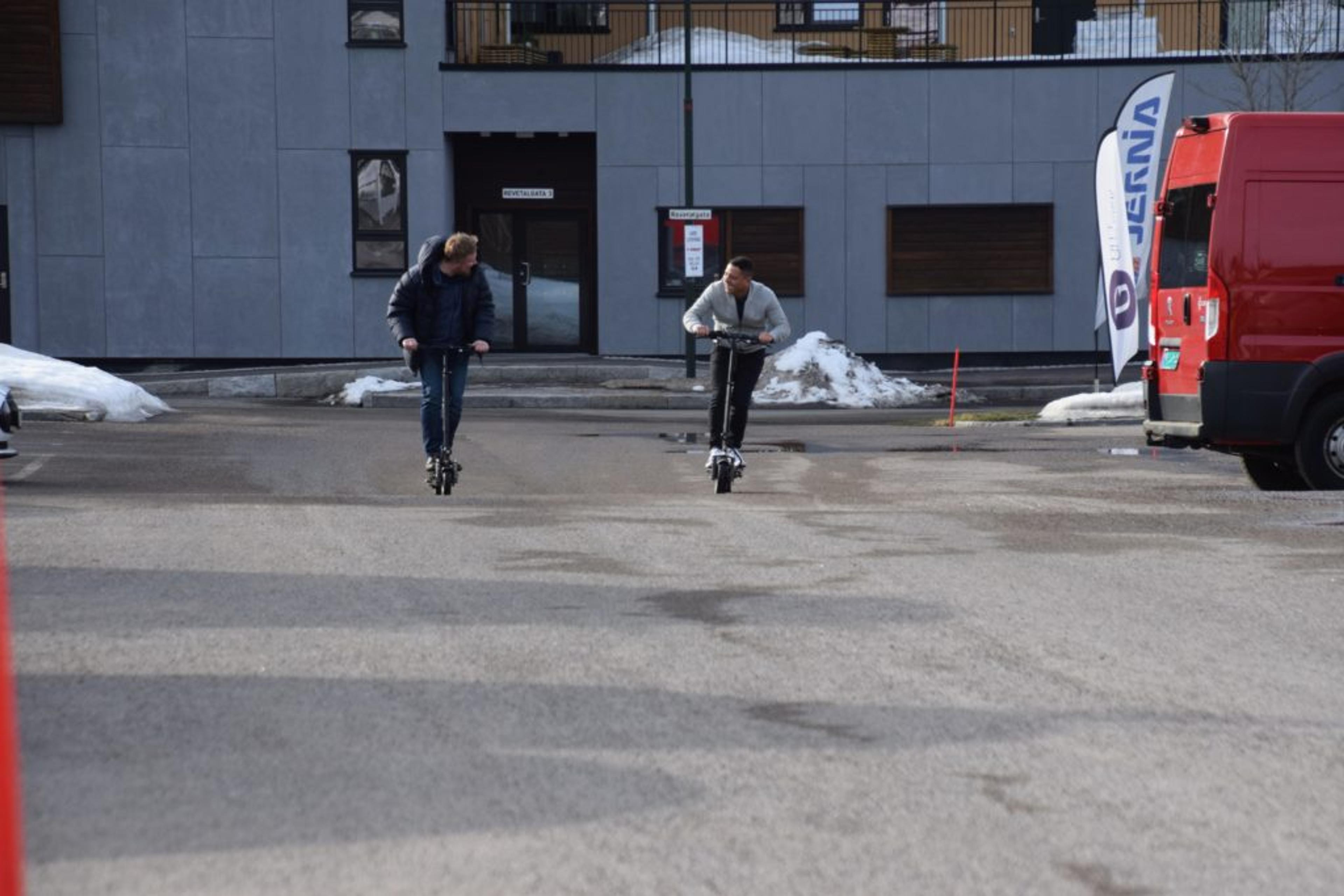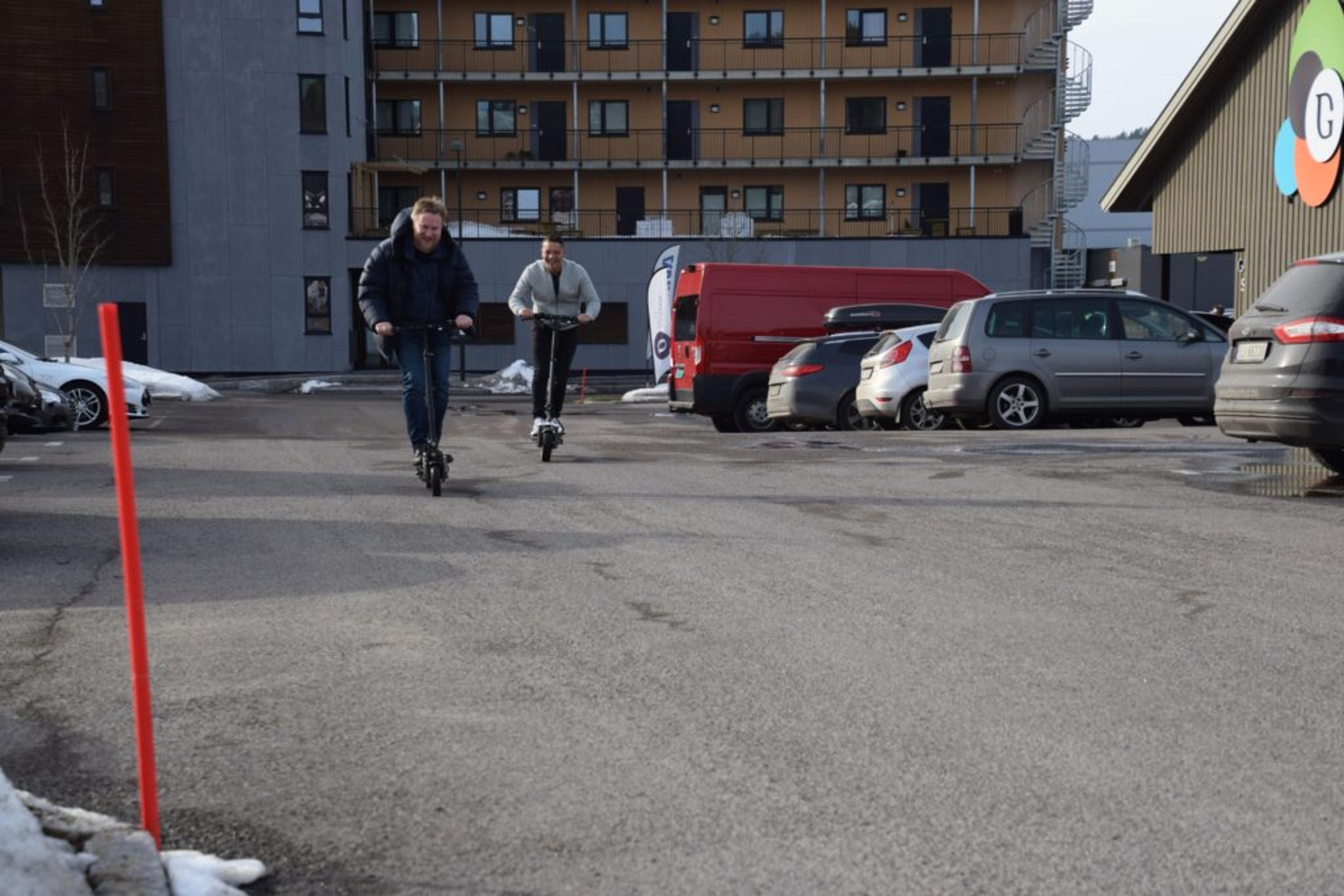KLAR – FERDIG – GÅ! Elektrisk sparkesykkel-race utenfor ReAvisa-kontoret. Foto: Hvem veit?
