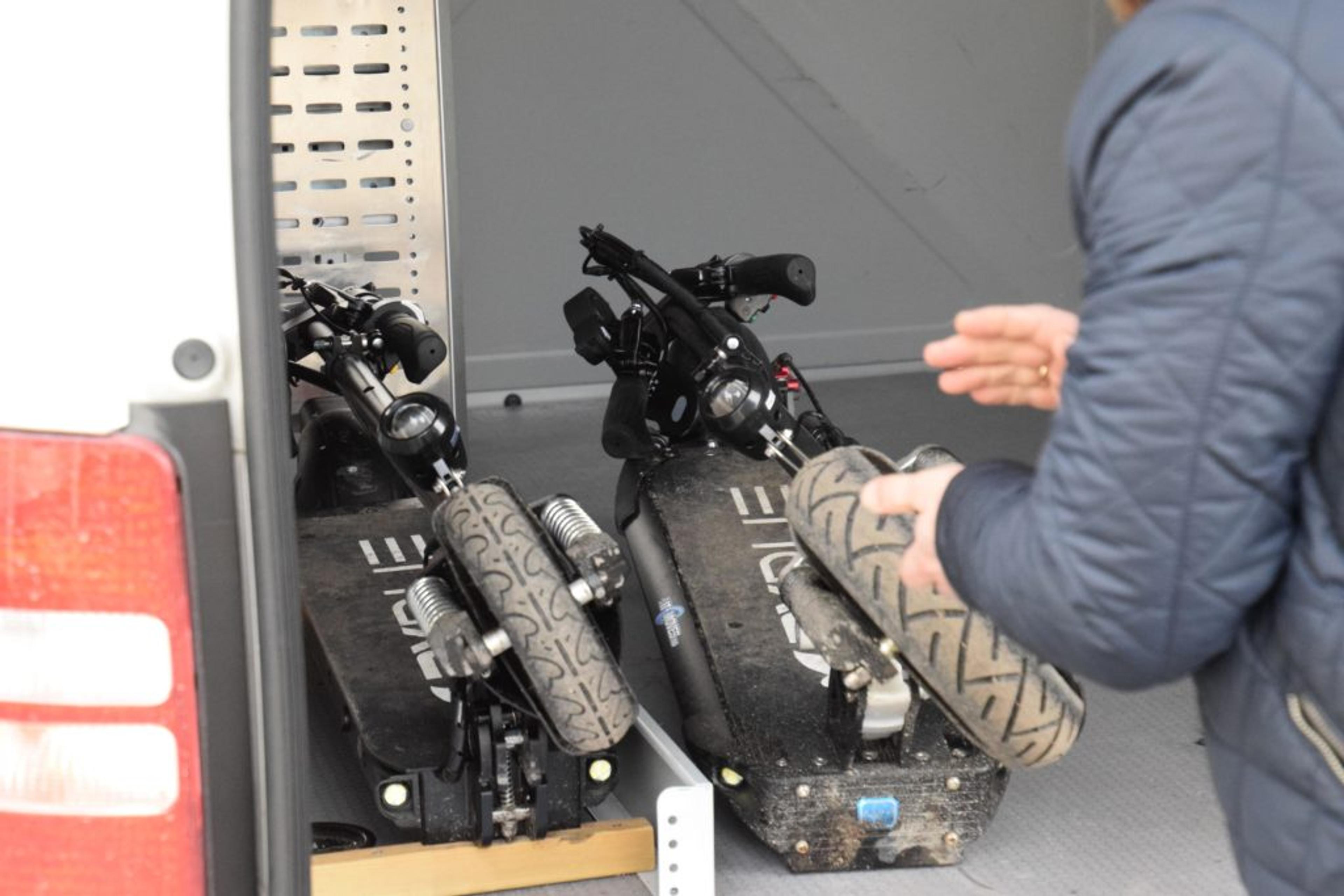 Og noen dager seinere ramler det elektriske sparkesykler, skateboard og sykler ut av den lille varebilen.