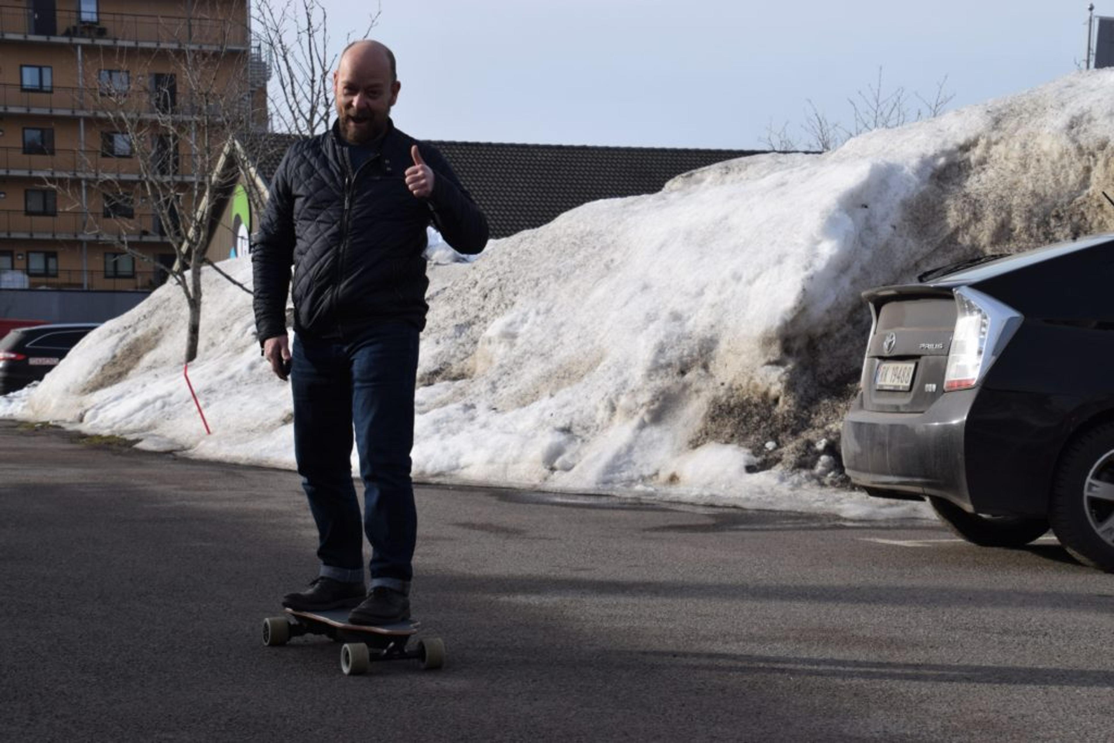 SKATER: – Du blir ti – tjue år yngre av å leke med dette her!, sier Tore som suser forbi på skateboardet.