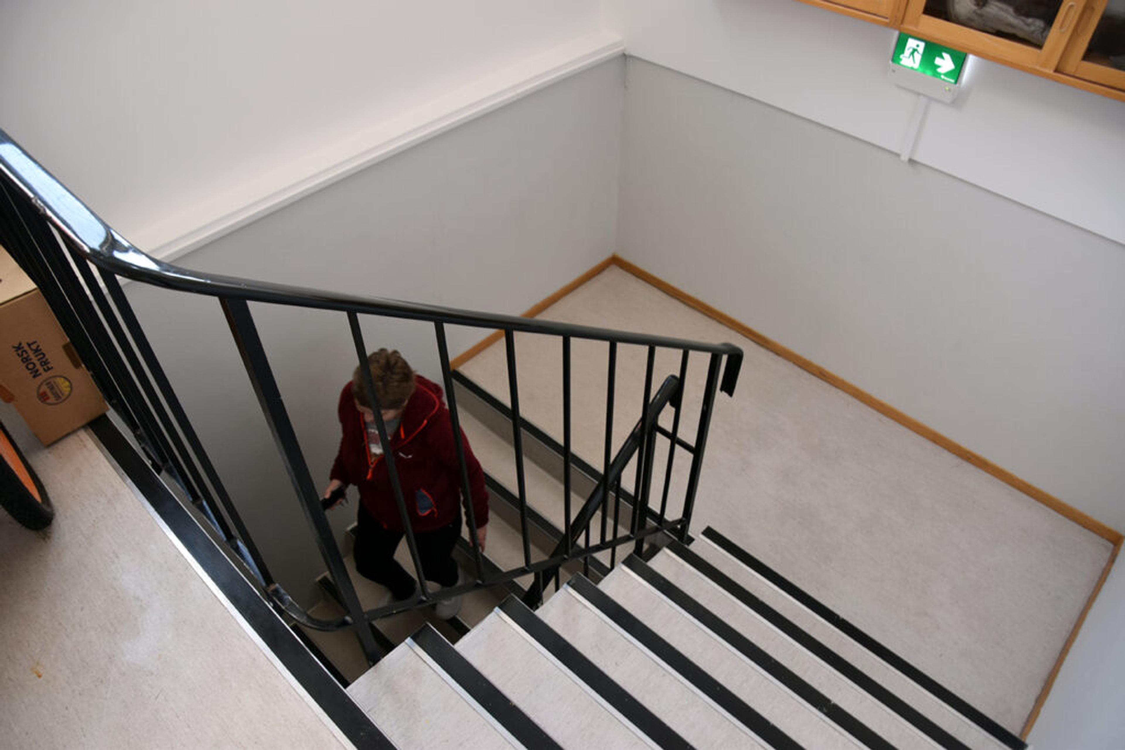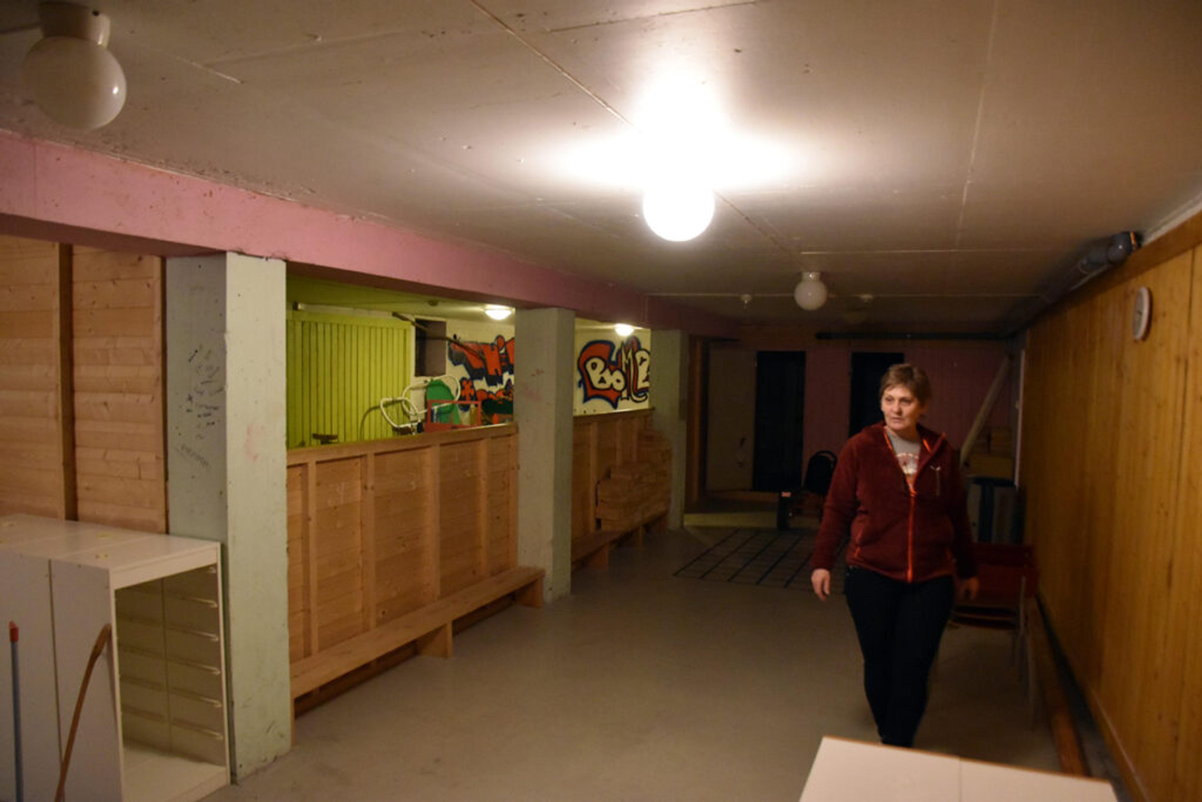 – HER VEITU! Odny Barth har jobba ved Solerød skole i 33 år og veit hvor alt er – også bomberommet i kjelleren. – Det skal være fint mulig å rydde og sette i stand godt innafor de forskriftsmessige 72 timene. Foto: Stian Ormestad.