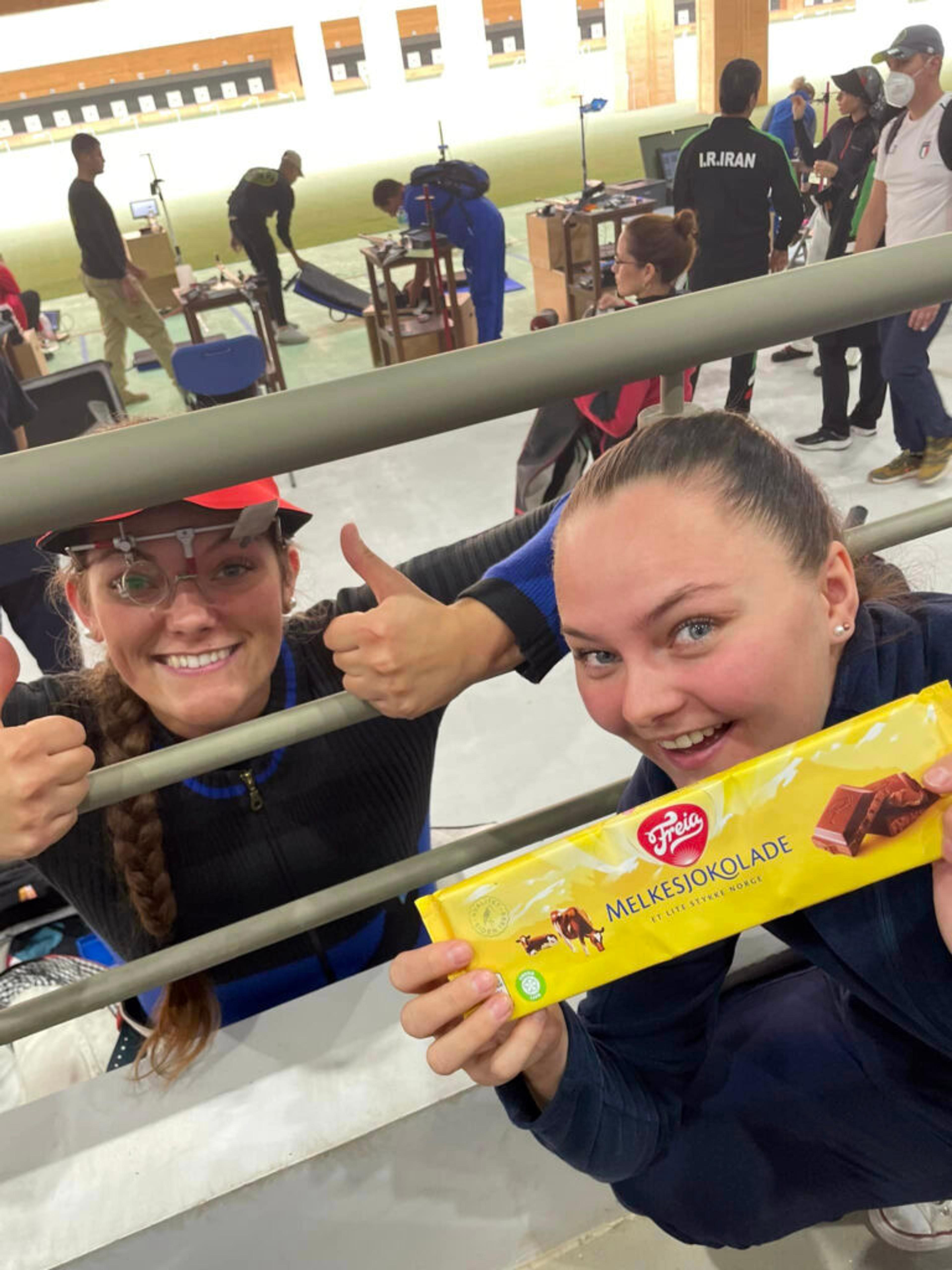 NORSK SJOKOLADE: Stor jubel i den norske leieren med denne leveransen til Kairo i Egypt. Foto: Norges Skytterforbund.