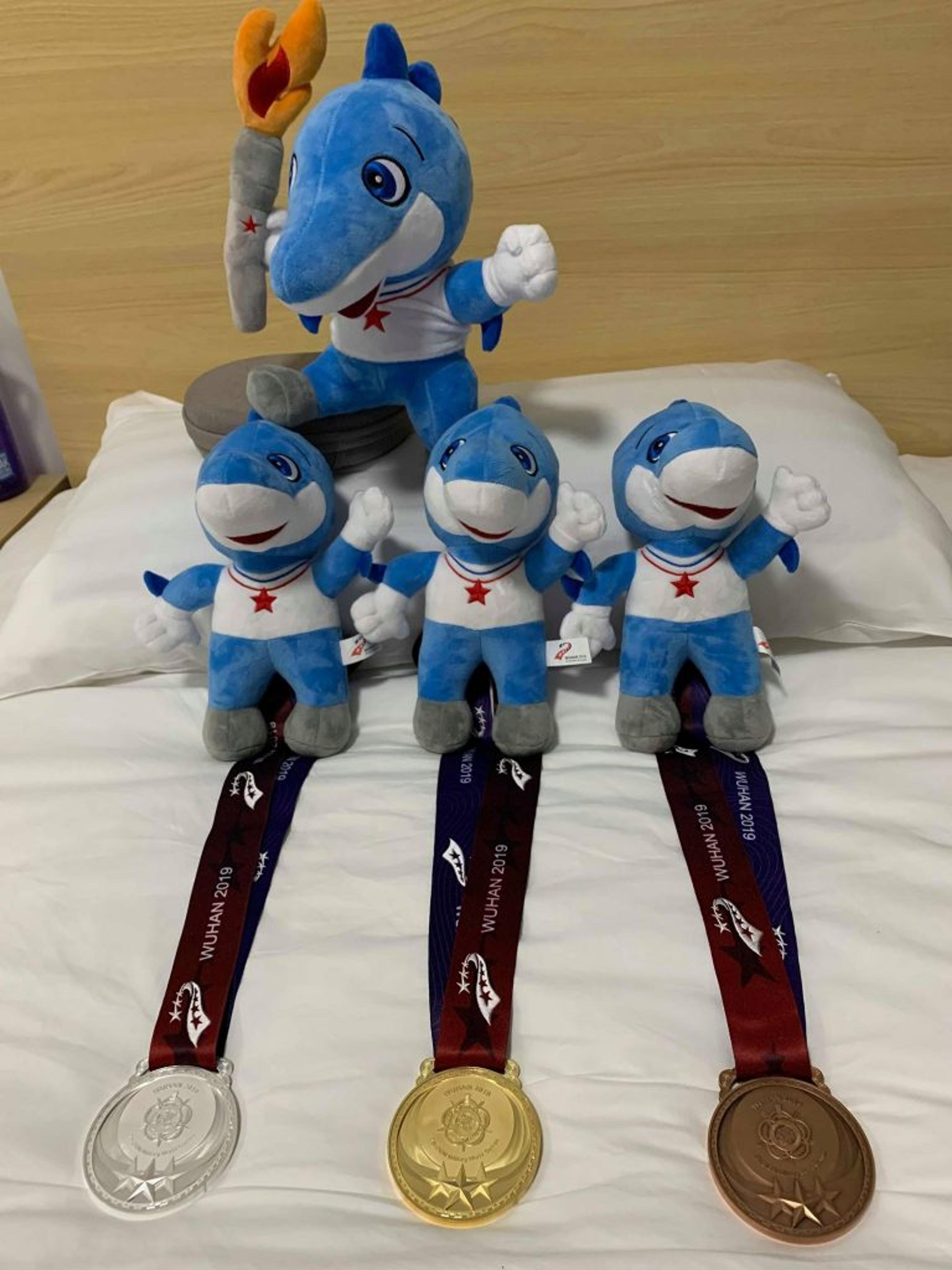 KOSEBAMSER OG EDELT METALL: Jeanette bærer alltid tungt på hjemreisen etter mesterskap – også militær-OL. Foto: Privat.