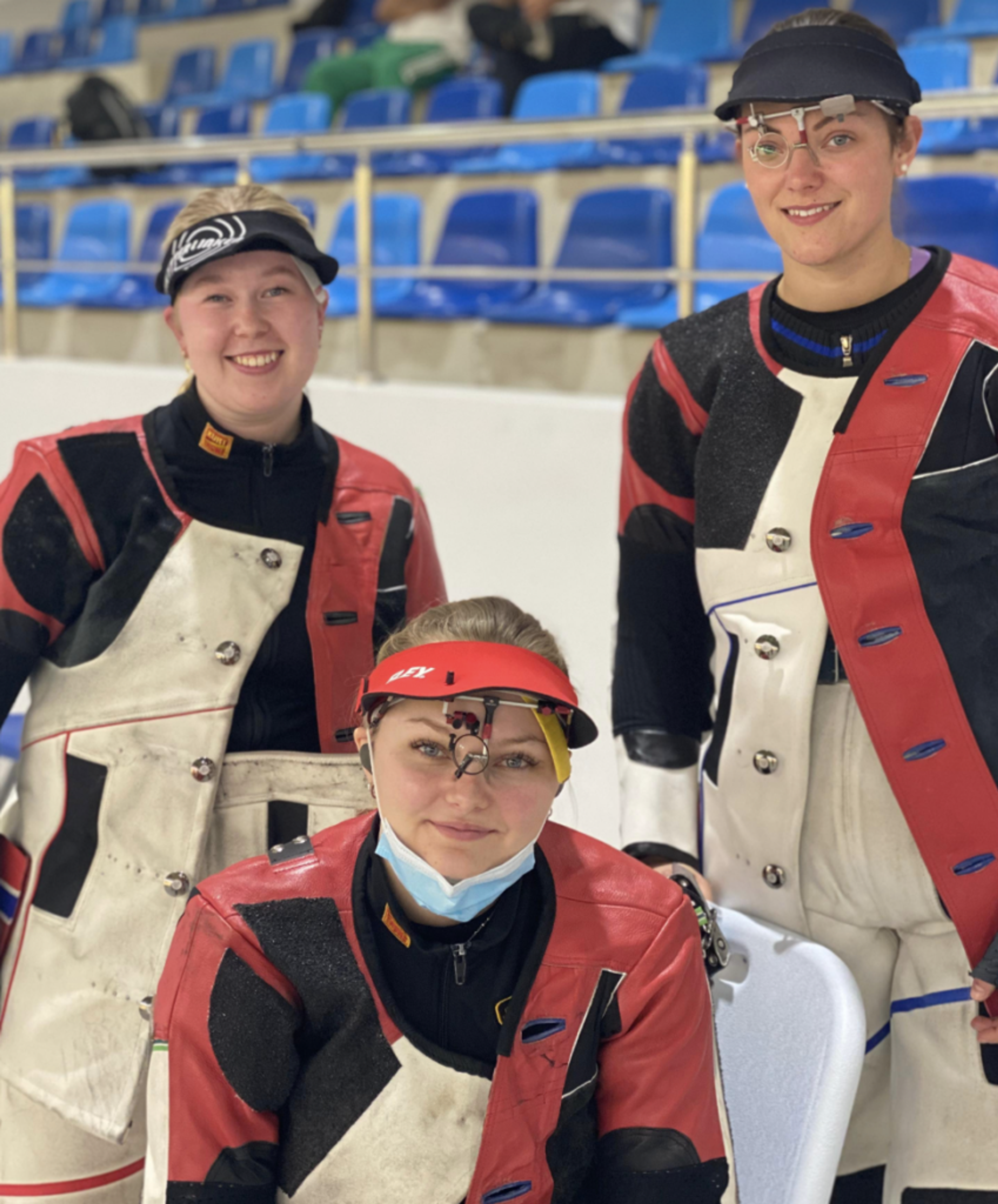 SØLV-JENTER: Norge, med debutant Mari Bårdseng Løvseth, Jenny Stene og Jeanette Hegg Duestad, ble nummer to i lagkonkurransen på 10 meter luftrifle kvinner i World Cup Kairo. Foto: Norges Skytterforbund.