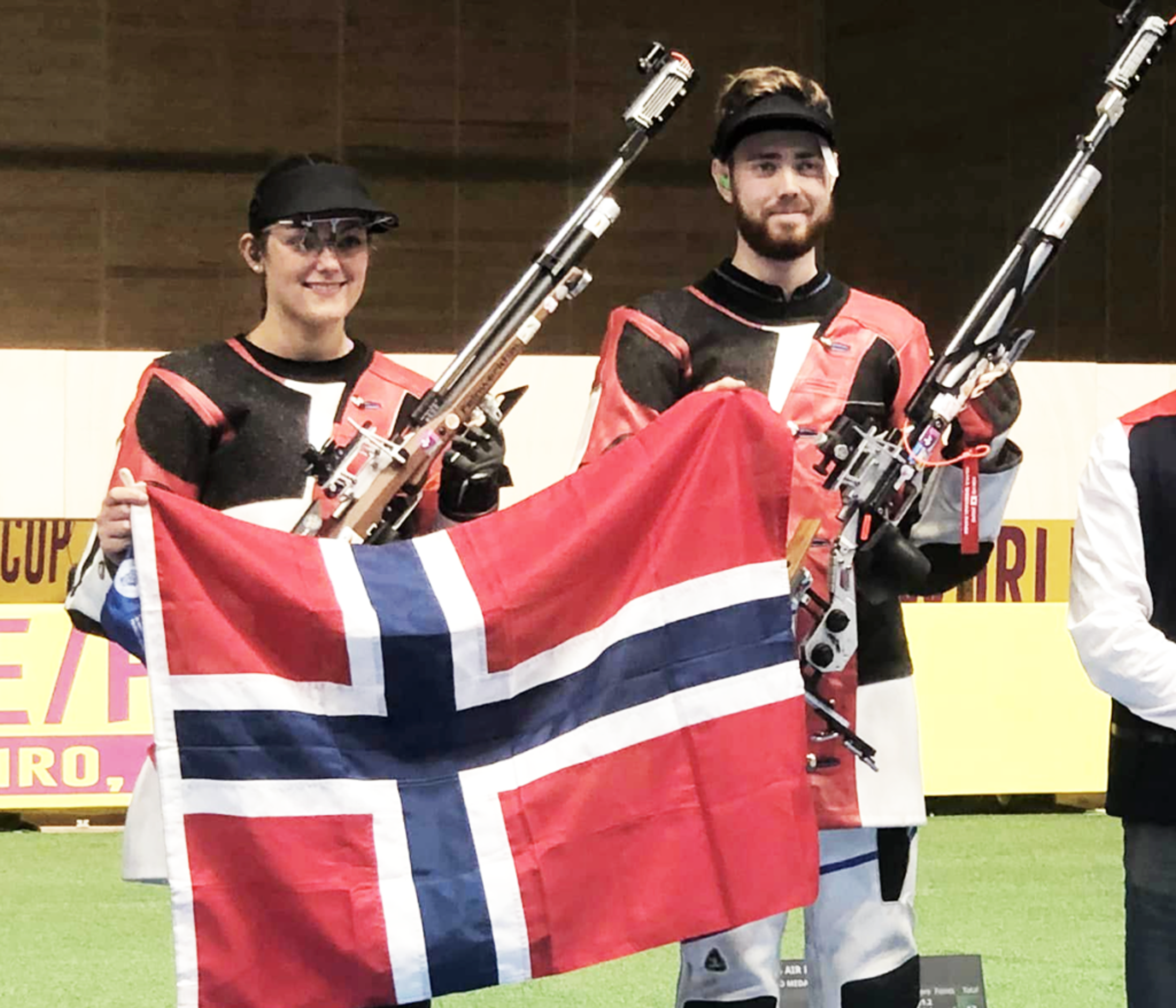 VERDENSCUP-SEIER: Jeanette Hegg Duestad og Jon-Hermann Hegg vant World Cup Kairo på OL-øvelsen 10 meter luftrifle mixed team i Wold Cup i Kairo. Foto: Norges Skytterforbund.