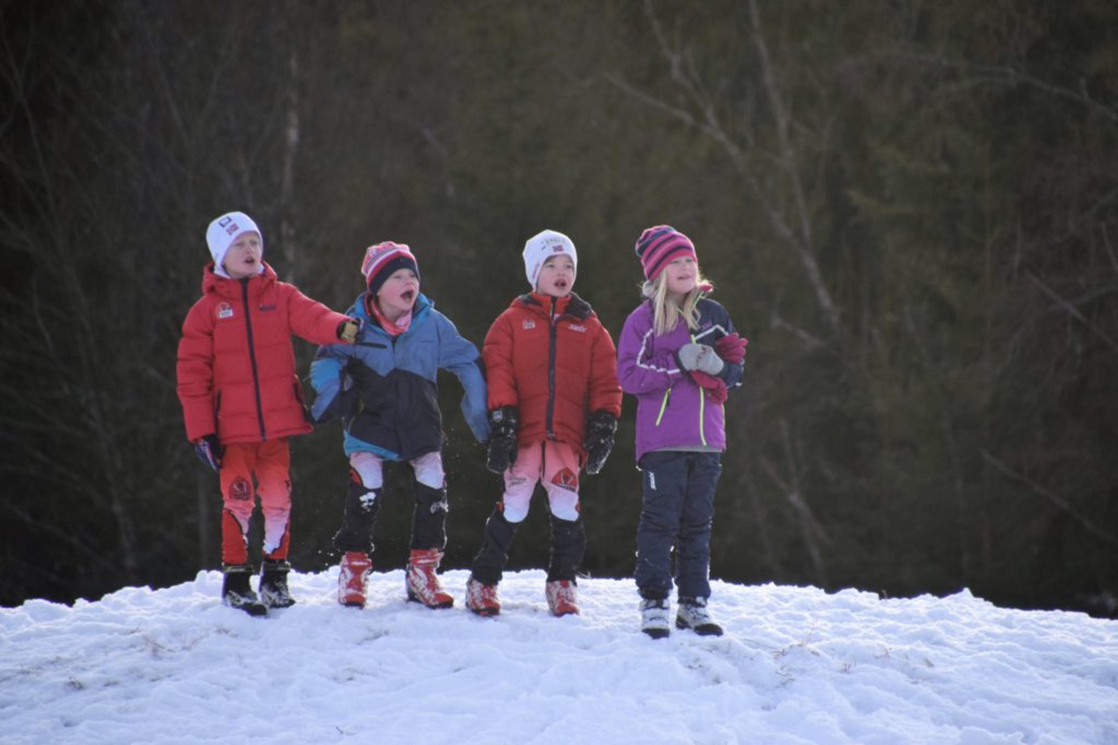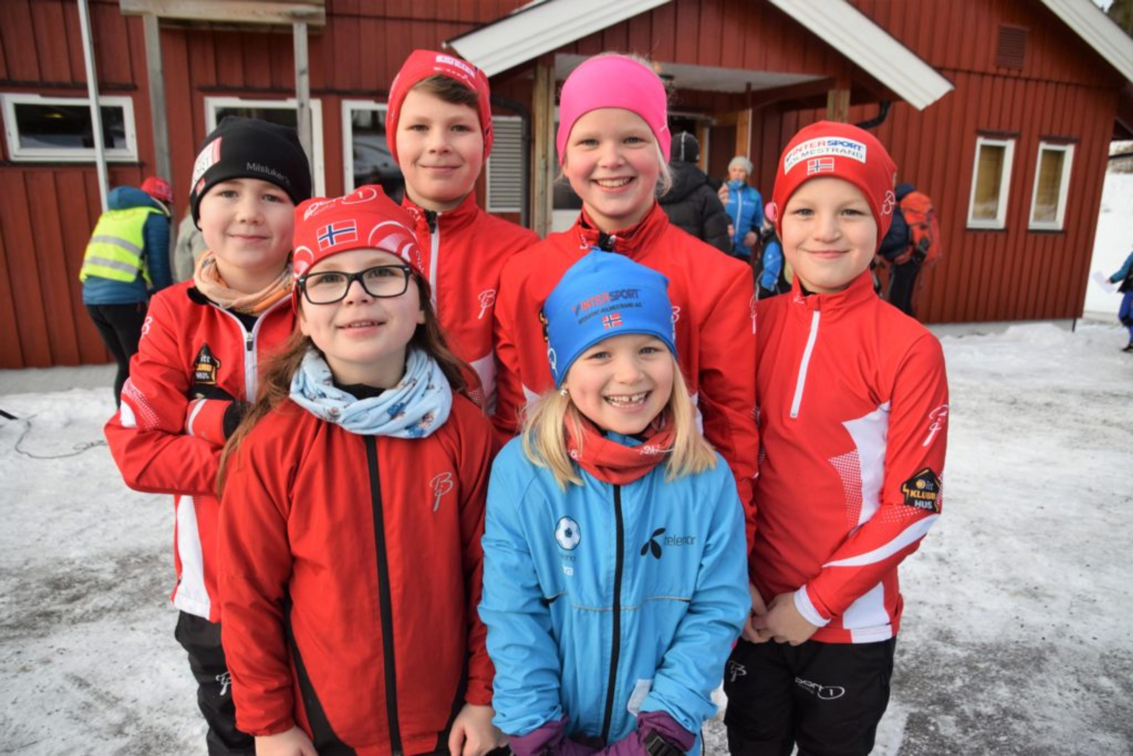 HADDE VÆRT BEST MED SNØ HJEMME I RE! Foran ser vi Vilde Jåberg Horn (7) og Olivia Thornquist (7), bak Norman Bøhle Bjørang (9), Oscar Jåberg (9), Lovise Horn (9) og Thorben Thornquist (9) – alle fra IL Ivrig. Foto: Stian Ormestad.