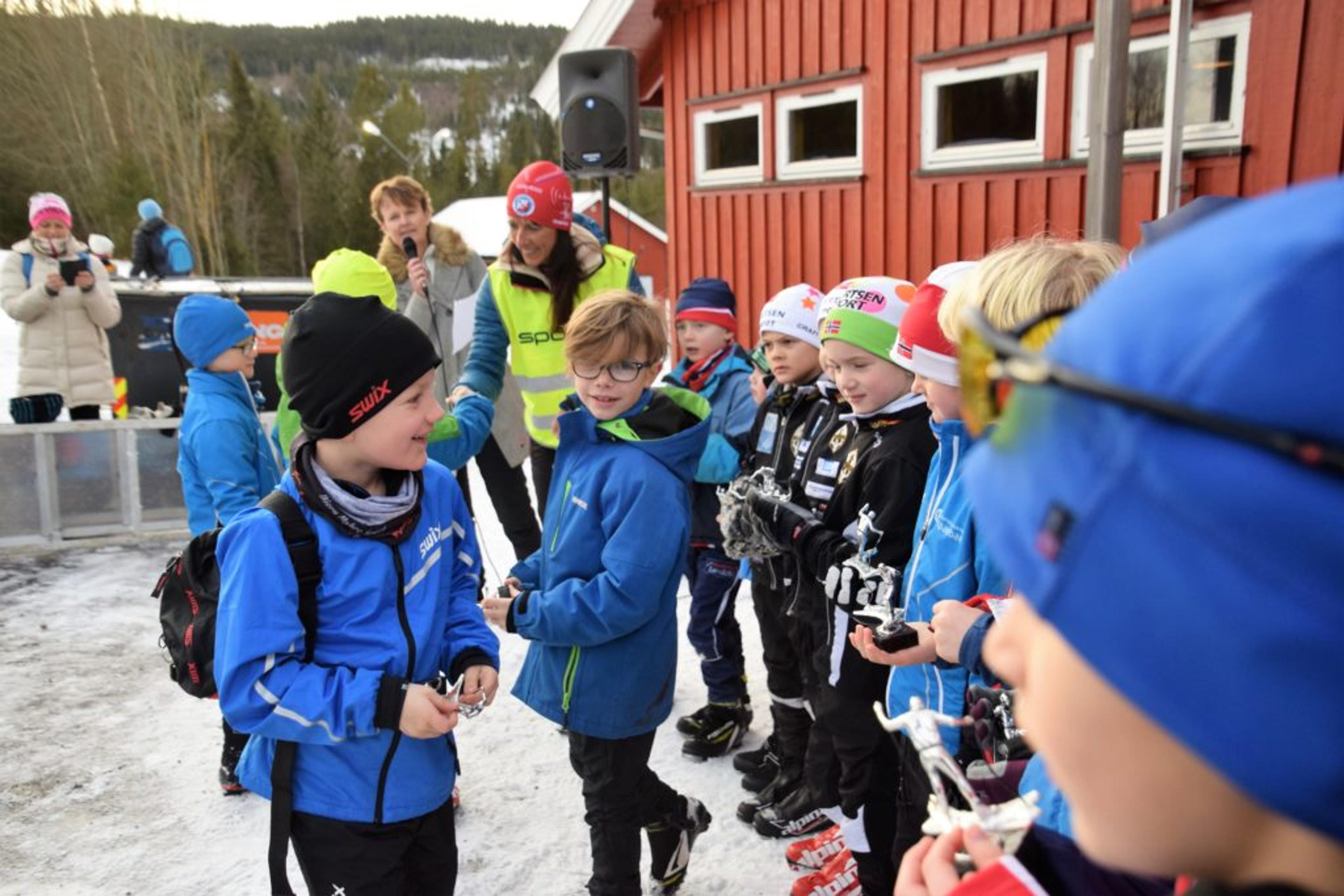 PREMIER TIL ALLE: Her får noen av de yngste sine velfortjente pokaler i Biborennet 2017. Foto: Stian Ormestad.