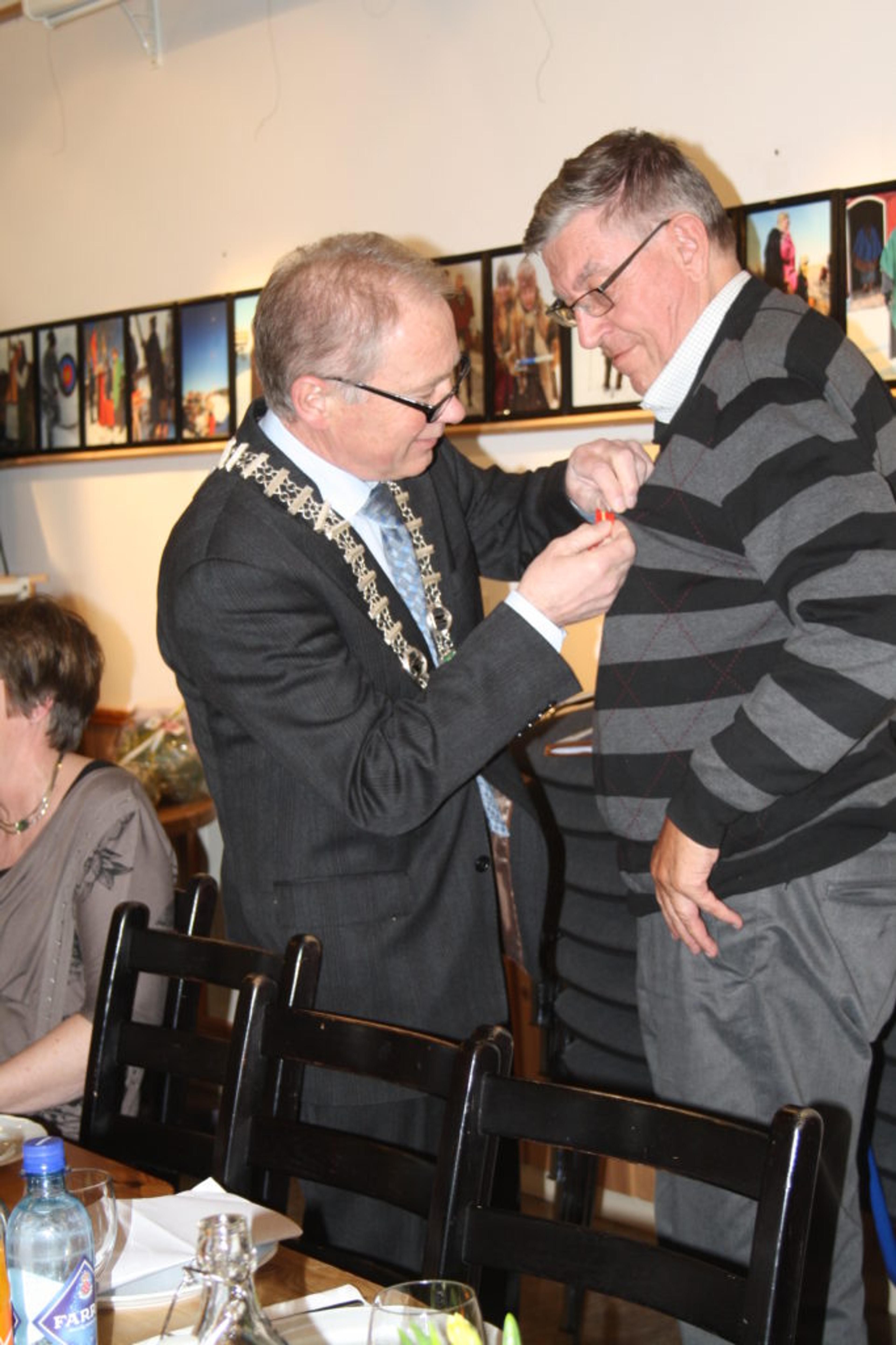 KONGENS FORTJENESTEMEDALJE: Ordfører Thorvald Hillestad fester medaljen på brystet til John Pedersen. Seinere fikk Pedersen audiens på Slottet. Foto: Håkon Westby.