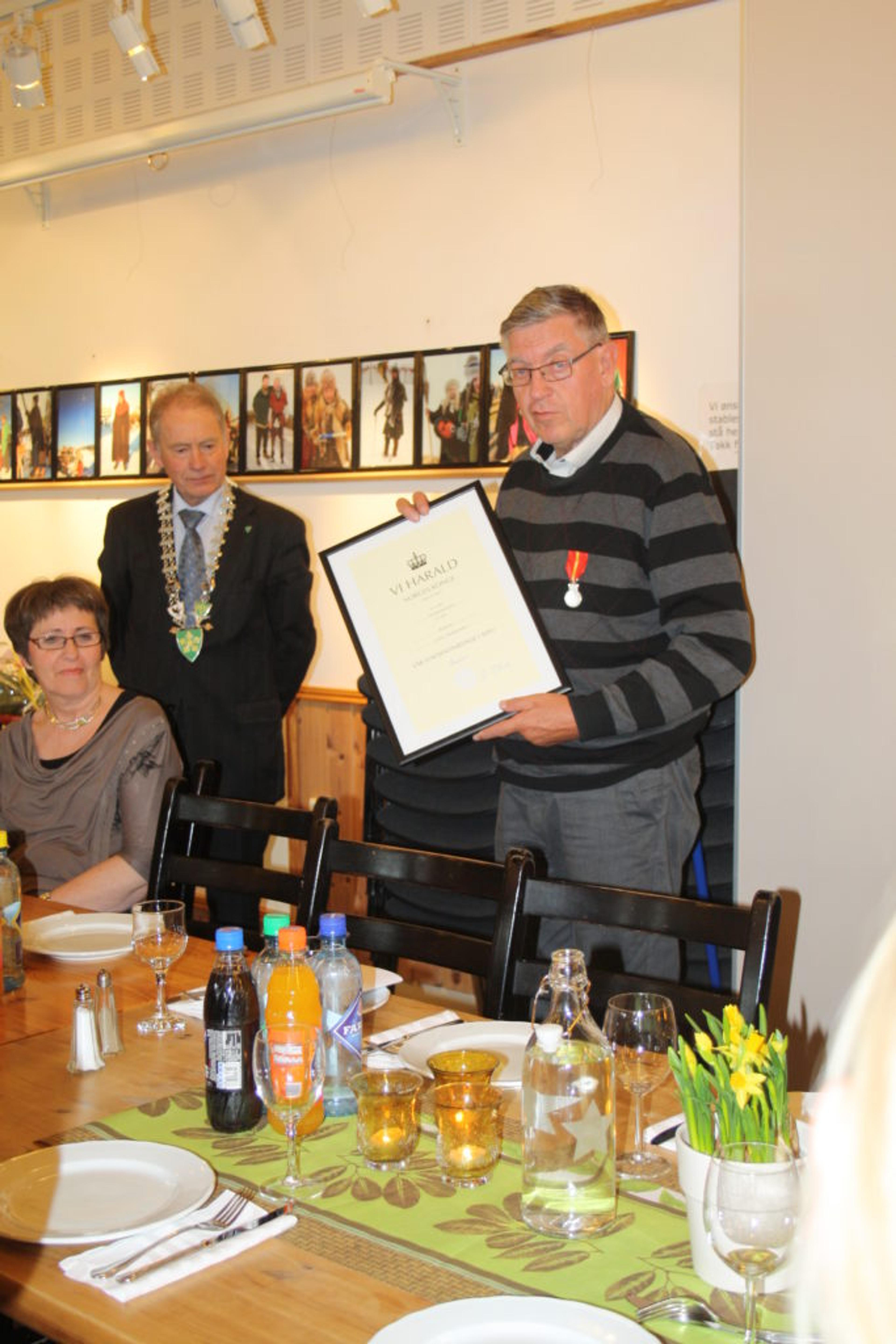 KONGENS FORTJENESTEMEDALJE: John Pedersen viser fram diplomen i glass og ramme. Foto: Håkon Westby.
