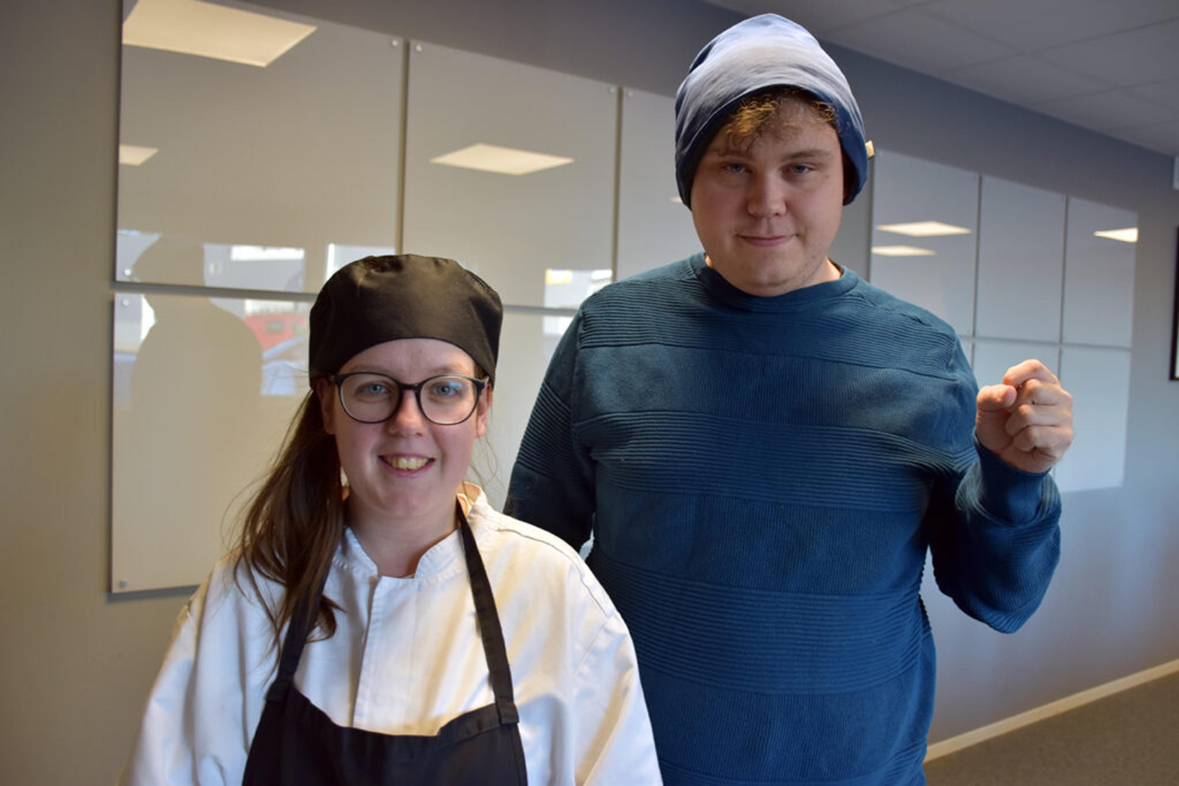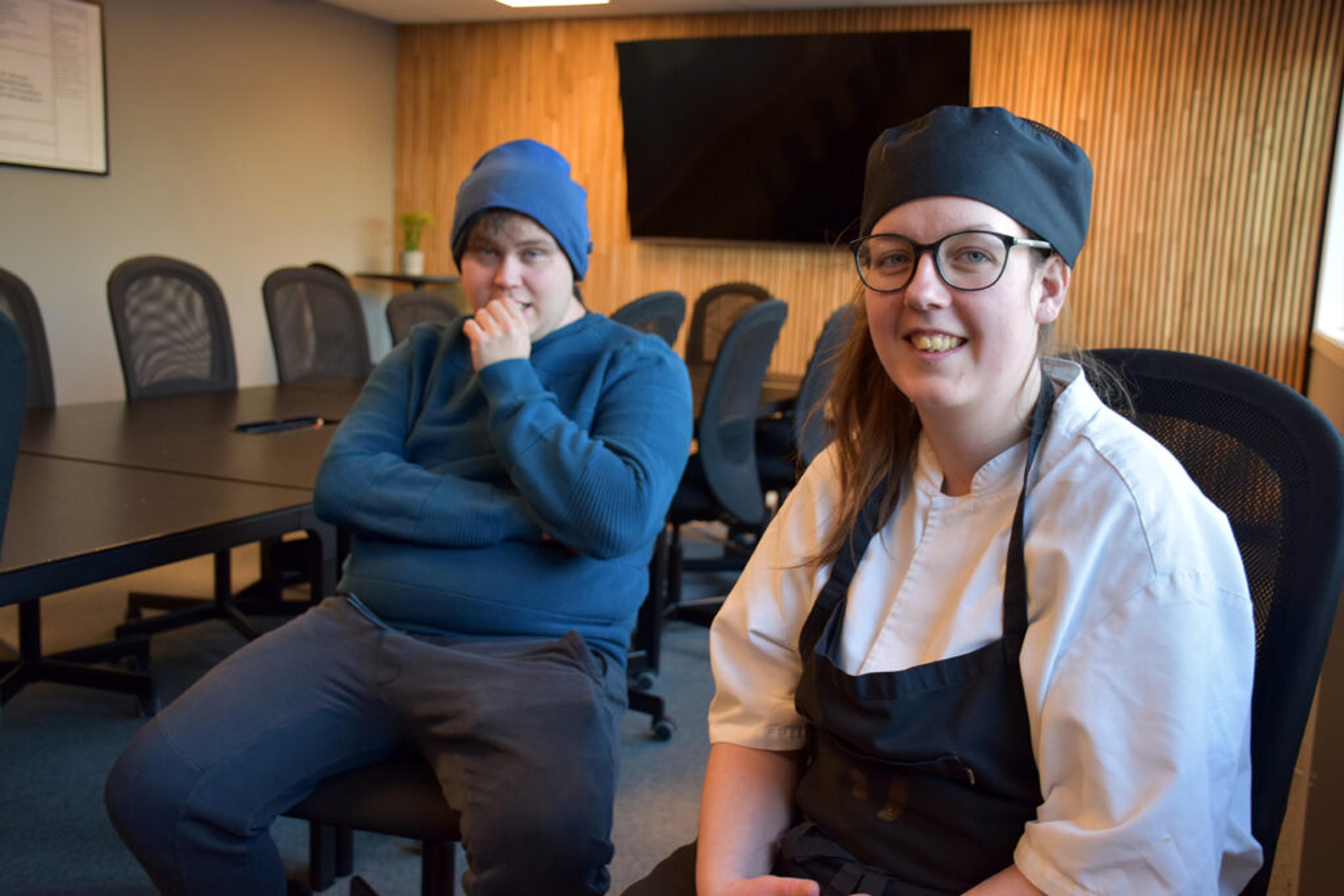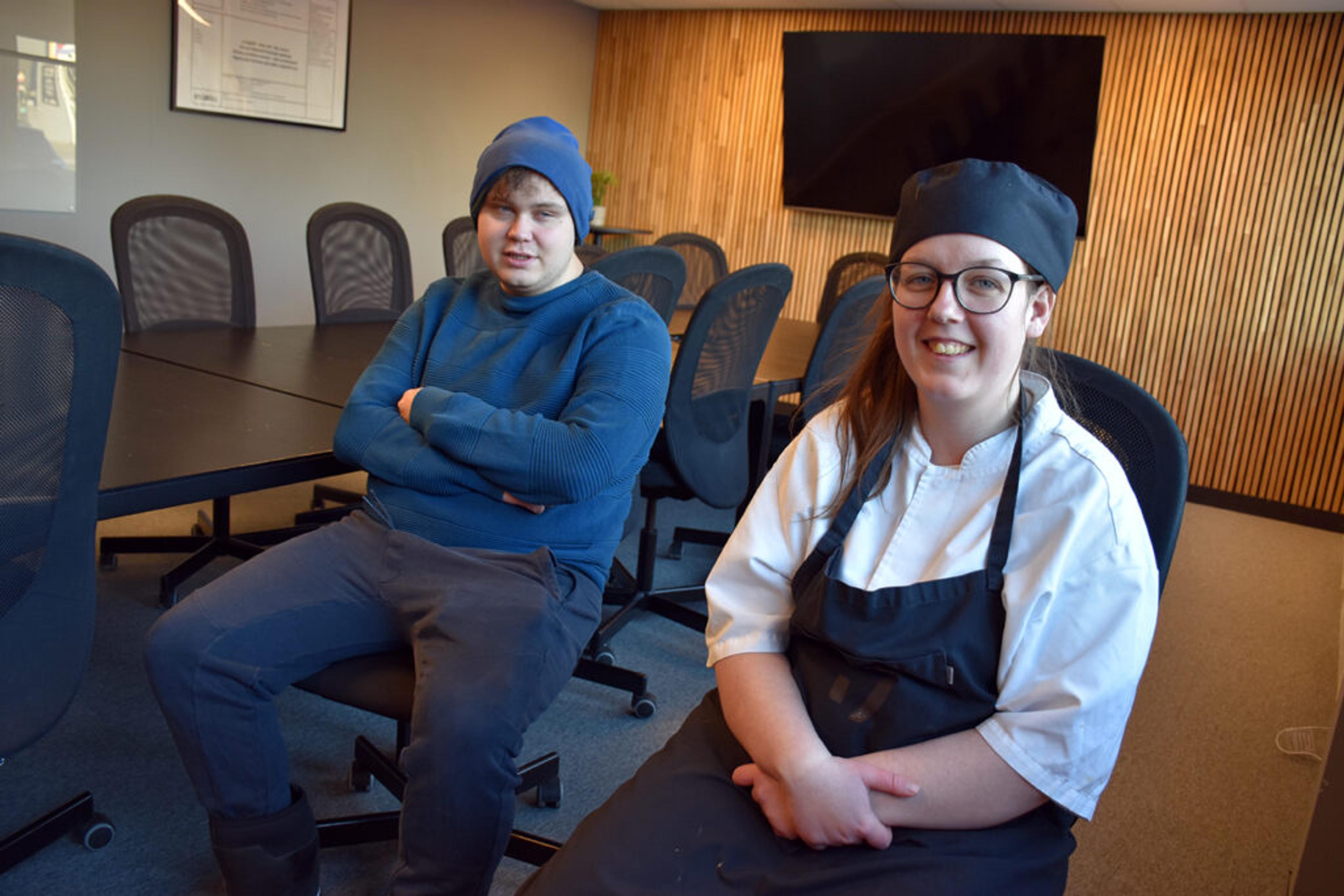 Jon tar seg fem minutters pause for å bli med opp til kantina for å møte sin TV-kollega Ingvill, som også tar seg en liten pause fra kjøkkentjenesten.