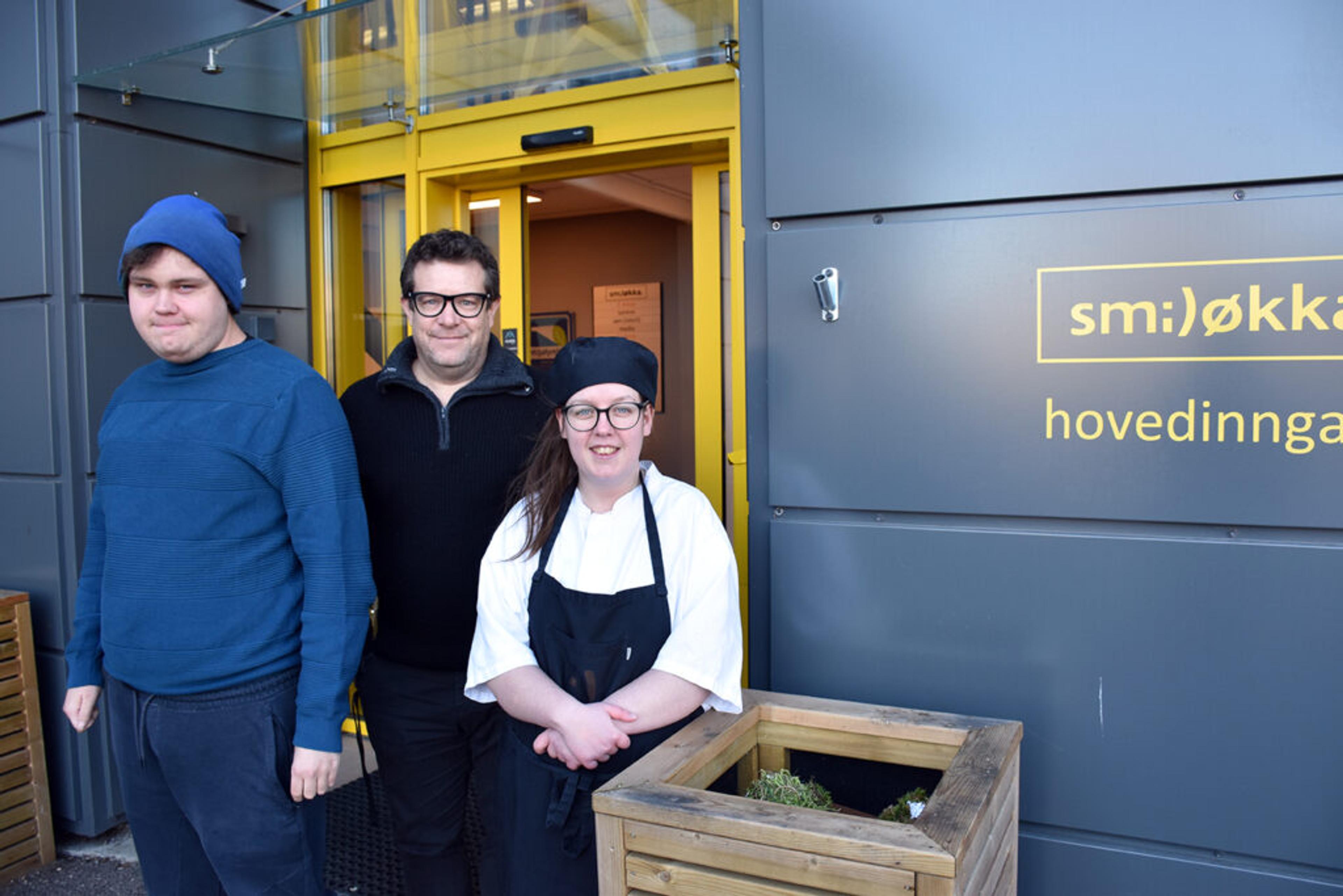 SMILØKKA ARENA: – Med god tilrettelegging kan alle gjøre hvilken som helst jobb, er tanken vår. Dette er en helt ordinær arbeidsplass med mange ansatte som har et tilretteleggingsbehov av en eller annen grad, forteller Simen Førsund, daglig leder, her sammen med to snarlig TV-kjendiser fra Re. Foto: Stian Ormestad, ReAvisa.
