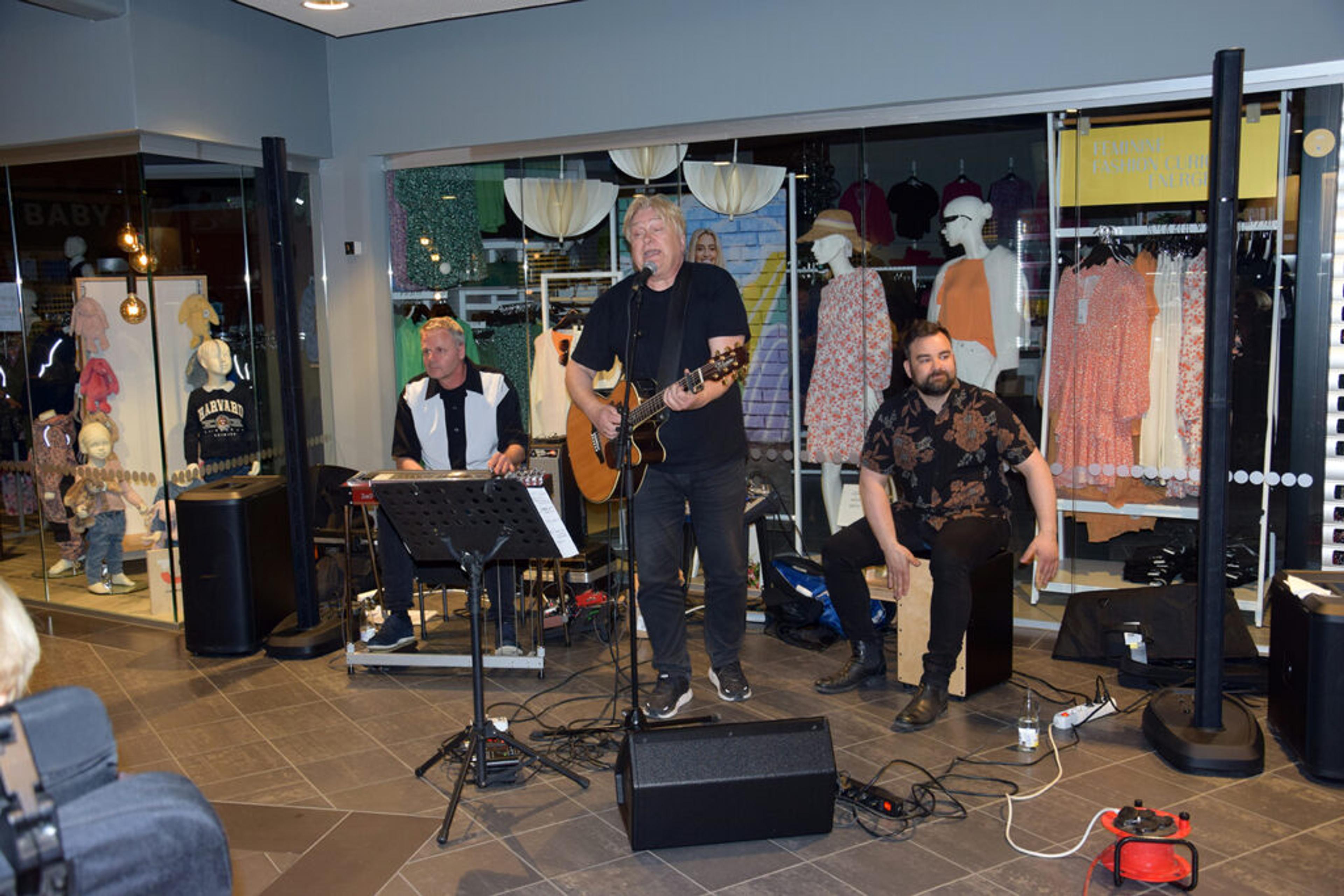 INTIMKONSERT: Kaffetid-scenen er ikke stor, og musikerne spiller midt blant publikummet. Det blir alltid en fin intim atmosfære. Fra venstre ser vi Tore Blestrud på pedalsteelgirar, Jørn Hoel på sang og gitar, og Alexander Pettersen på rytmeinstrumentet kahoon. Foto: Håkon Westby.