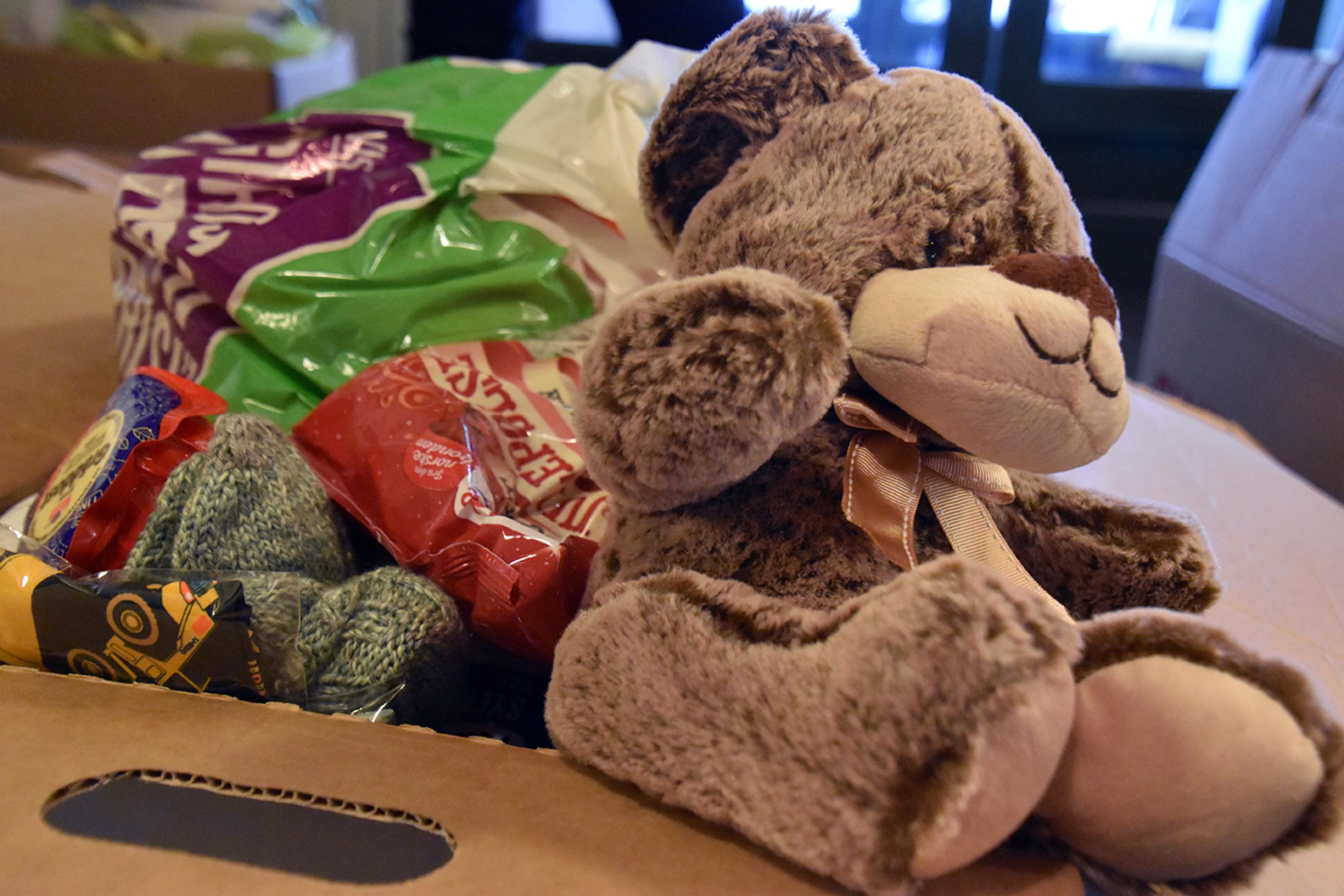 BAMSEFAR: Denne karen skal spre glede i et småbarnsfamiliehjem. Han henger med på lasset i en av mange ferdigpakka pappesker som står klare for å deles ut før jul. Foto: Stian Ormestad.