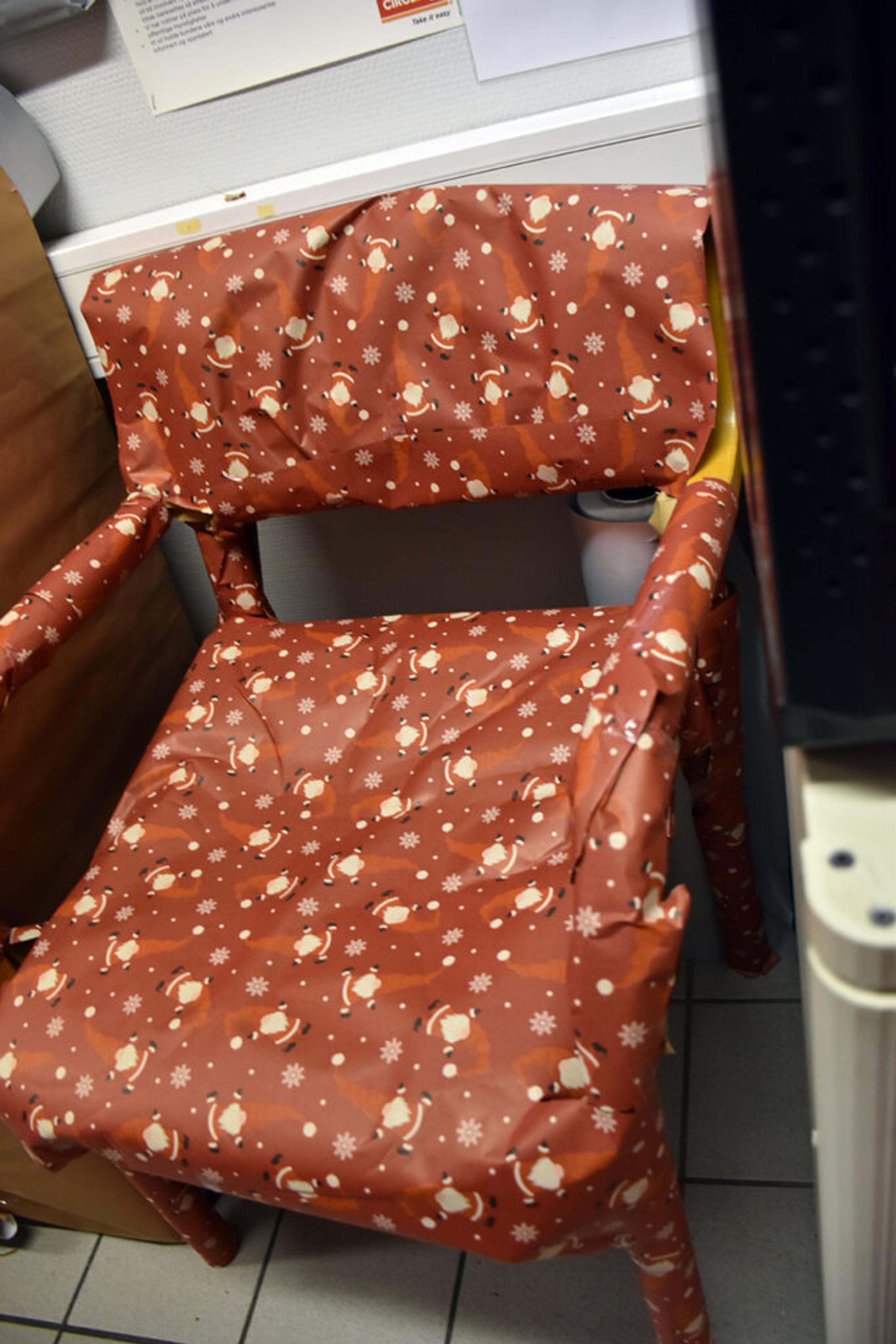 Et lite mesterstykke å klare å pakke inn en stol på dette mesterlige viset. Foto: Stian Ormestad, ReAvisa.