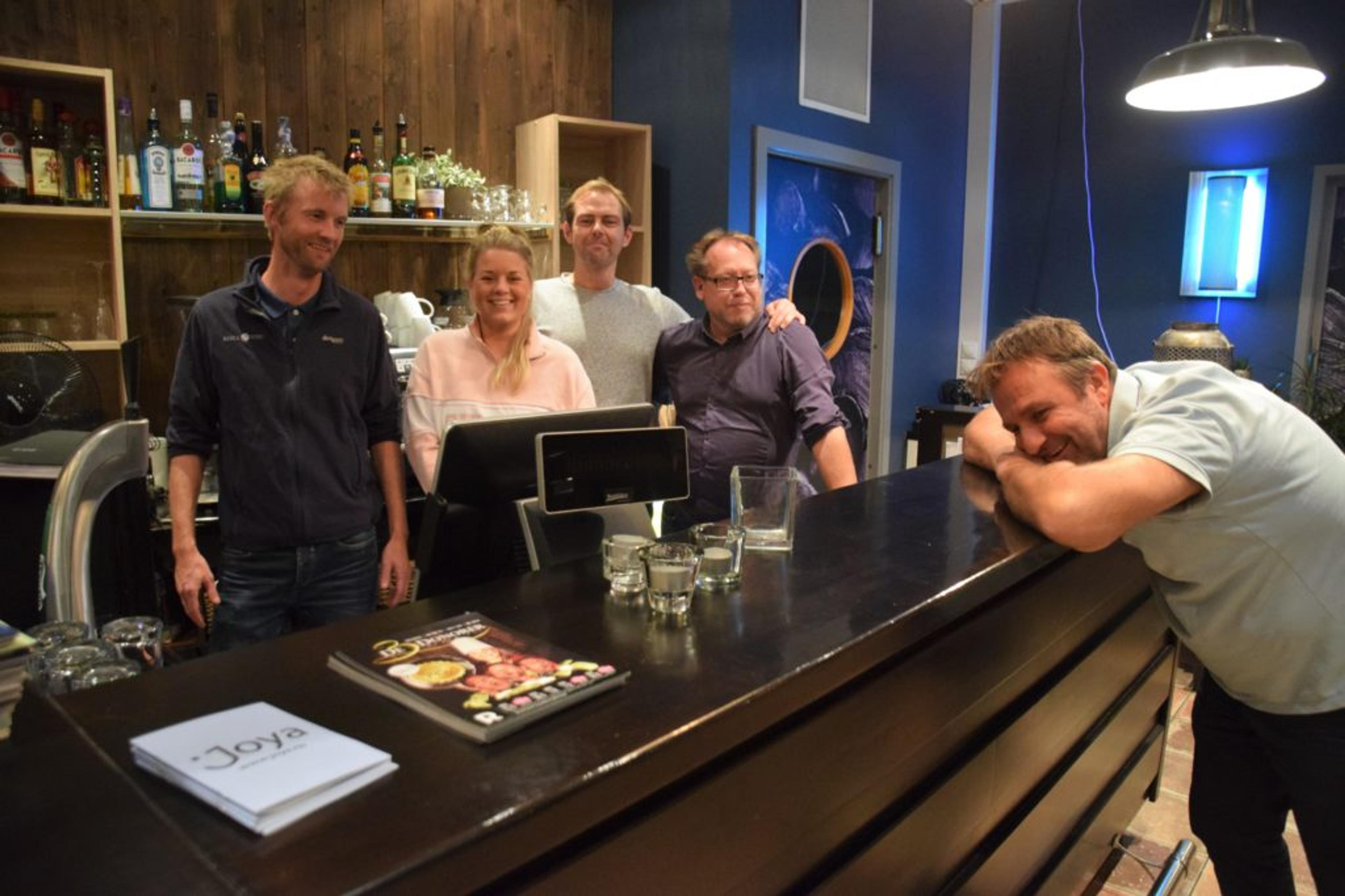 ROLLEBYTTE: Harald Bjerkesti Løken, Karen Marie Haraldsen, Tommy Anderson og Trond Magne Holth har inntatt baren, mens Restaurant-sjef Roger Noren prøver å få servering. Foto: Stian Ormestad.