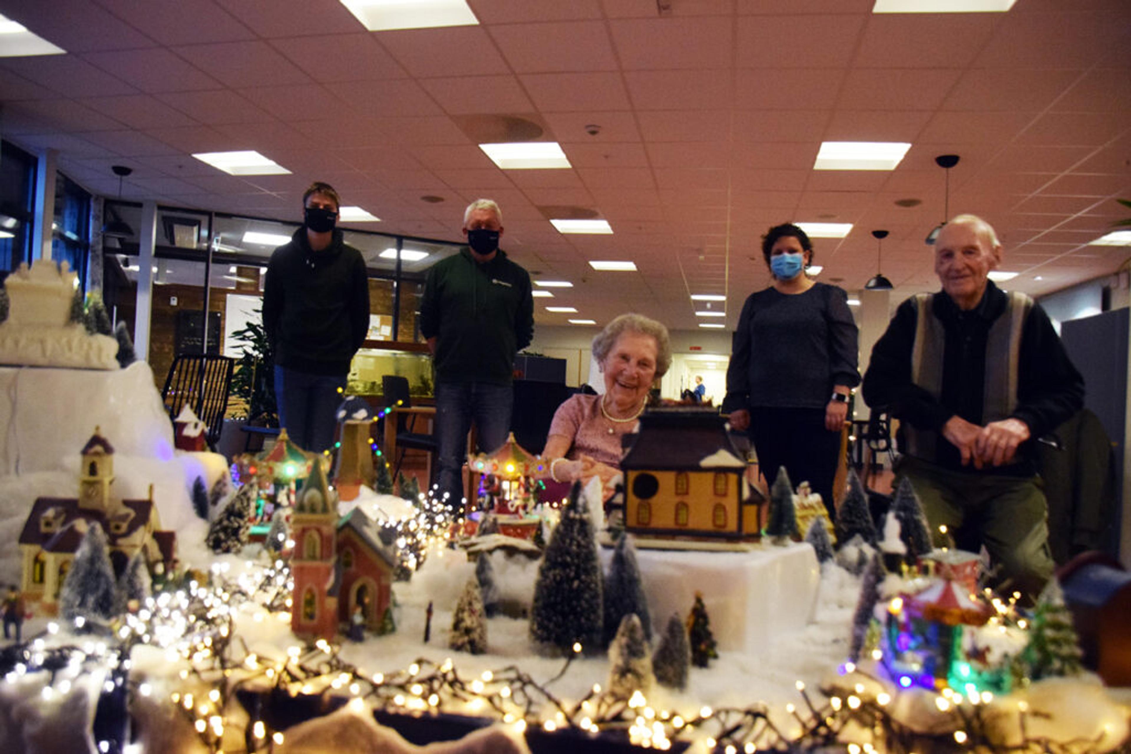 – VAKKERT! Re helsehus-beboerne Beret Knudsen (97) og Erling Klausen (100) beundrer den flotte julebygdebyen, som de tre bak med munnbind satte opp i dag formiddag: Iver Stamnes, Geir Mellingen og Margareth Horn. Foto: Stian Ormestad.