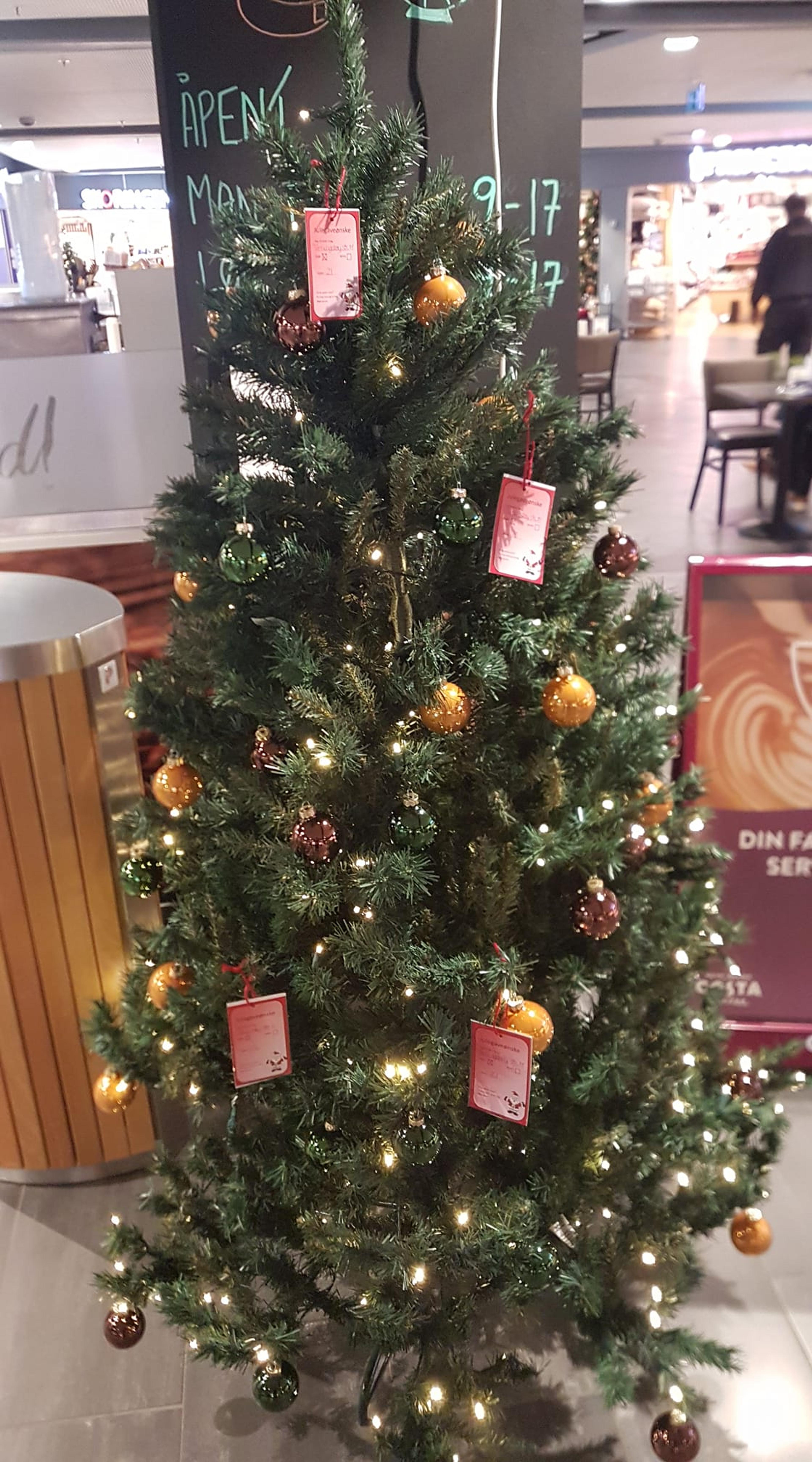 JULEGAVEINNSAMLING: Ønskelapper henger på juletreet i 2. etasje på Re-torvet, der folk kan plukke de med seg og kjøpe det som står på ønskelappen. Her var det bare fire igjen, dagen før årets julegaveinnsamling ble avslutta – de forsvant, også de fire siste ønskelappene av totalt over 200. Foto: Privat.