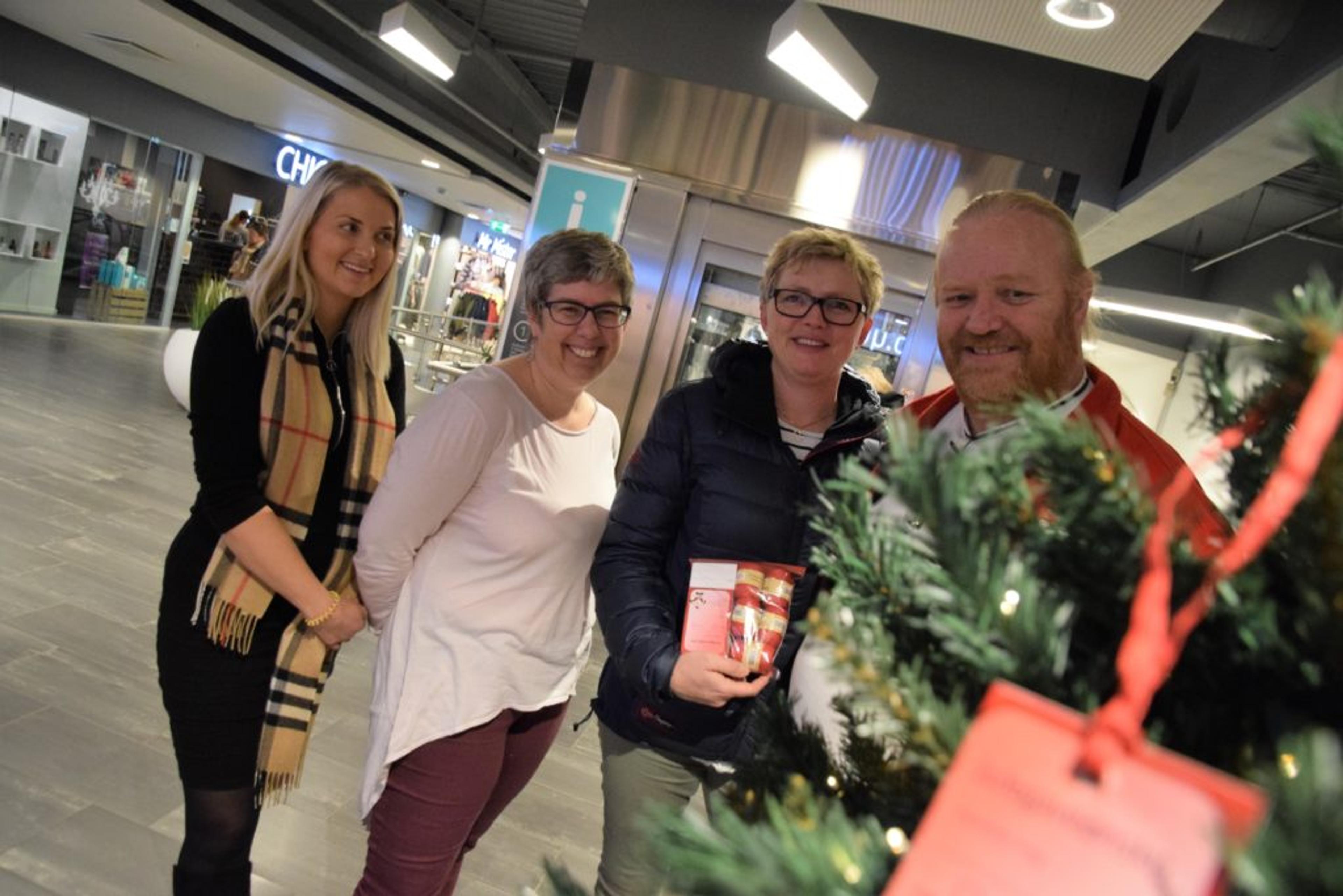 ORGANISATORER: Kine Schjølberg Tronrud tar i mot gaver i barneklær-butikken “Helt perfekt, Jennifer Tinnion Varholm er leder for Re Røde Kors sin julegaveinnsamling, Monica Holtan Fjeld koordinerer Re kommunes innsats, og Geir Varholm er leder for Re Røde Kors. Foto: Stian Ormestad.
