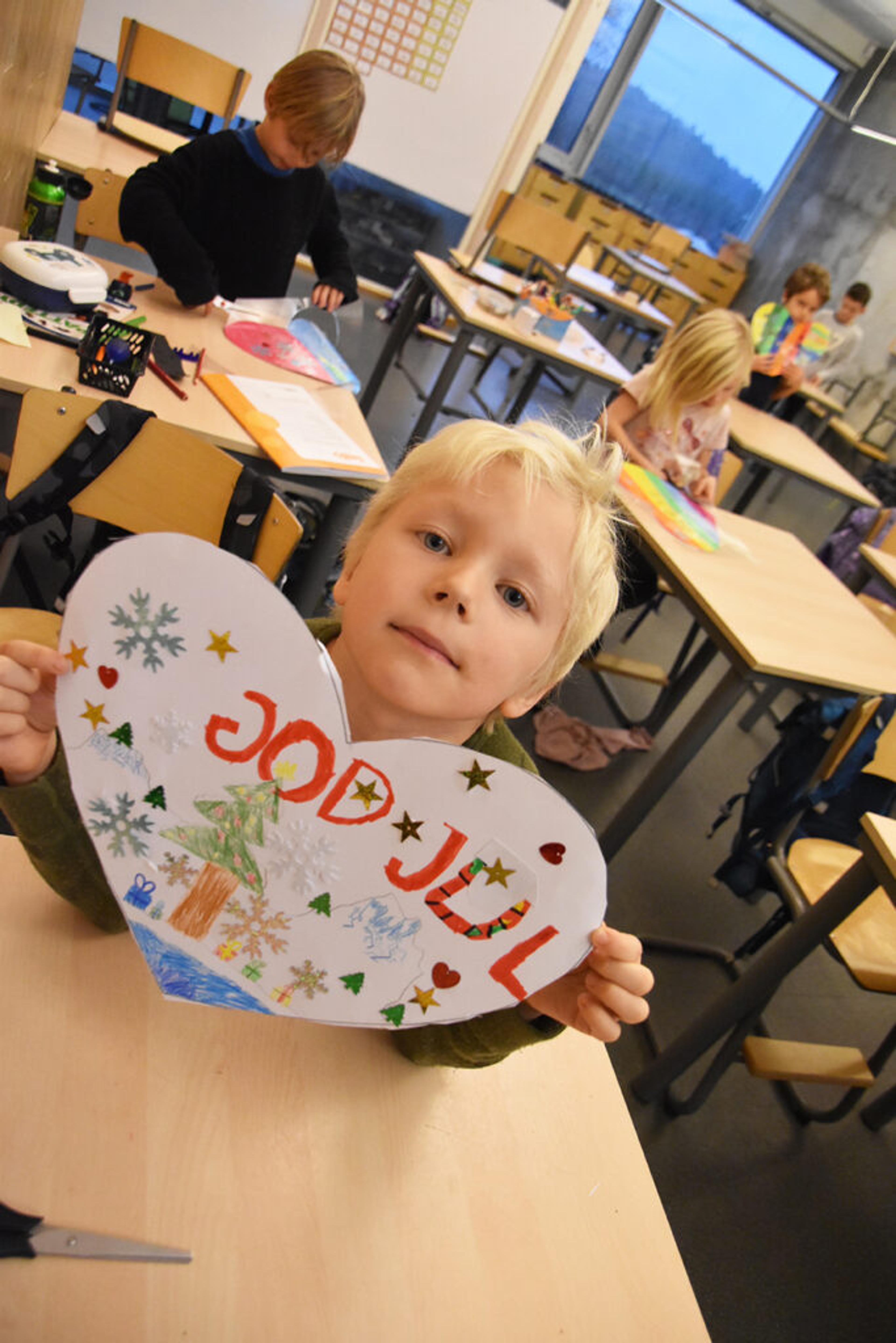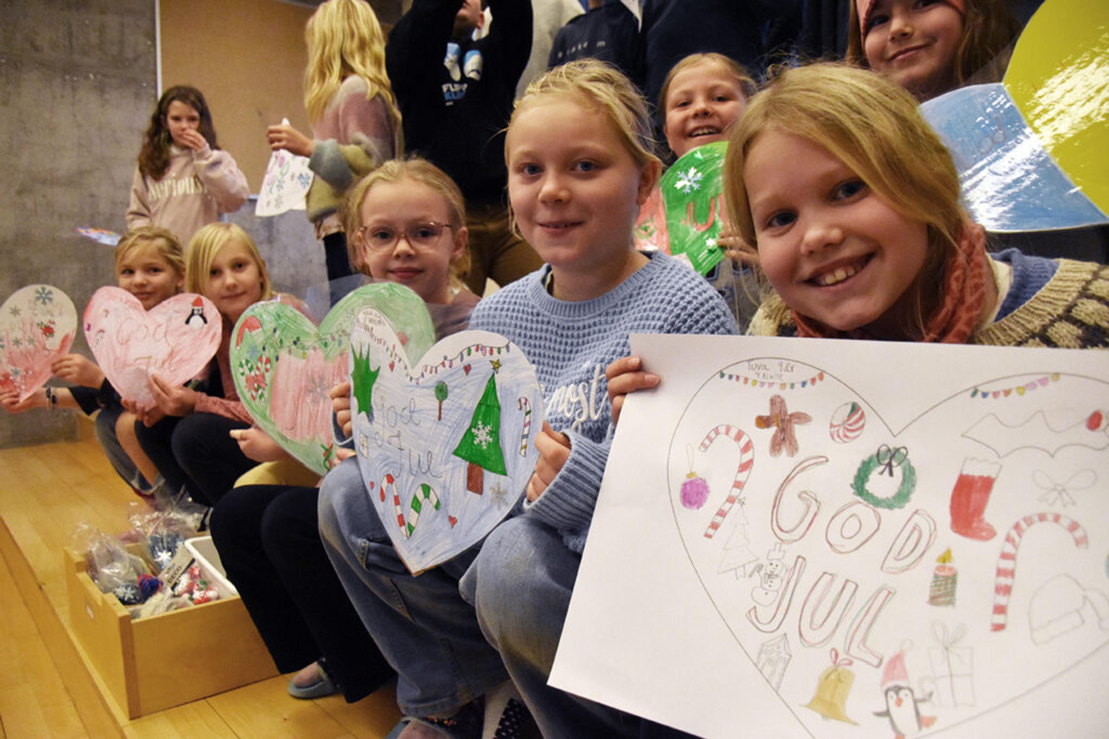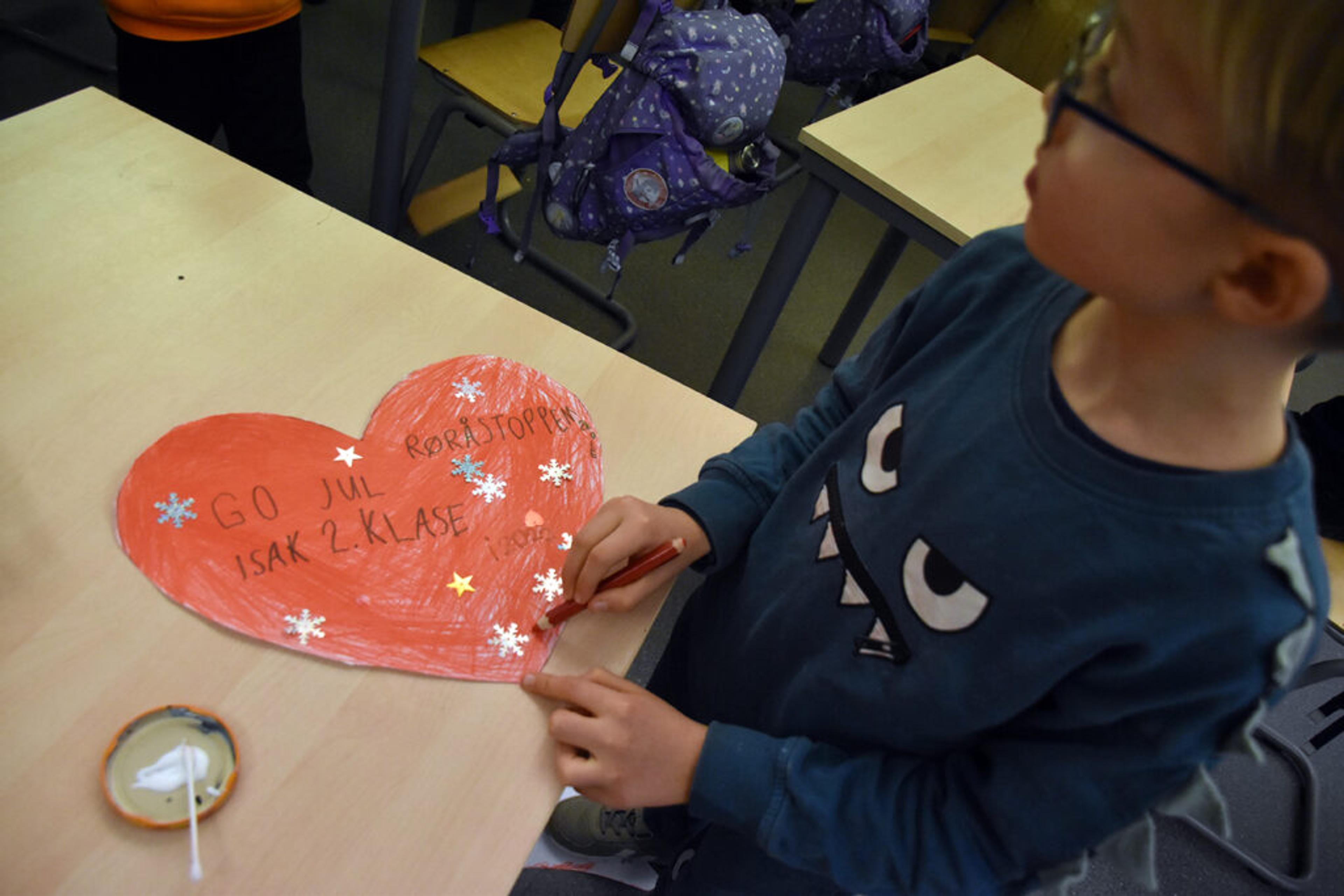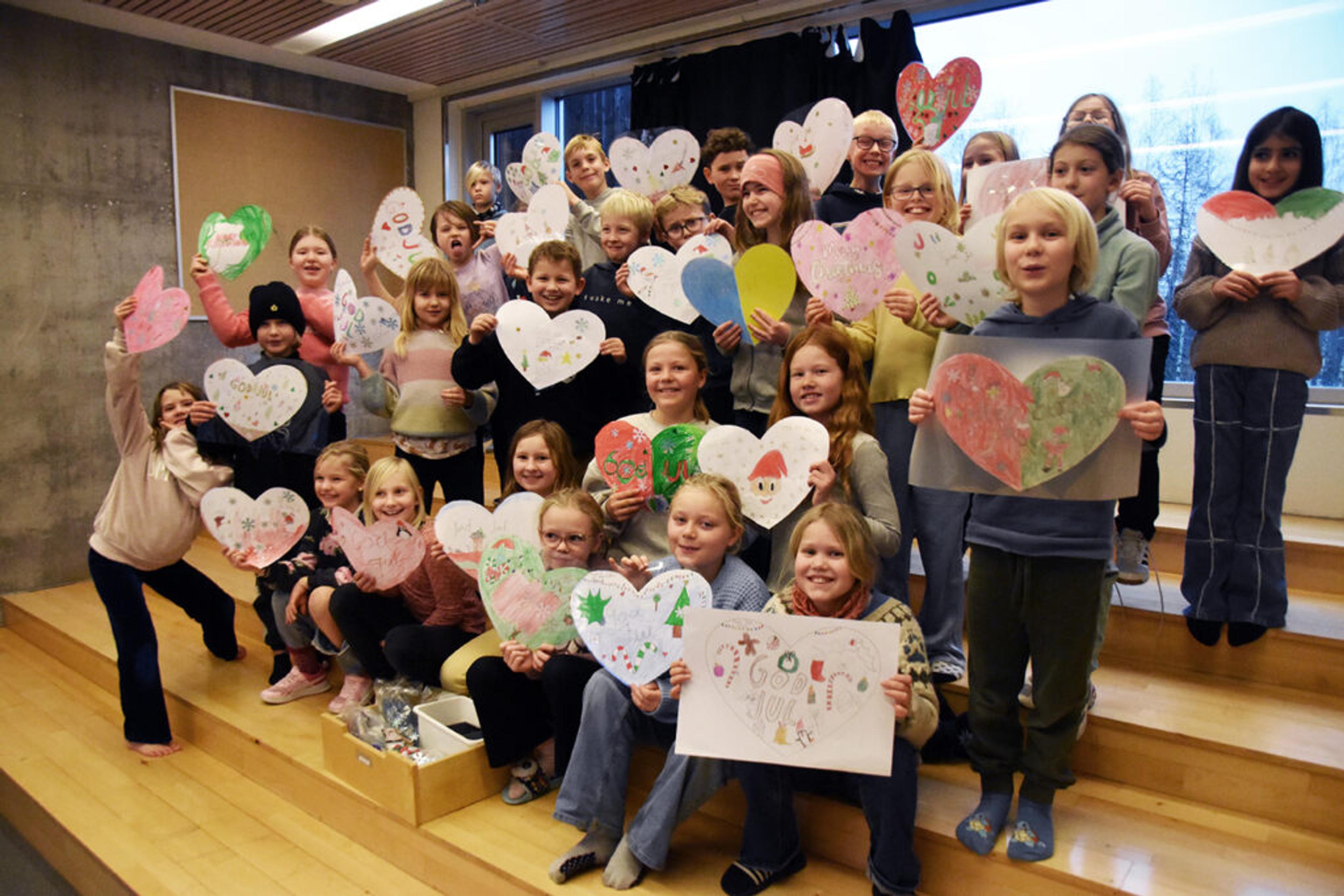 GOD JUL! En hjertelig god jul, ønsker 4. klassingene ved Røråstoppen skole med sine ferske kunstverk i hjerteform. Foto: Stian Ormestad, ReAvisa.