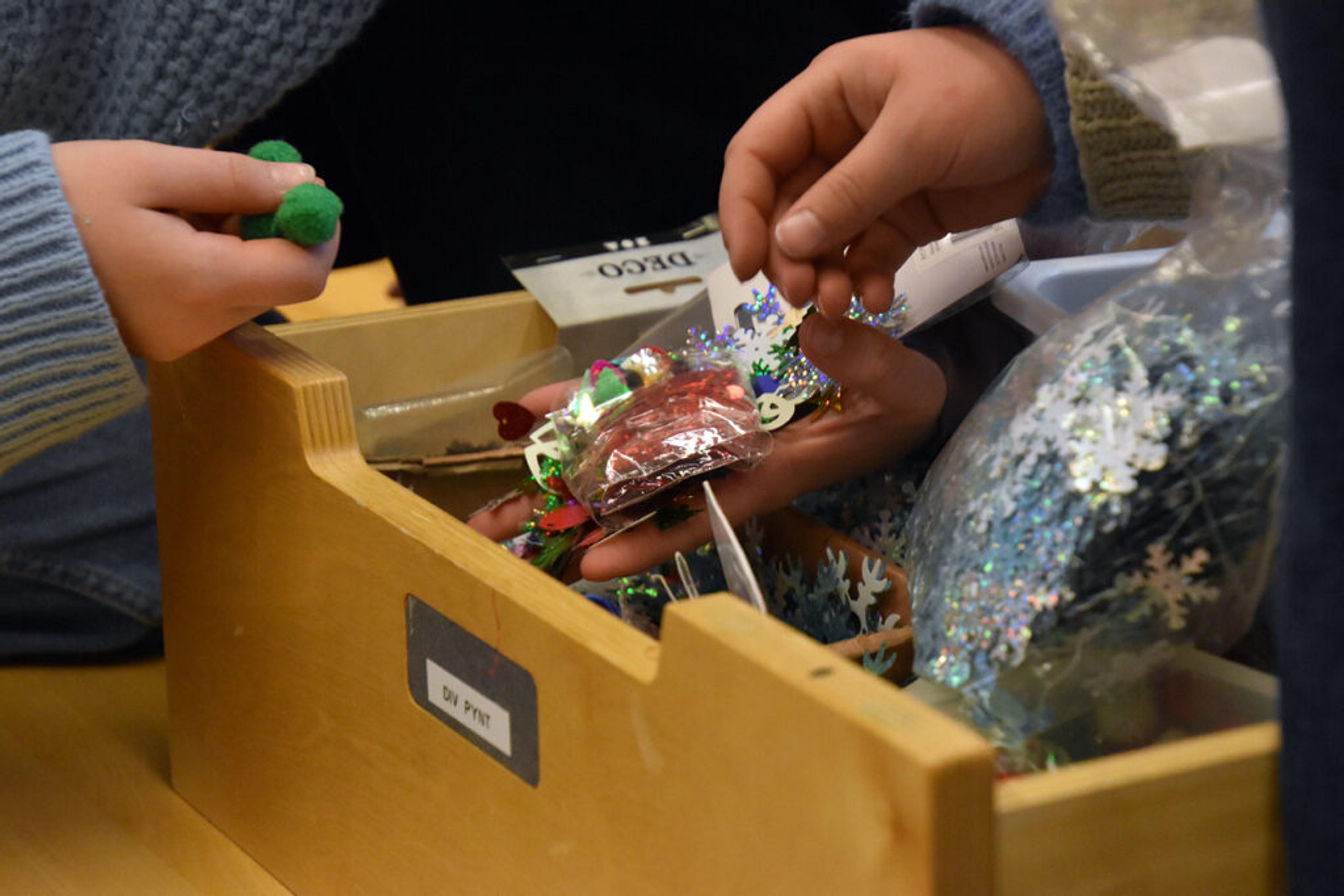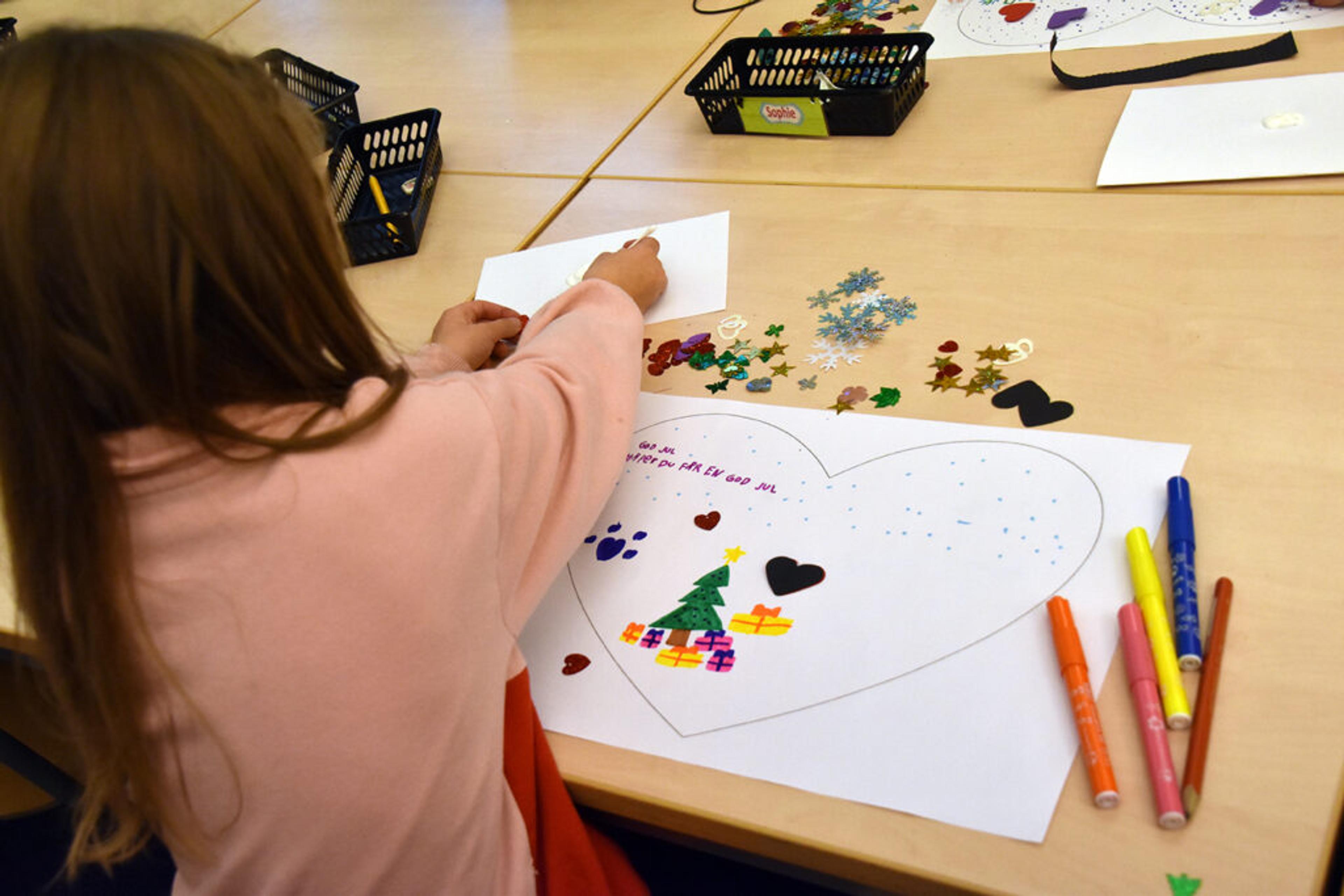 Marko på SFO løper att og fram og får logistikken til å gå opp med papir, pynt, laminering, klipp og lim. En ide, et morgenmøte, en travel fredag – og snart er hjertene oppe.