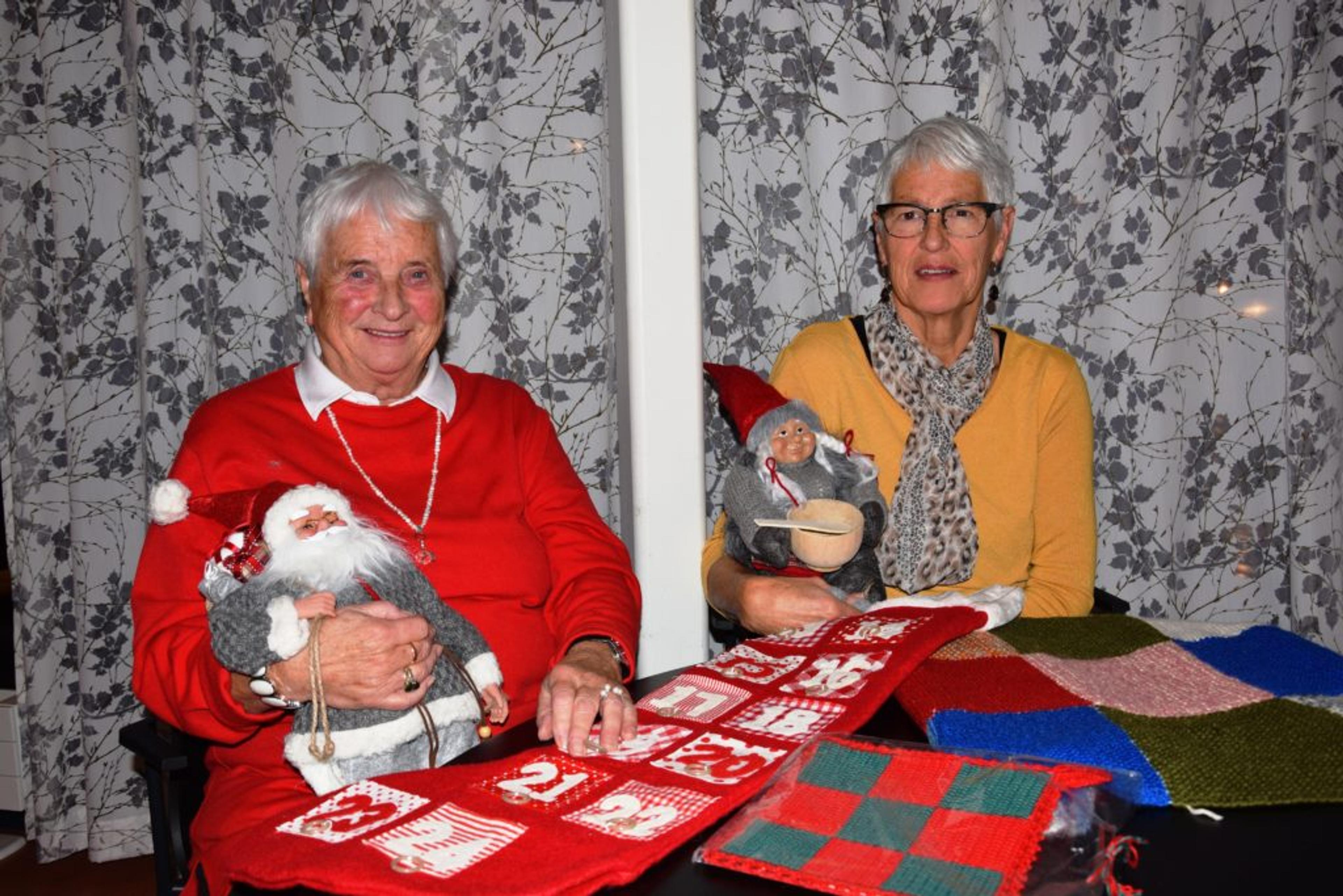 KLARE: Torill Trollsrud og Signe Svinsholt fra Hjerpetjønn sanitetsforening viser fram litt av det som skal loddes ut på salgsmessa. Foto: Håkon Westby.