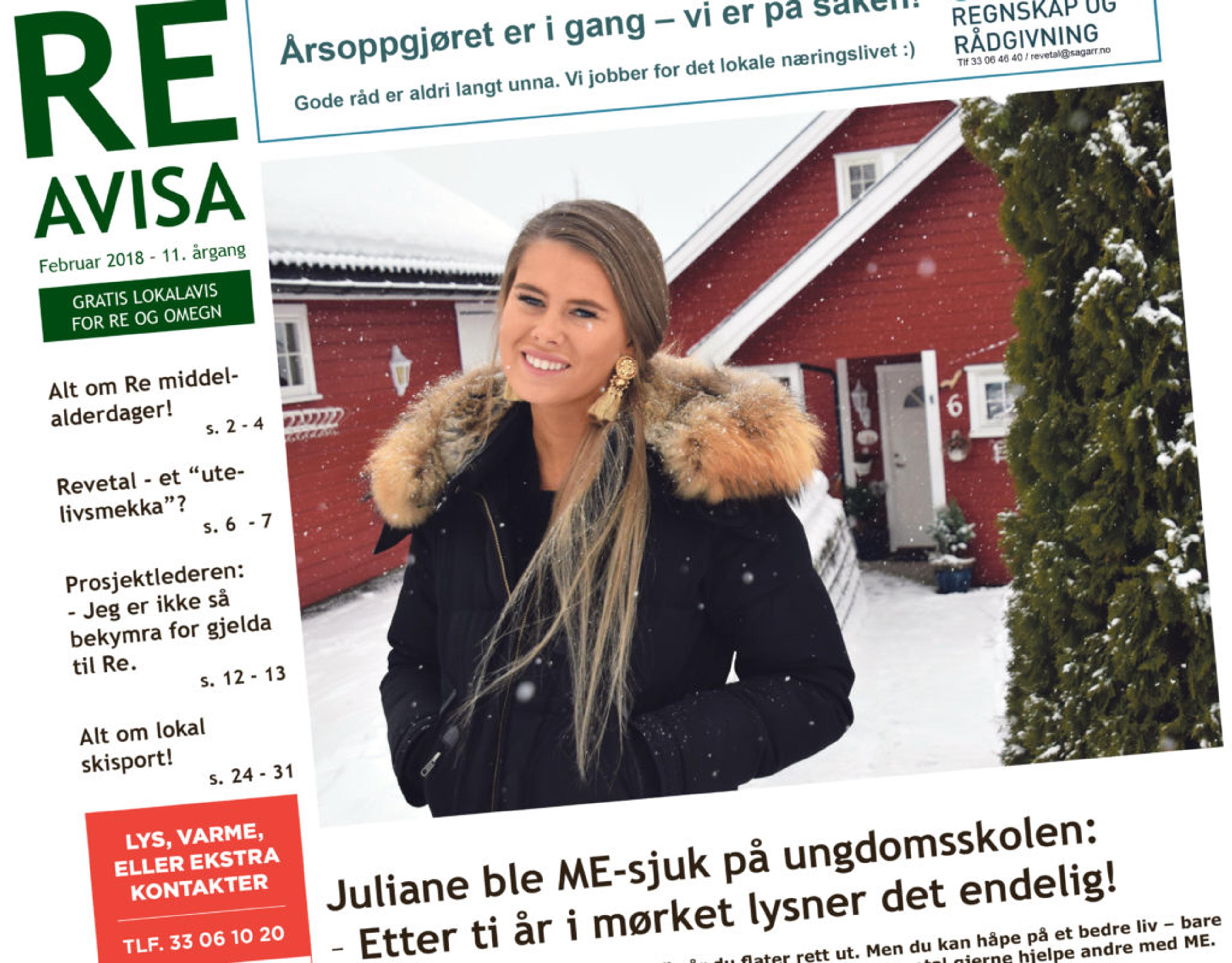 NY UTGAVE AV REAVISA! Torsdag 8. februar 2018 ligger ReAvisa i postkassene i Re og omegn – og avisa kan hentes der folk møtes på butikker, restauranter og bensinstasjoner – gratis. Og den kan lastes ned her på nettavisa ReAvisa.no. Faksimile: ReAvisa, februar 2018.