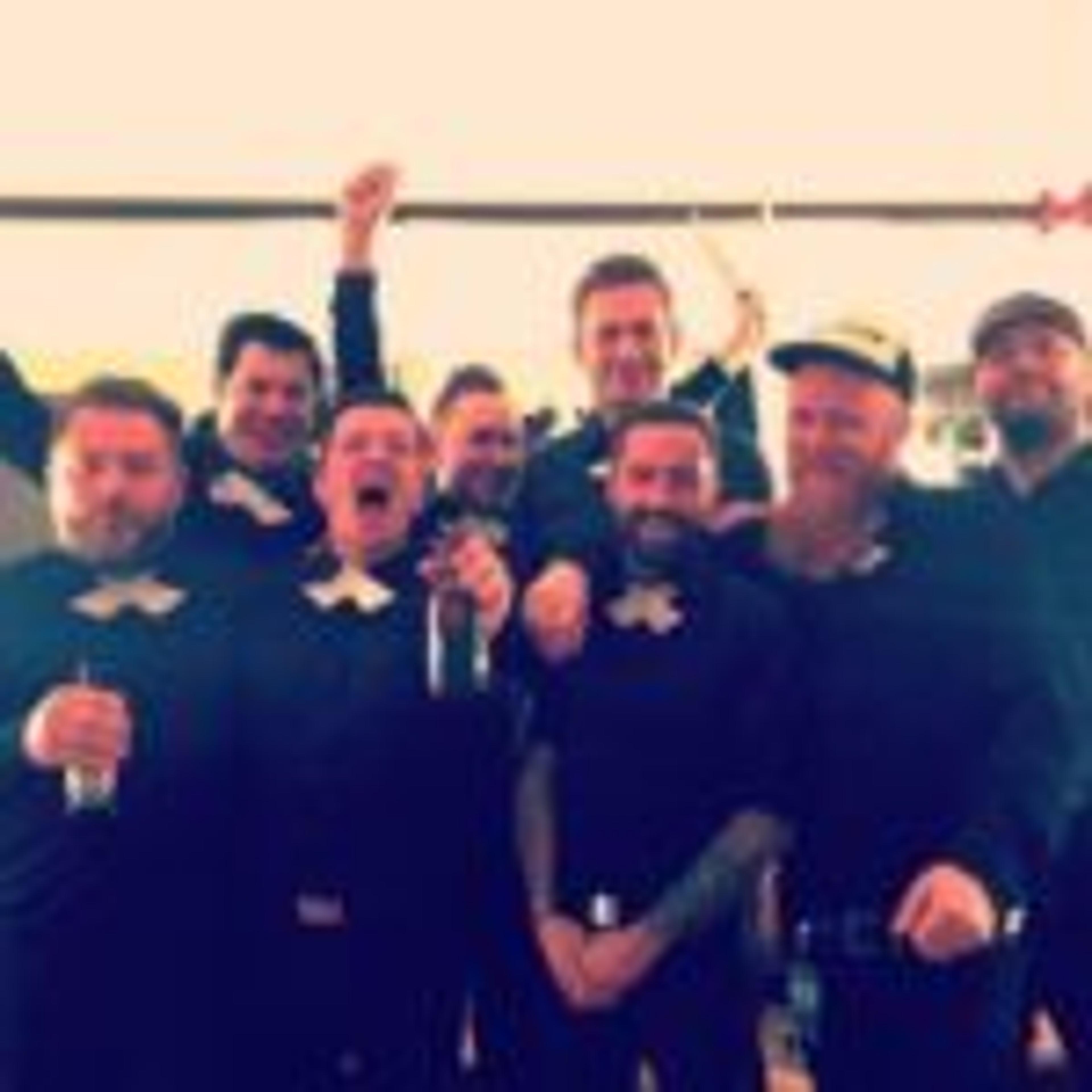 THE DOGS: Sjøl om Junge ikke er midtpunktet under konserten, er han det backstage sammen med bandet. Her med The Dogs, med vokalist Kristopher Schau rett bak Junge. Foto: Privat.