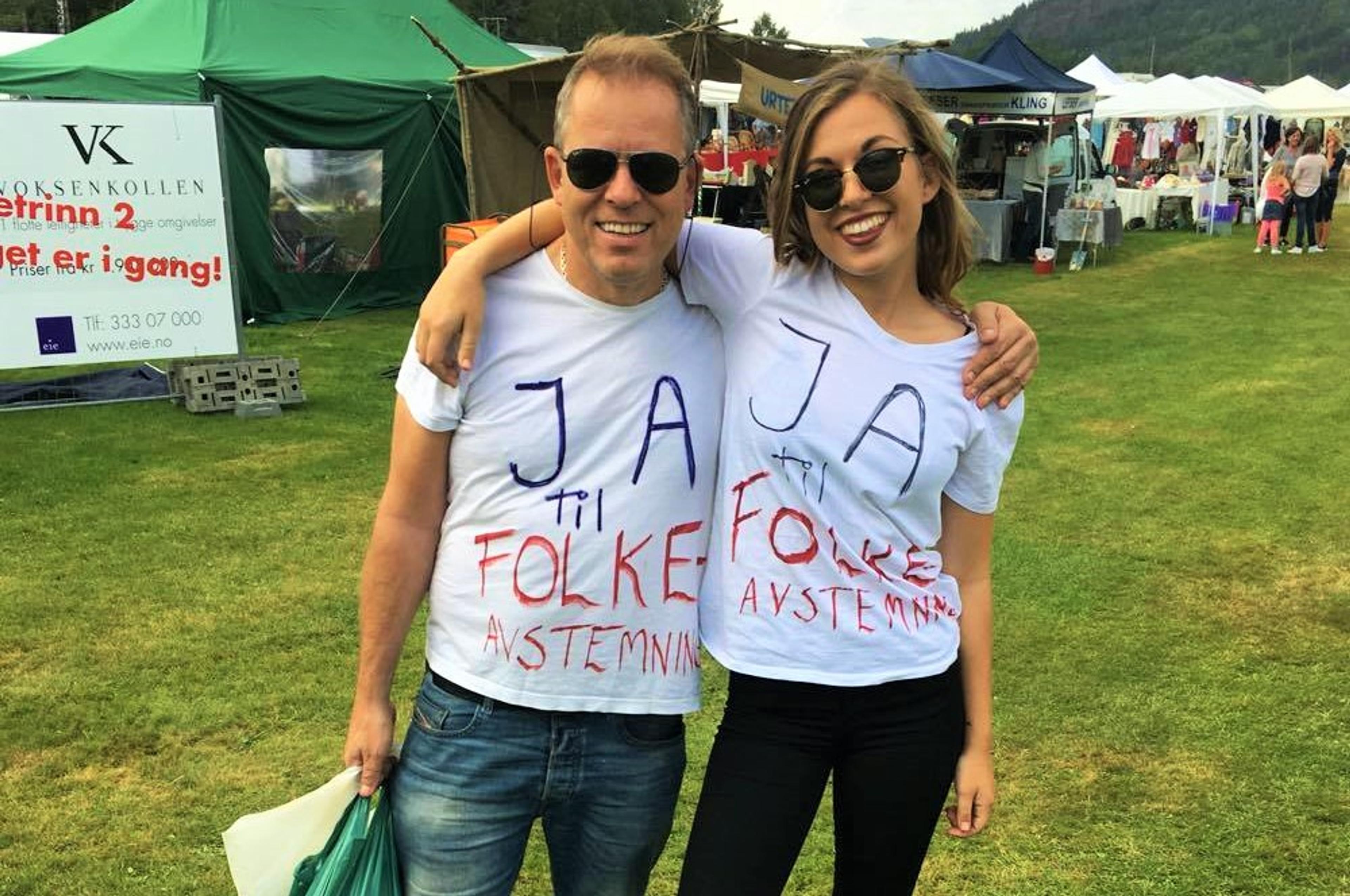 JA TIL FOLKEAVSTEMNING: Og det budskapet står ved lag fortsatt, mener Frank Wedde. Her sammen med sin datter Jenny, under en spontan-demonstrasjon under Vivestad høstmarked for fem år siden. Foto: Privat.