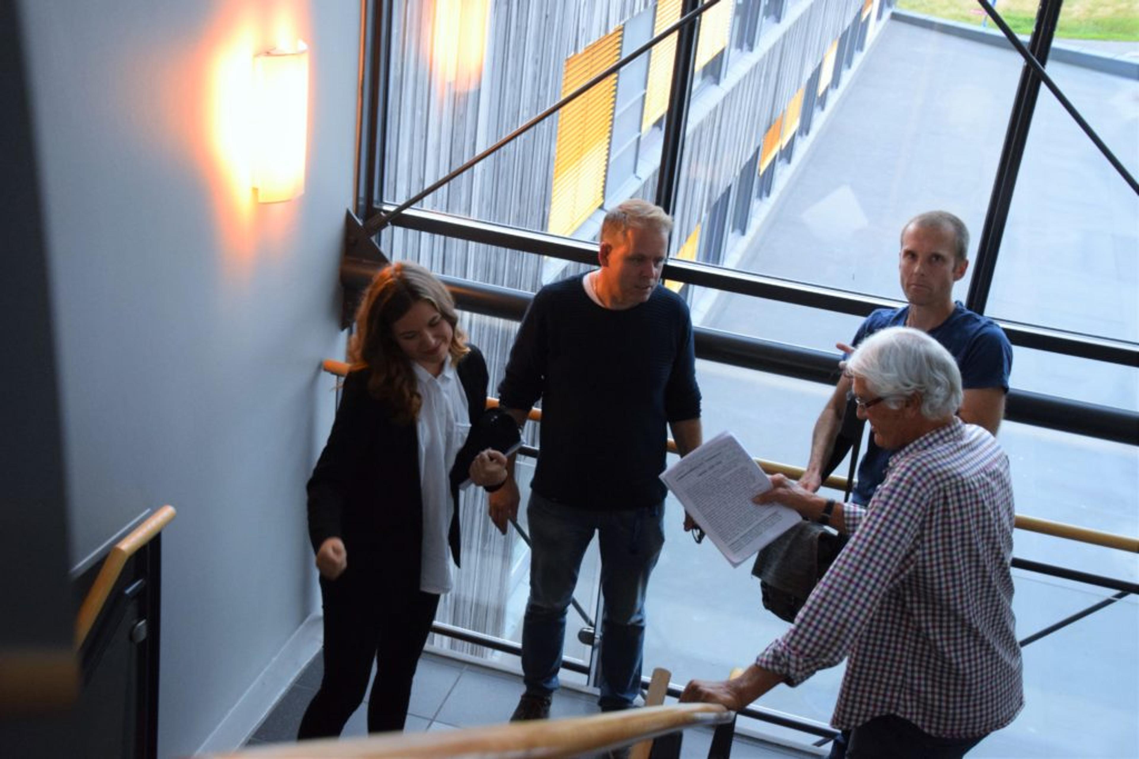 MØTE I TRAPPA PÅ KOMMUNEHUSET: Jenny Wedde, Frank Wedde, Arne Nåtedal og Knut Høydal samler trådene etter å ha talt flertallsmakta midt i mot i åpen post i kommunestyremøte høsten for fem år siden. Arkivfoto: Stian Ormestad.