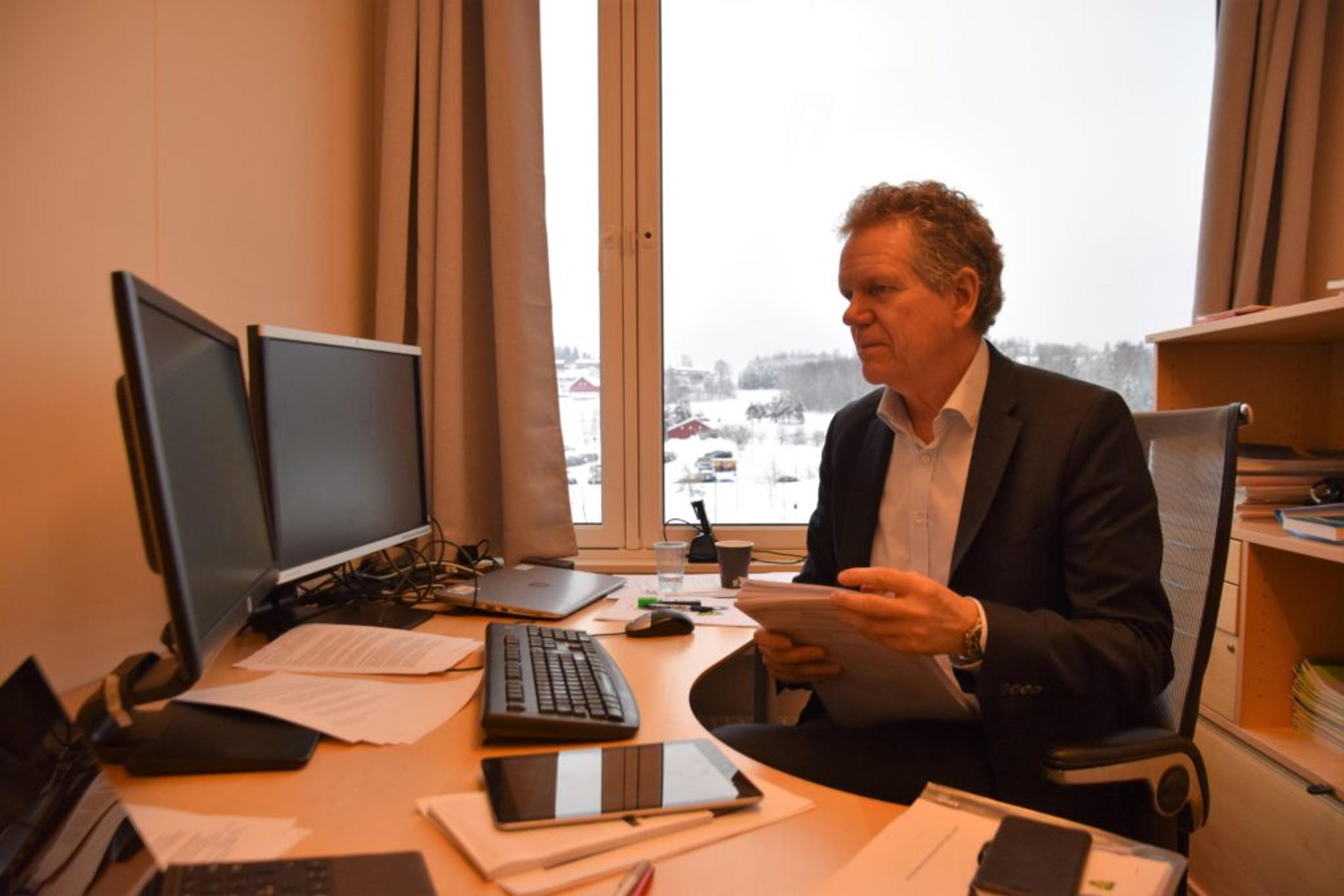 HJEMMEKONTOR: Rådmann Egil Johansen er satt i karantene etter fotballtur til England sist helg. Her avbildet på kontoret på Revetal ved en tidligere anledning. Arkivfoto: Stian Ormestad.