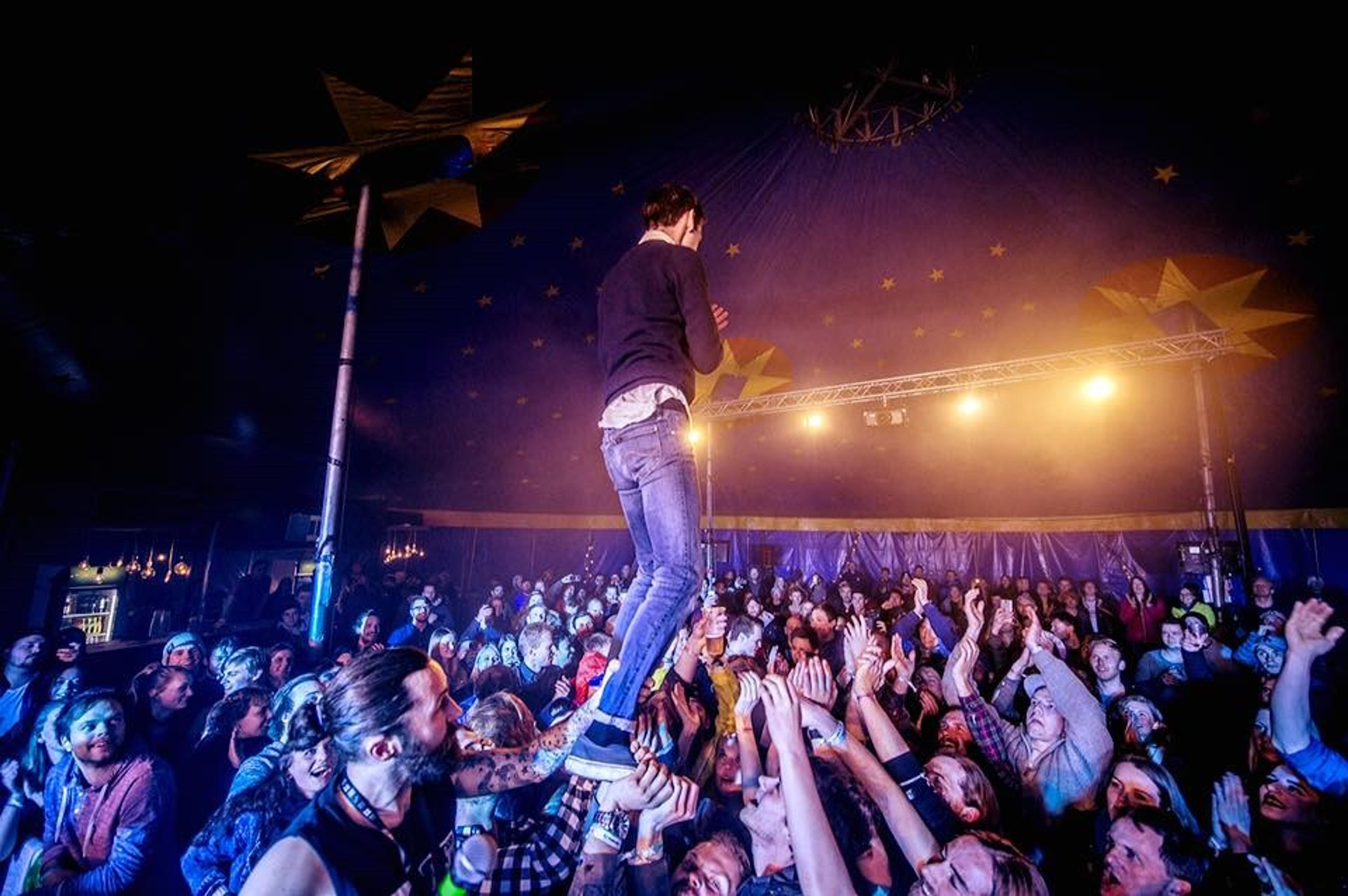ROCK’N ROLL: Christian Junge (36) foran Kongescenen, der han tar i mot Honningbarna-vokalisten på fjorårets Slottsfjellfestival. Dette bildet ble kåra til Årets Konsertbilde 2016 av Norske Konsertarrangører. Foto: Tom Lund.