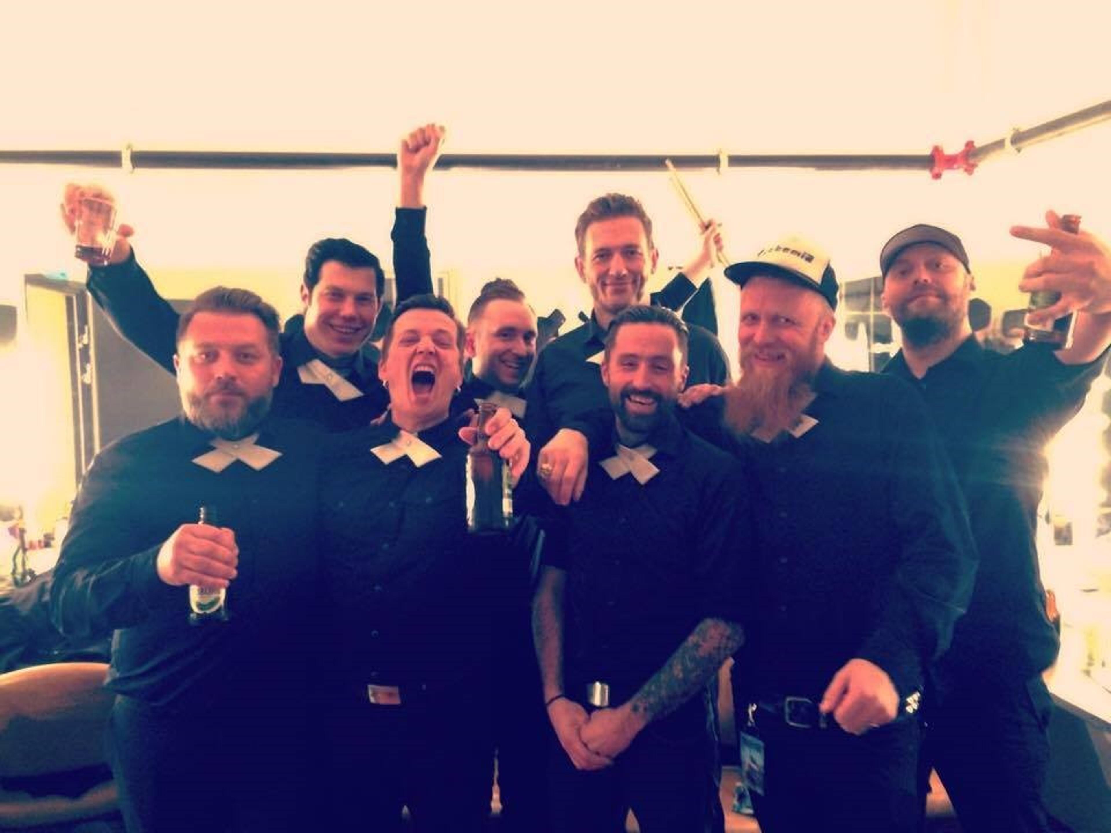 THE DOGS: Sjøl om Junge ikke er midtpunktet under konserten, er han det backstage sammen med bandet. Her med The Dogs, med vokalist Kristopher Schau rett bak Junge. Foto: Privat.
