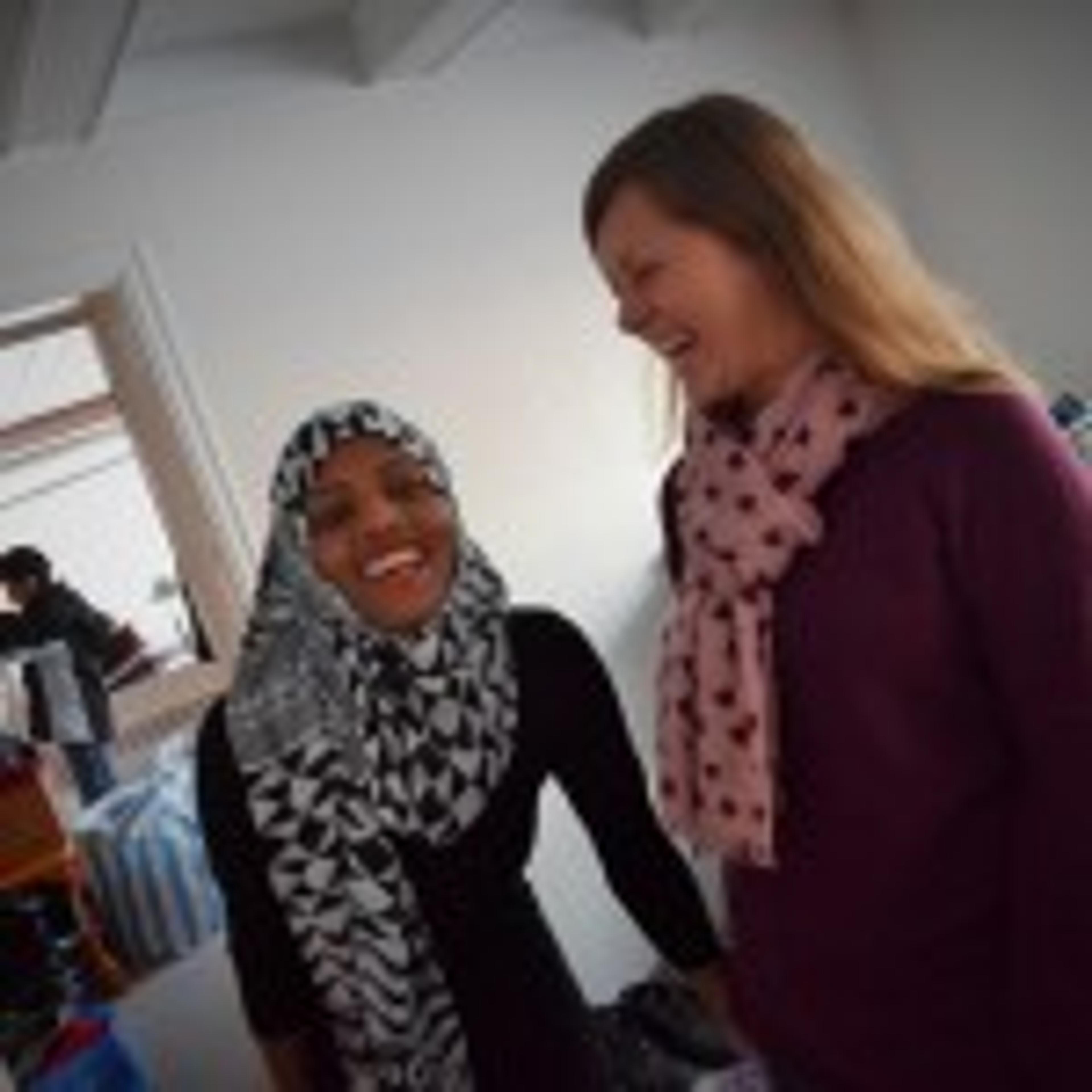 TUSEN TAKK! Mariam Mohammed fra Etiopia takker – på norsk – Karin Gamst fra Våle for god hjelp til å finne klær i hennes størrelse. Da flyktningene kom til Re, sto Karin i bresjen for å samle inn klær. Foto: Stian Ormestad.